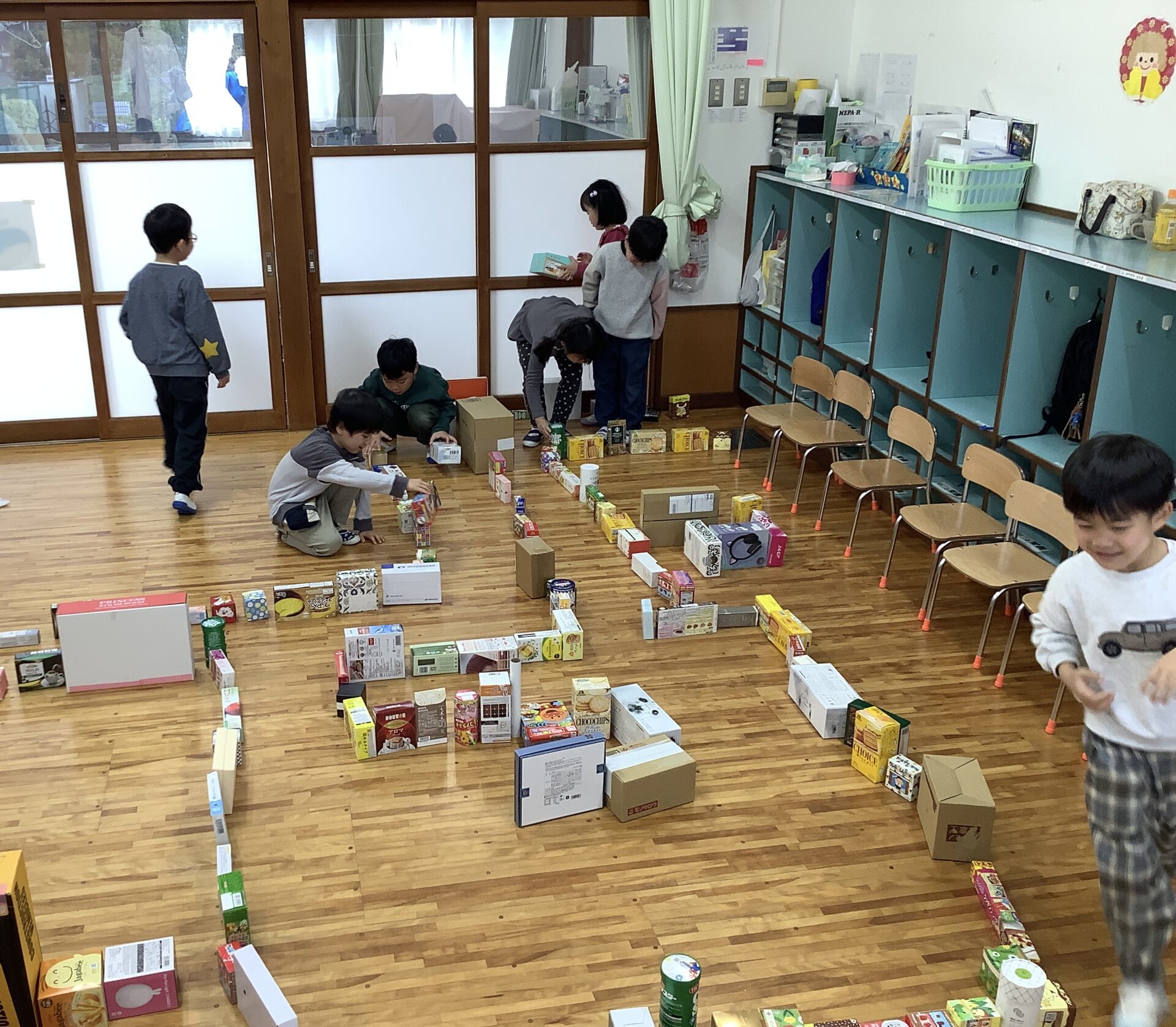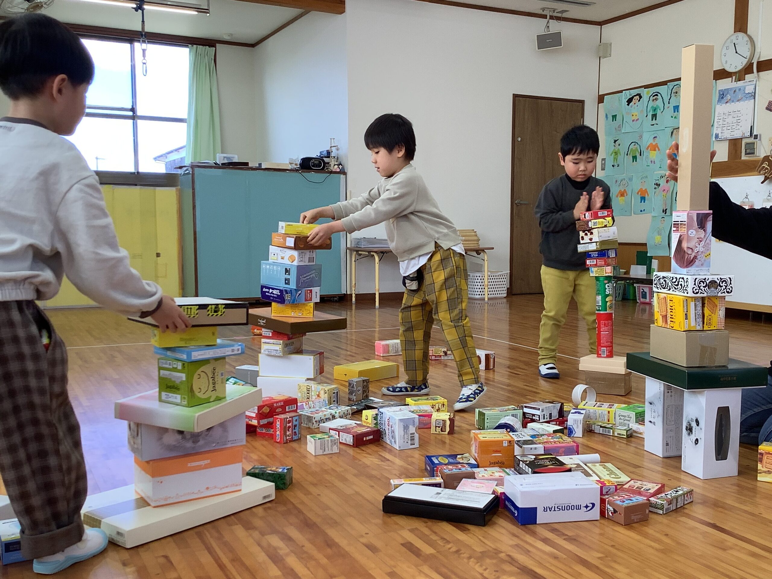 家庭から持ってきていただいた空き箱で積み積み遊びをして遊びました📦