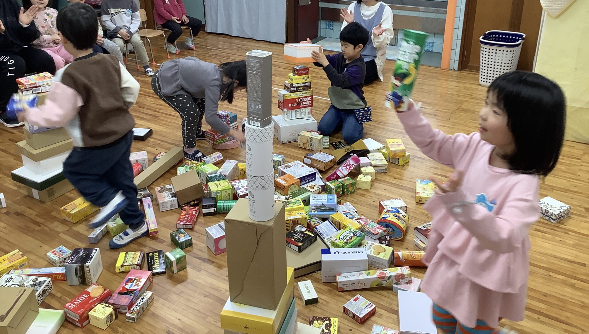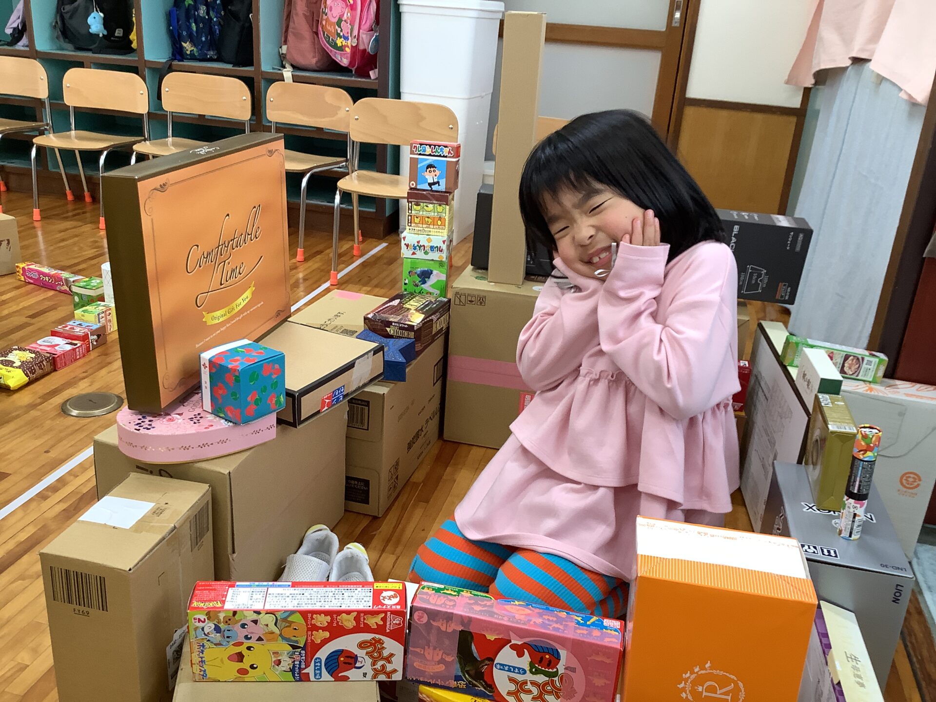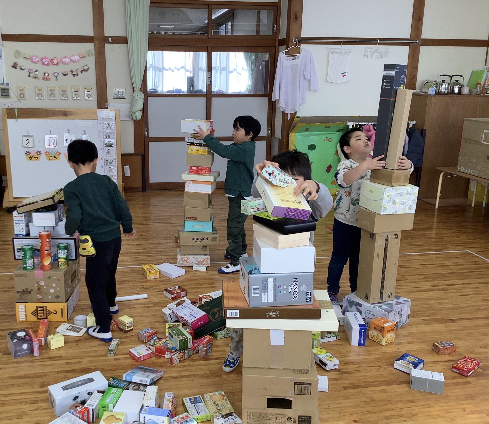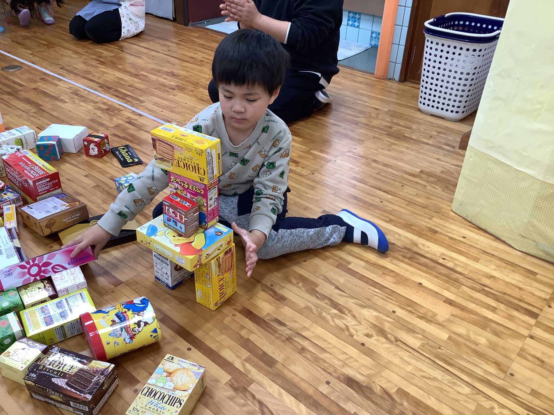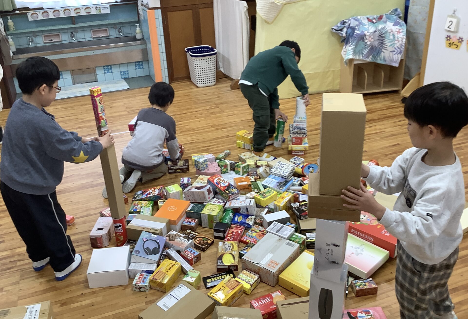 たくさん積み上げた後は、空き箱を自由に使って遊んでみることにしました!