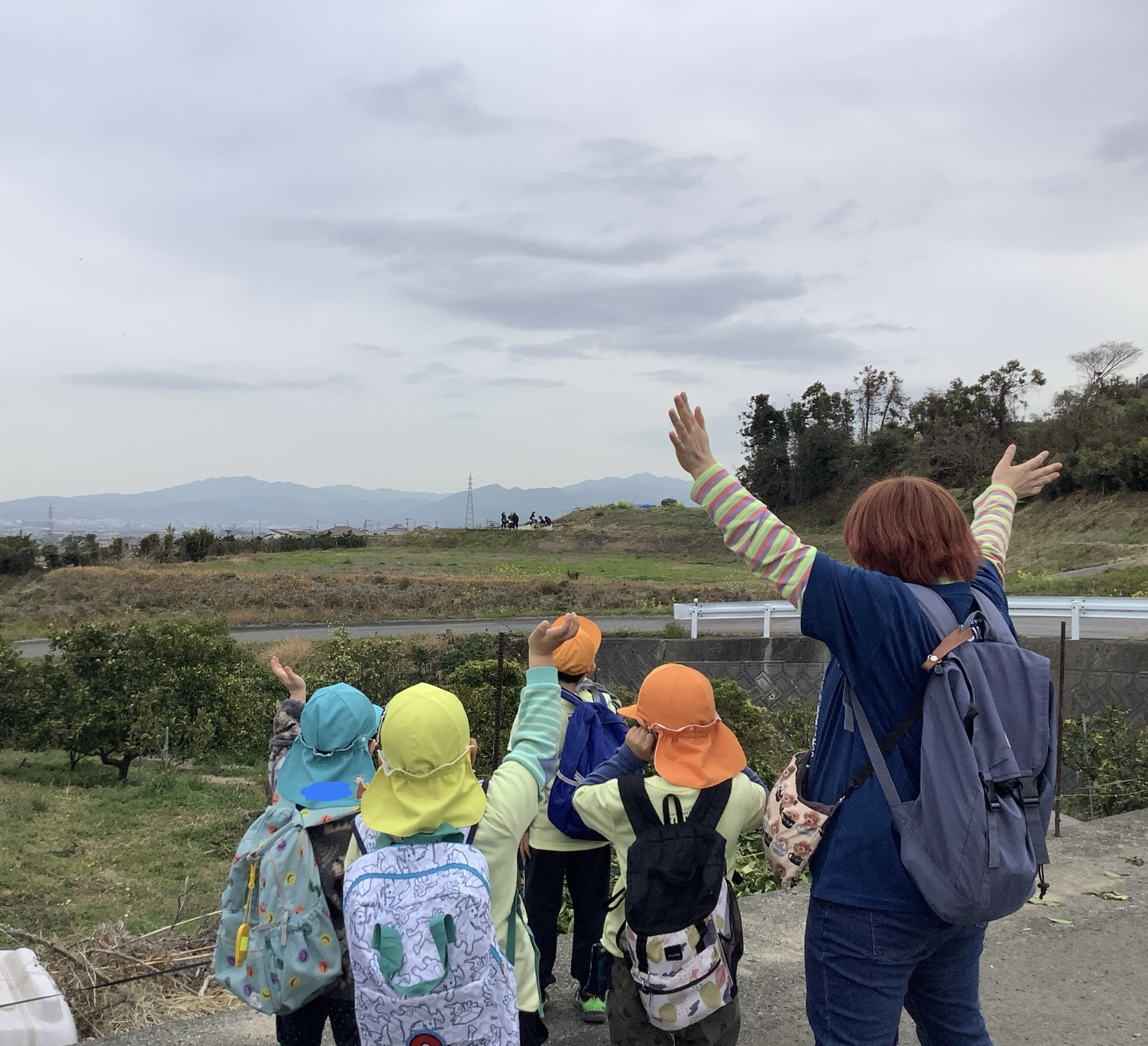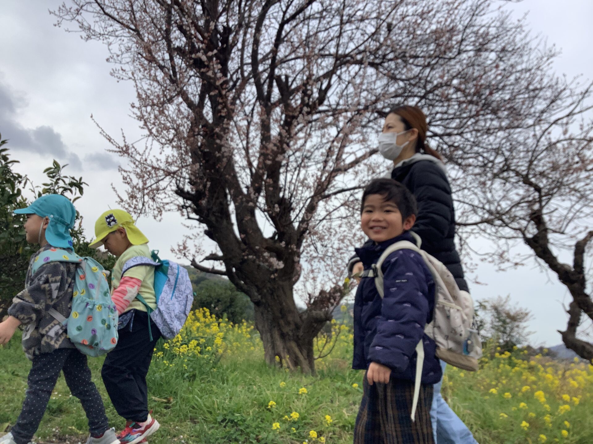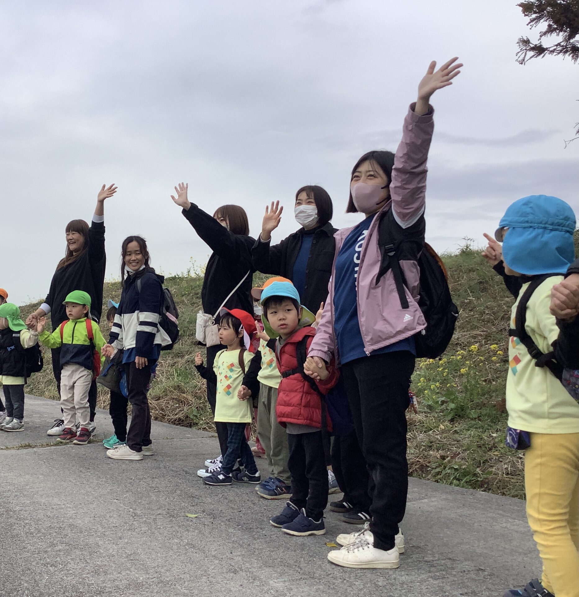 翌日、雲は多めですが時折雲の間から太陽も顔を出していたので、内容を変更して園周辺散策し戻ってホールでお別れ会をすることにしました☺️
