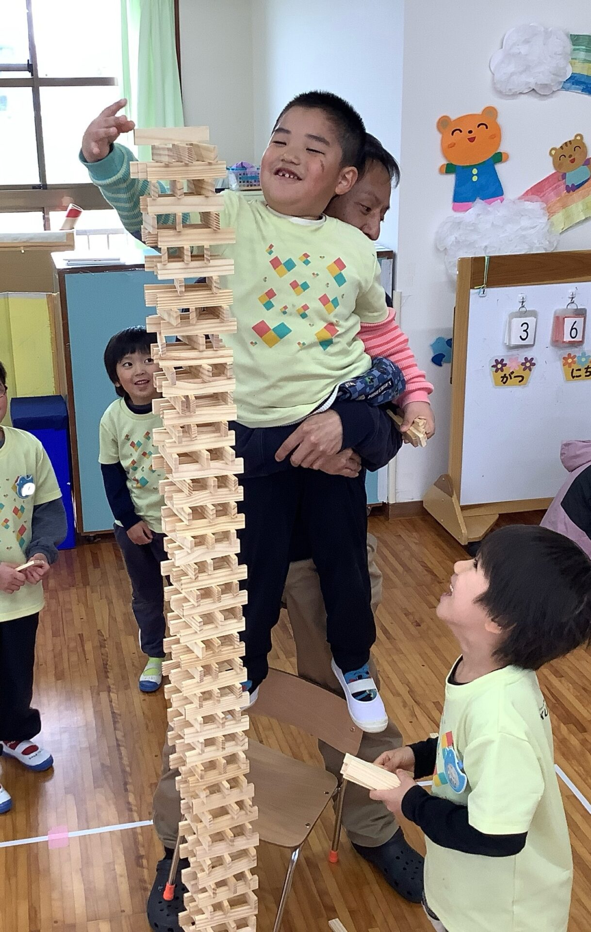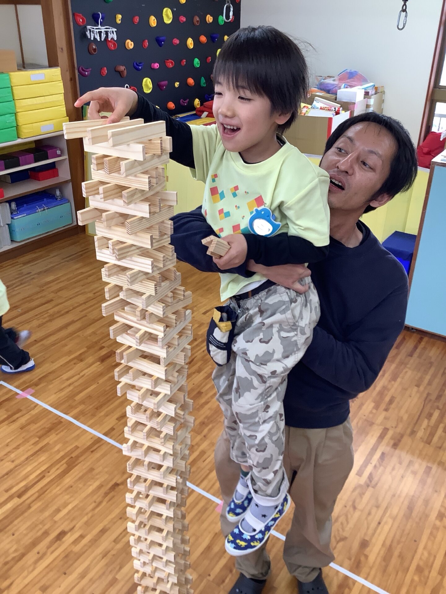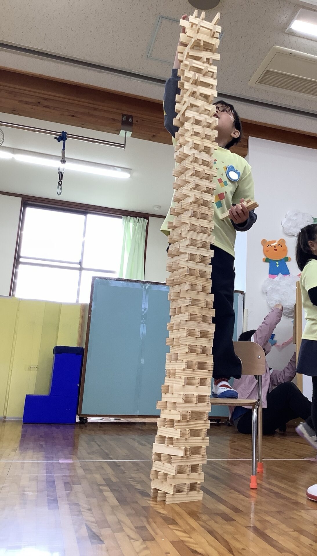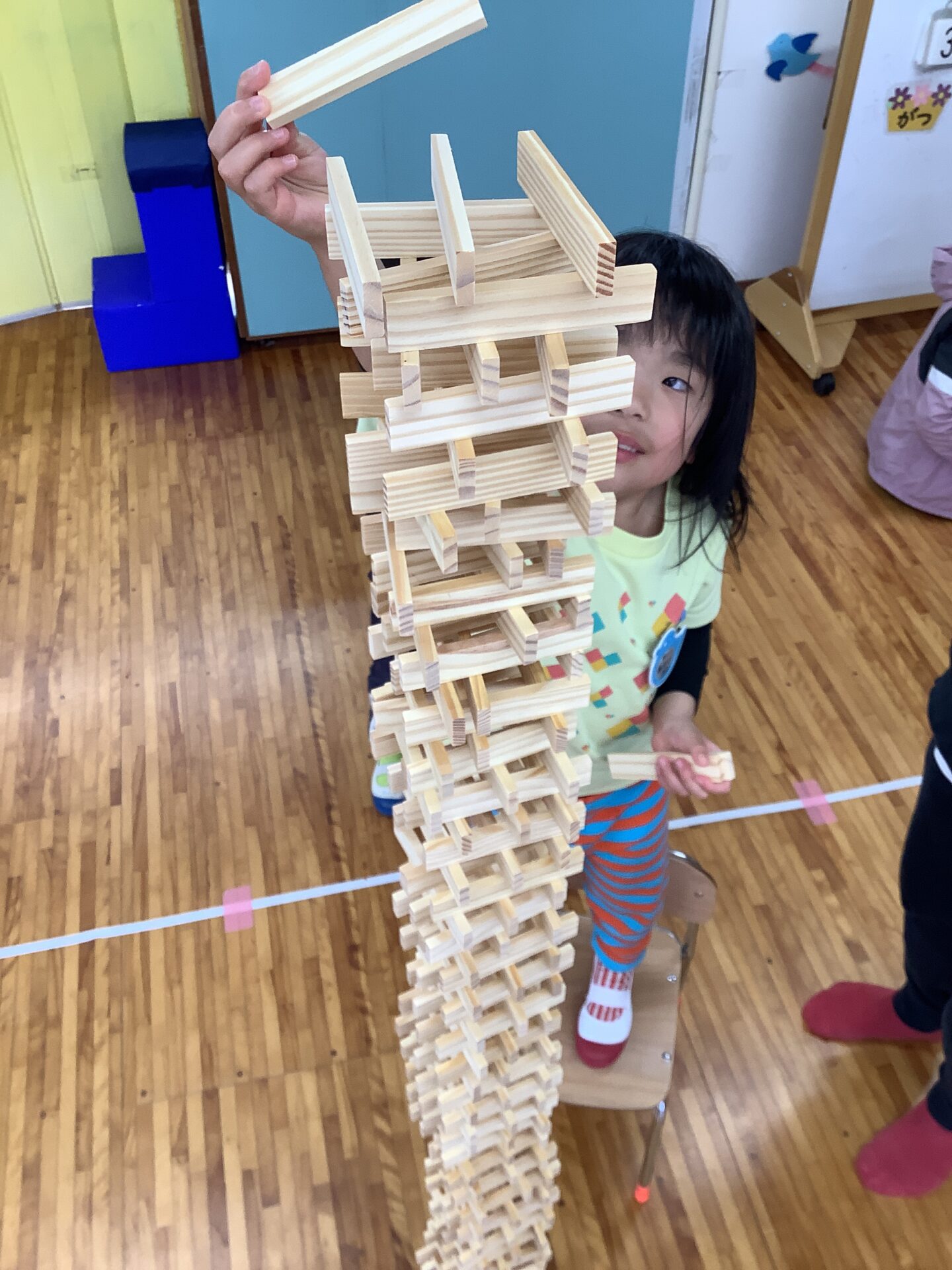 友だちと協力しながら、交互に積み重ね1m80㎝高さまで積み上げることができましたよ👏