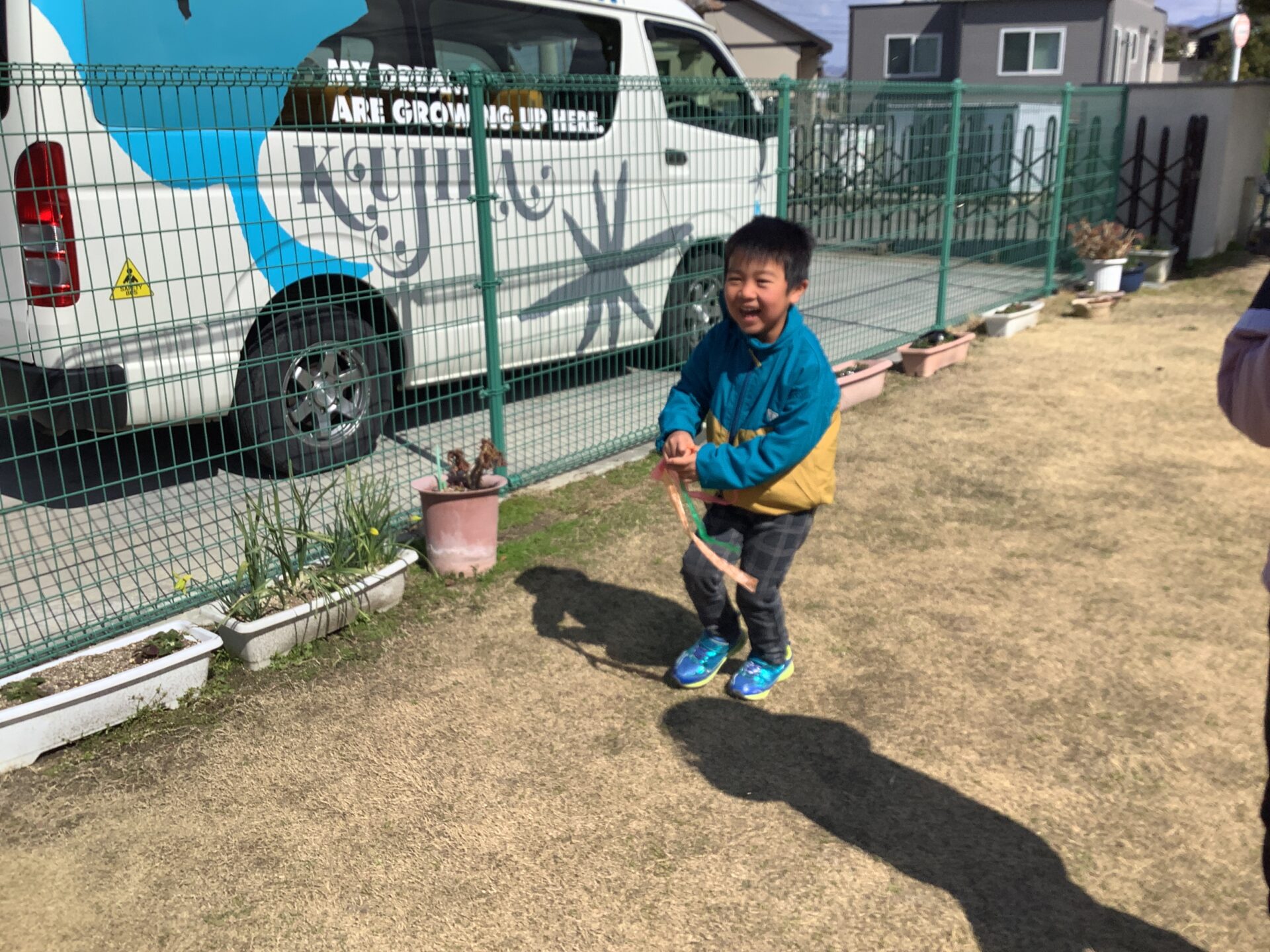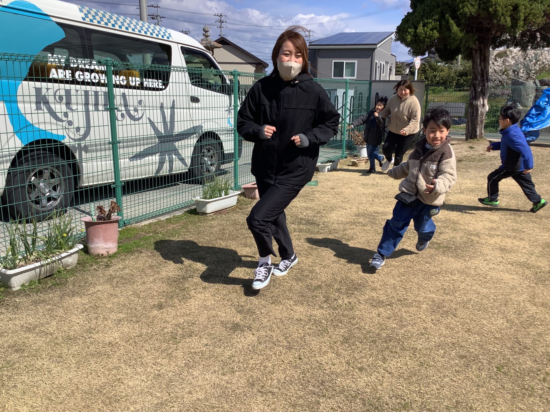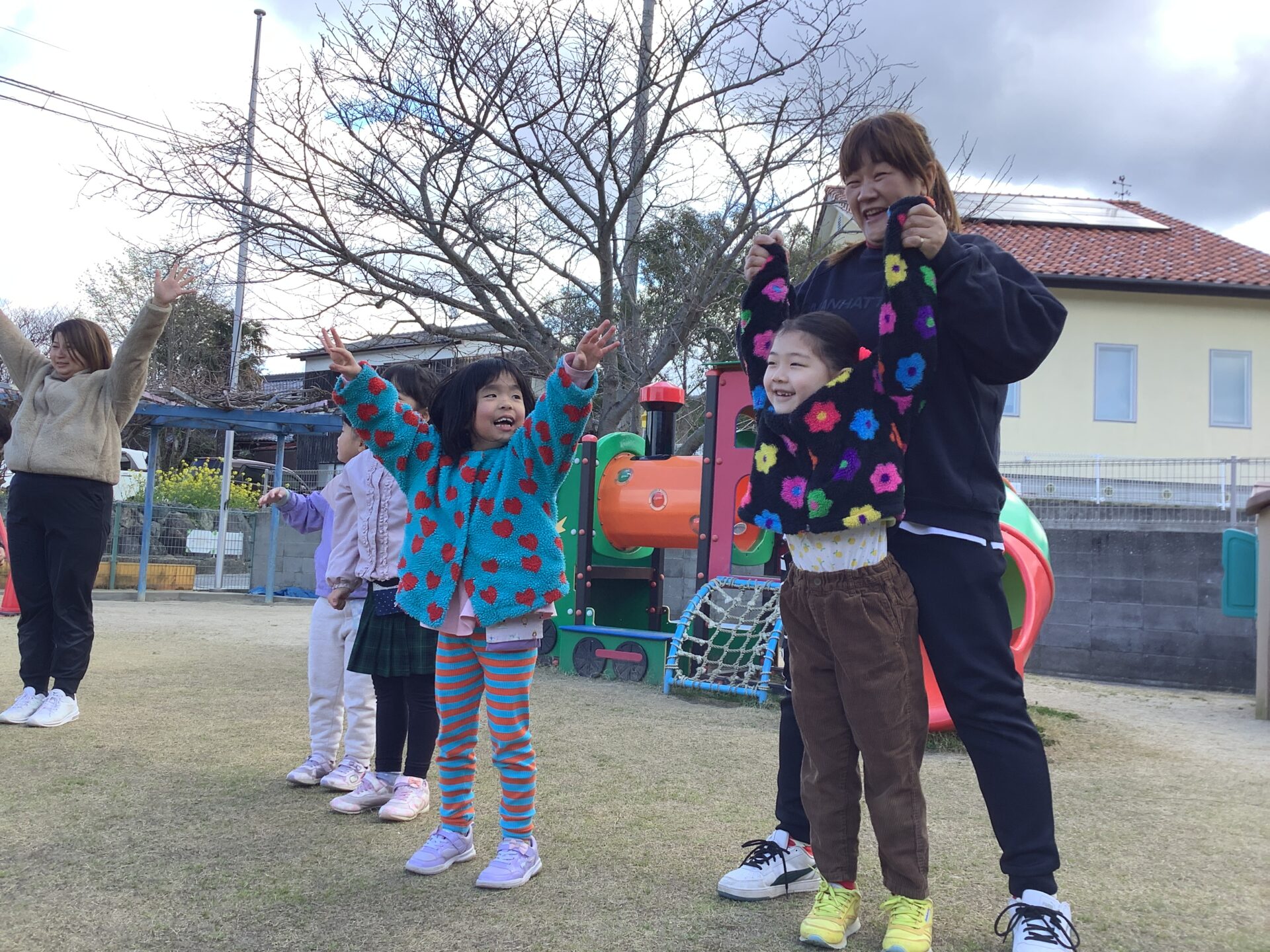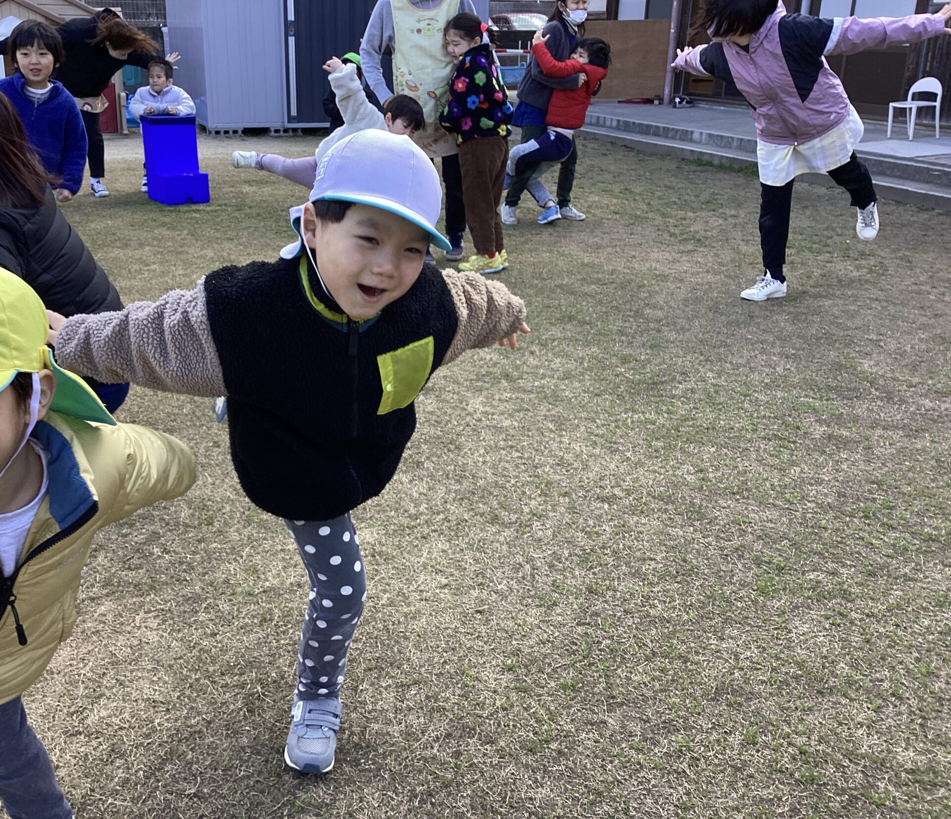 次に園庭で子どもたちが好きな『ゆめをかなえてどらえもん』の曲で体操をしました。
