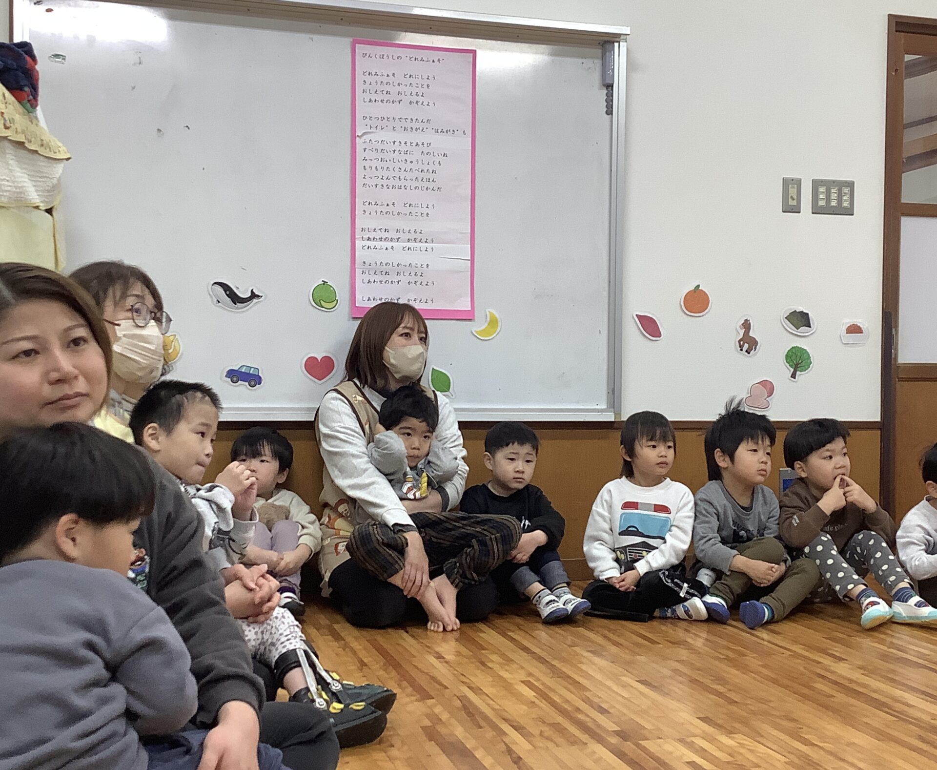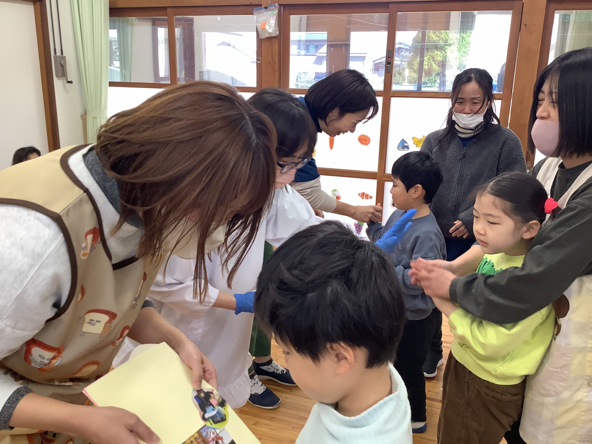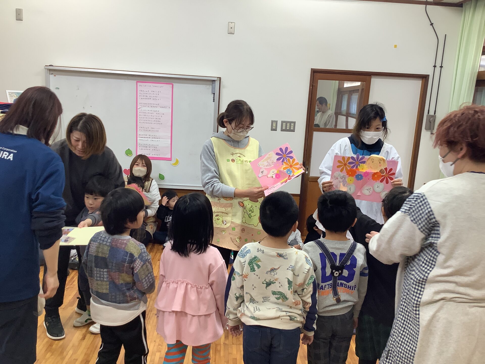 年長児の子どもたちが、「いっしょにあそんでくれてありがとう」と気持ちを伝え、その後、歌のプレゼントがありました。ジーン😢と感動しているところに、年中、年少児の先生たちへの思いがけない贈り物がありました。子どもたちの成長を感じ、心がほっこりあたたかくなるひとときとなりました。