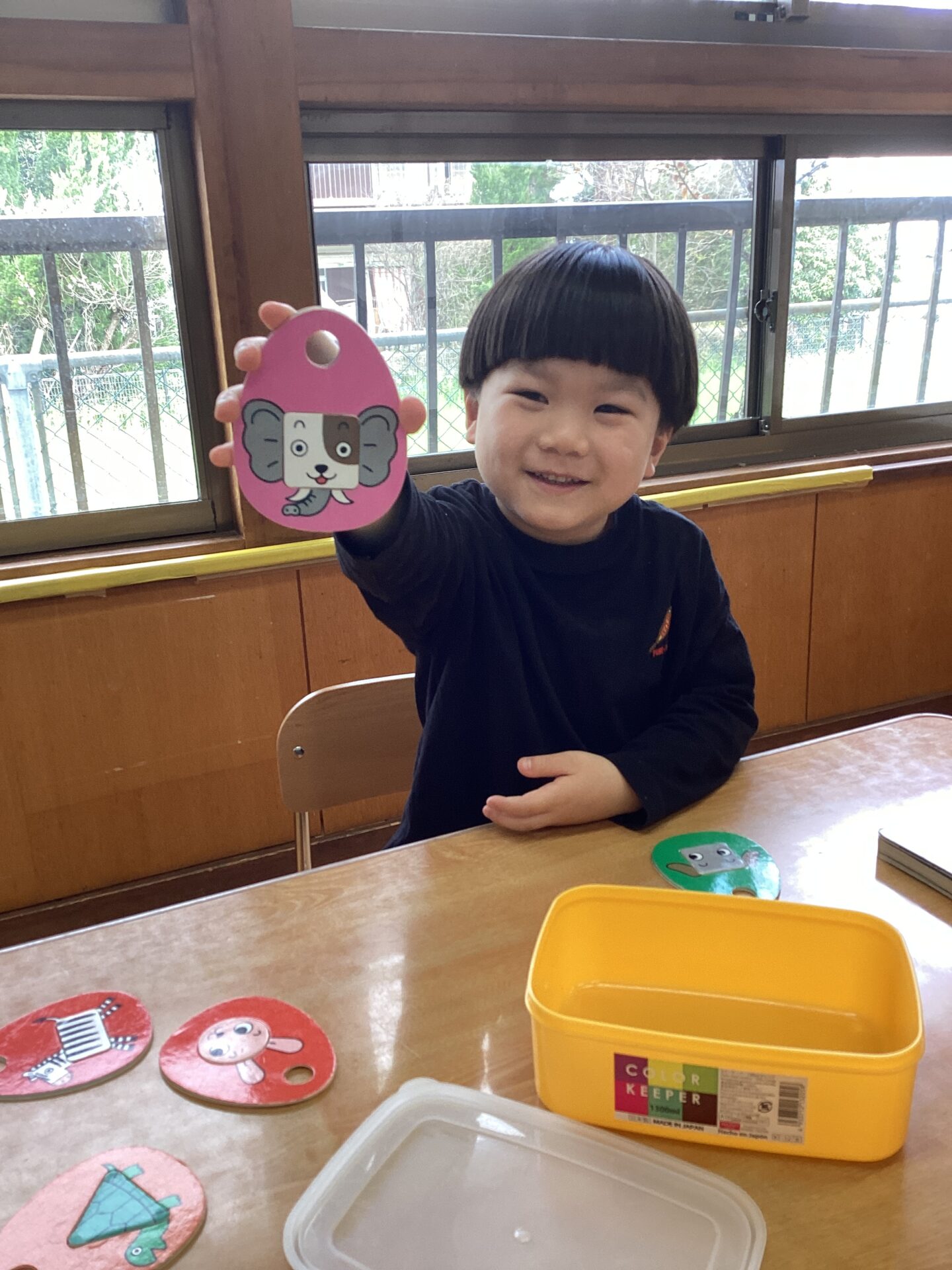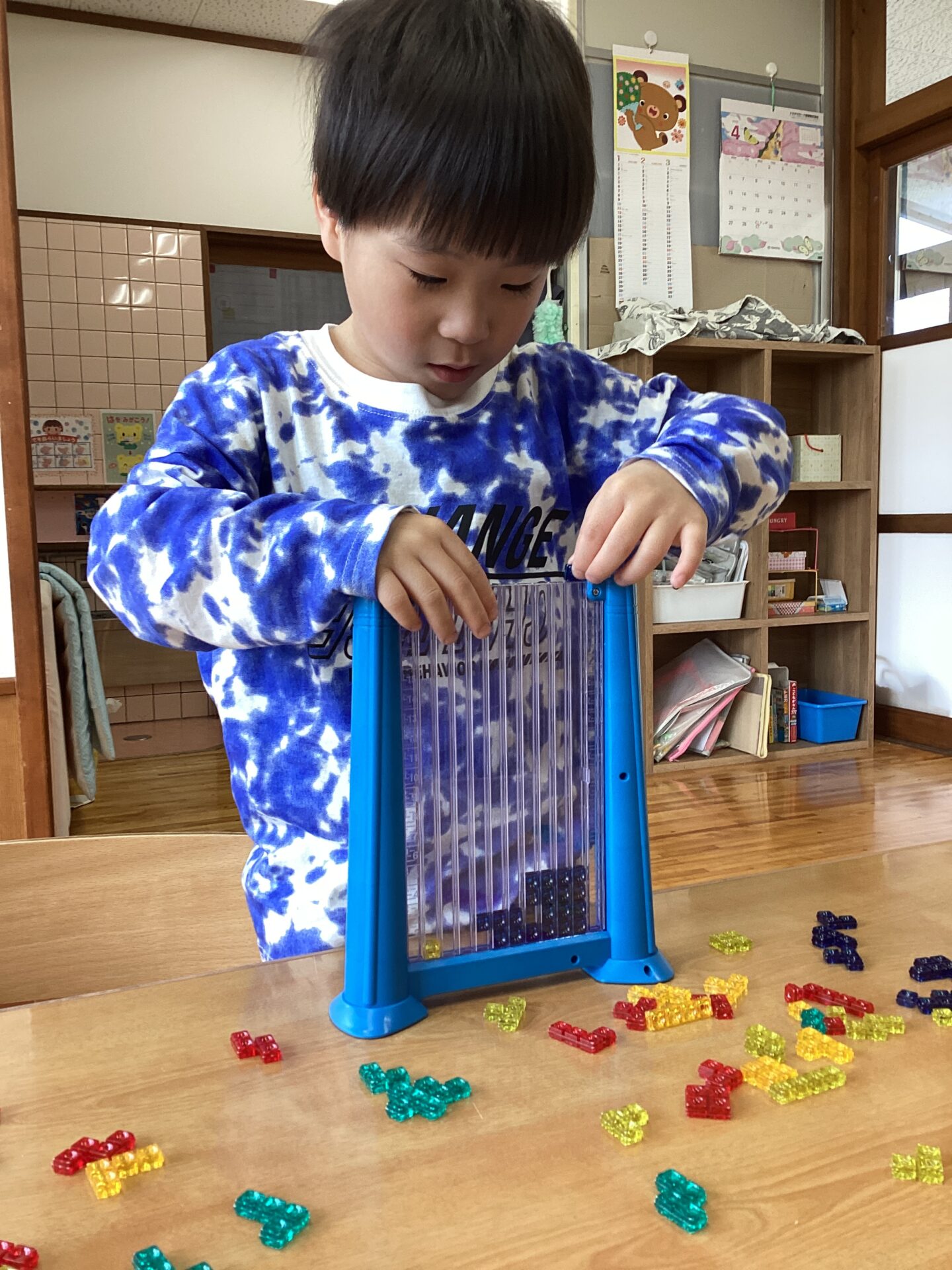 面白い顔を作ったりテトリスをしたりして、新たなおもちゃで遊び朝の時間(活動開始前)を過ごせていますよ。