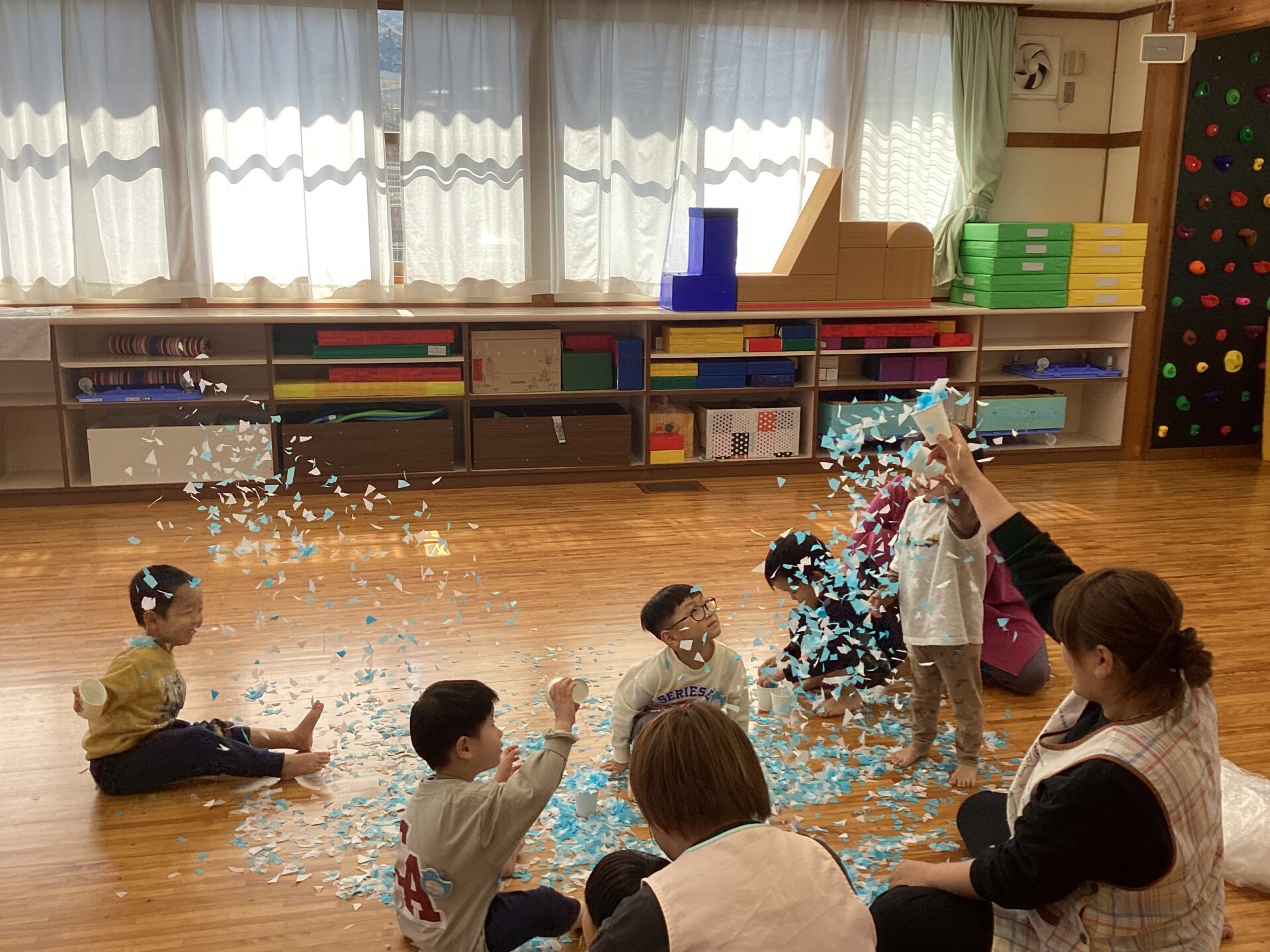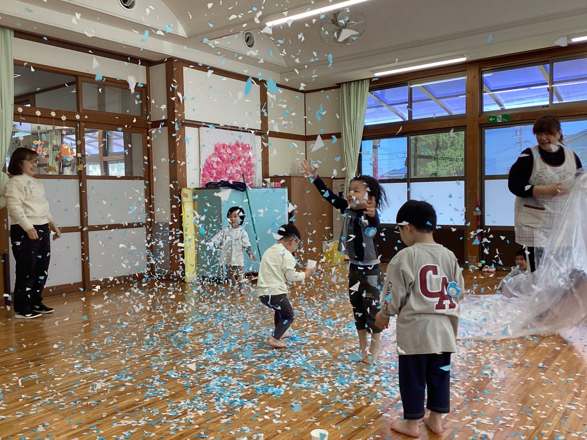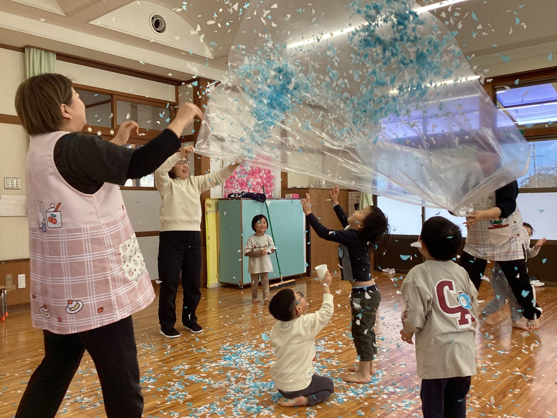 紙コップに入れて、先生や、お友だちにかけあいこ😆先生たちも紙吹雪まみれに(笑)