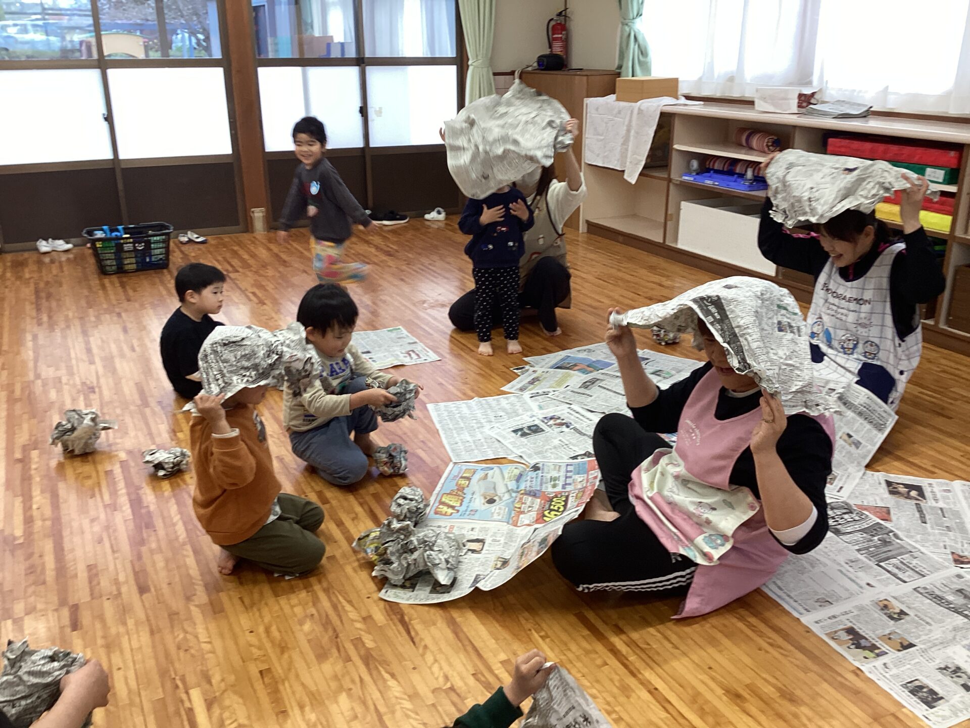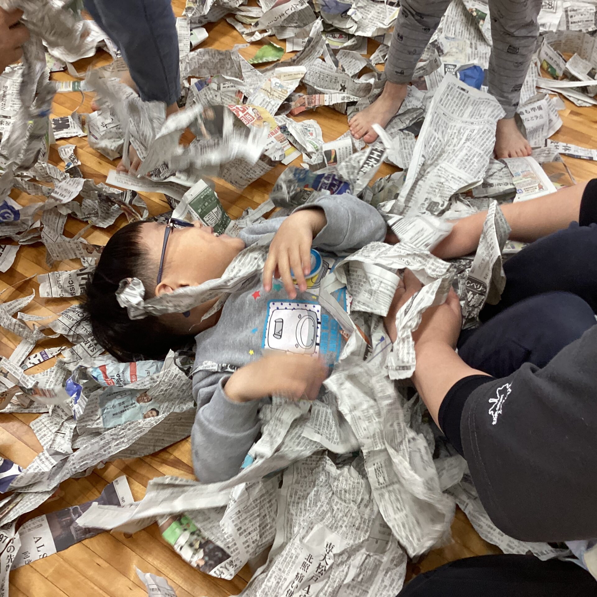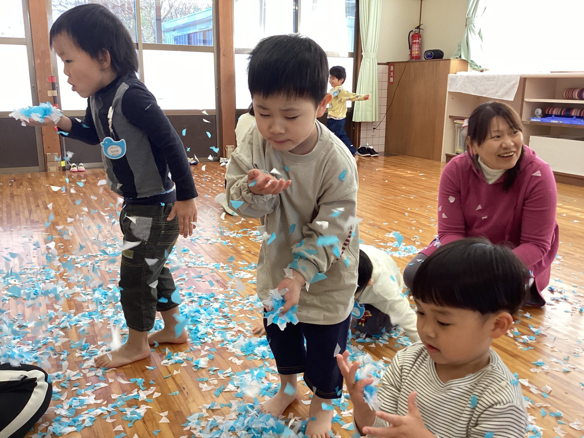 紙コップに入れて、先生や、お友だちにかけあいこ😆先生たちも紙吹雪まみれに(笑)