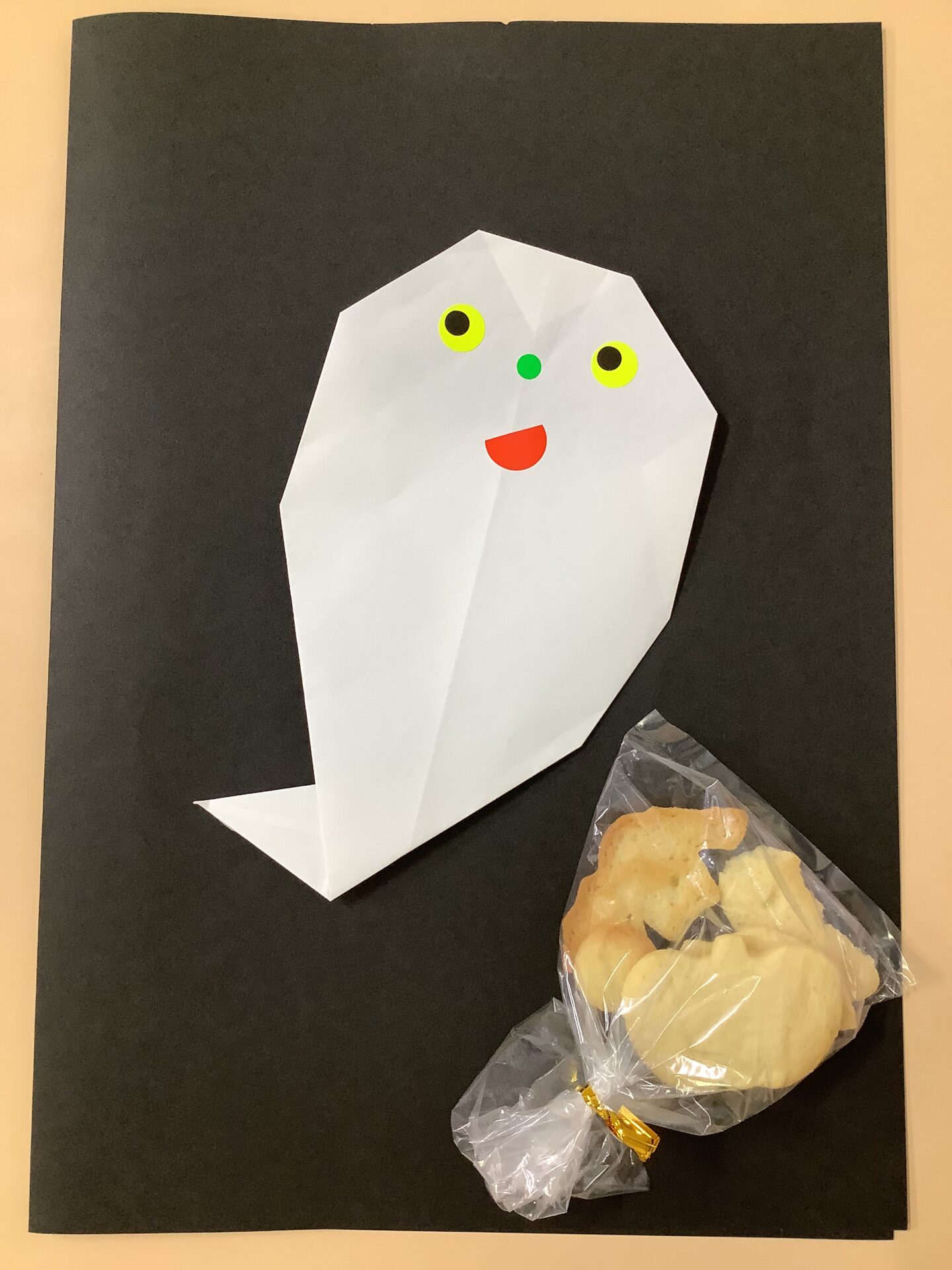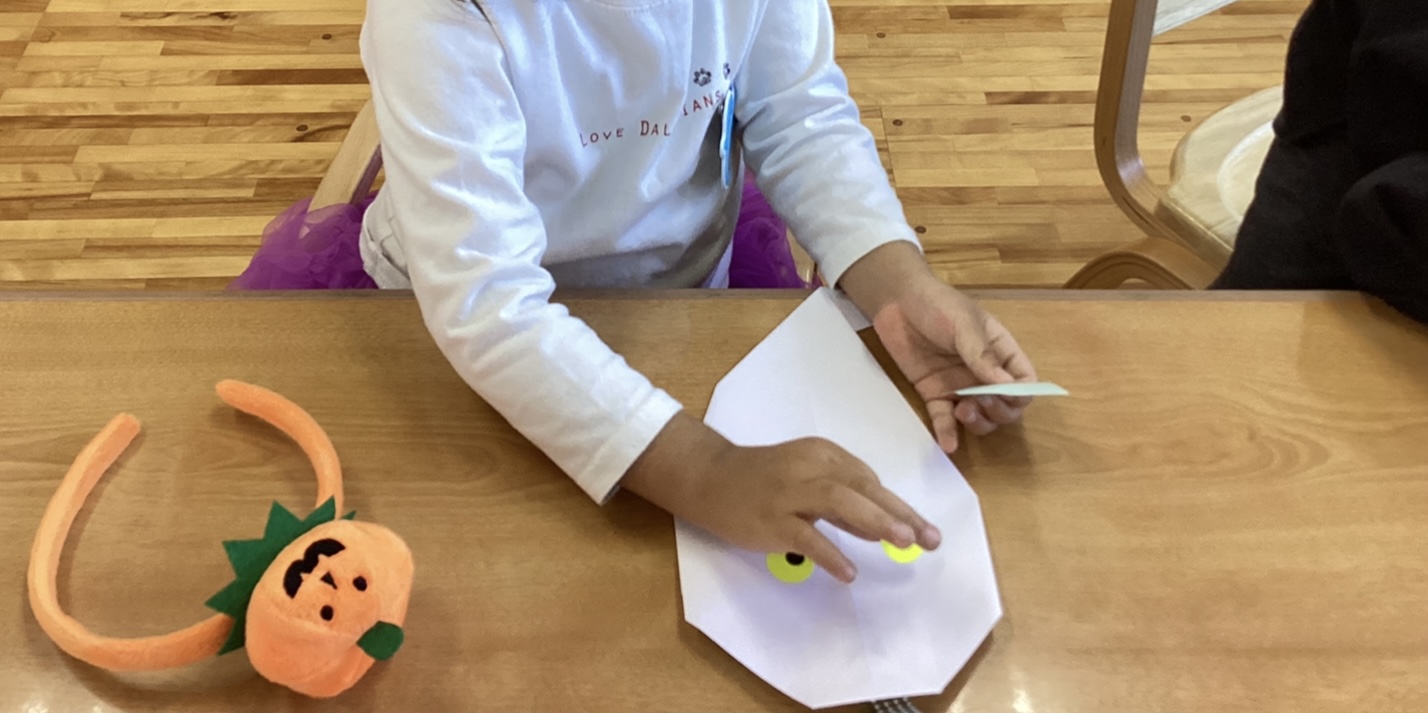 お化けたちが飾られているお部屋で、お菓子を入れる袋の制作をして、活動の振り返りや余韻を味わえるようにしました。