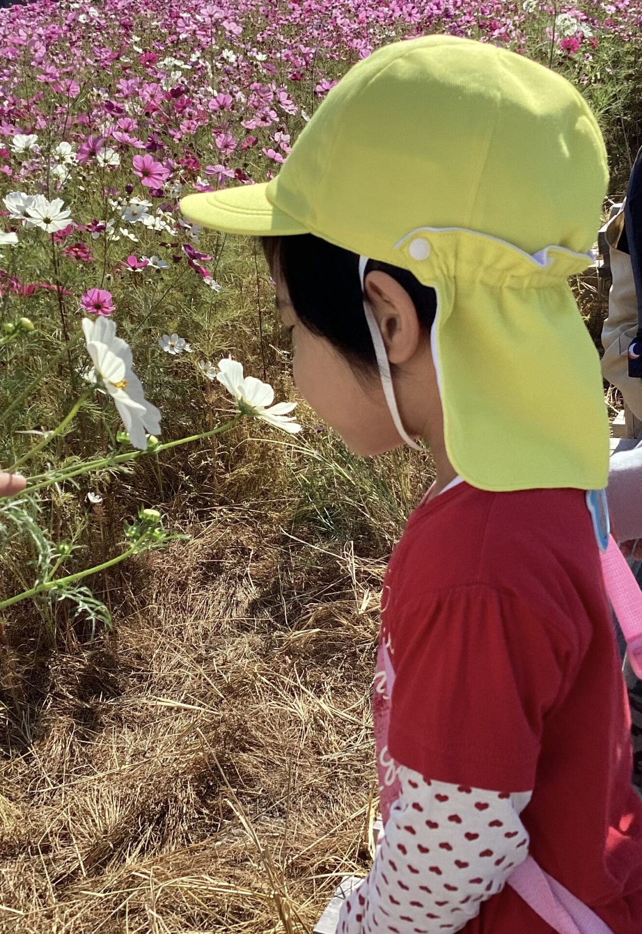 コスモスにそっと手を伸ばして、「くんくん」と香りをかいだり、