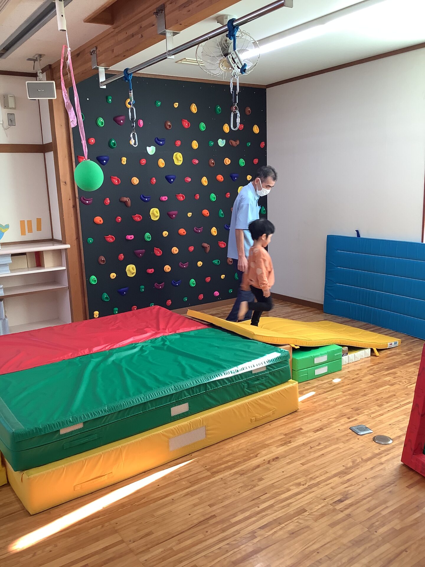 日々の活動で柔らかいクッションの上を歩いたり走ったりしていると、ジャンプもうまくなってきています。また、坂道くだりも足腰をしっかりと伸ばすトレーニングになります。