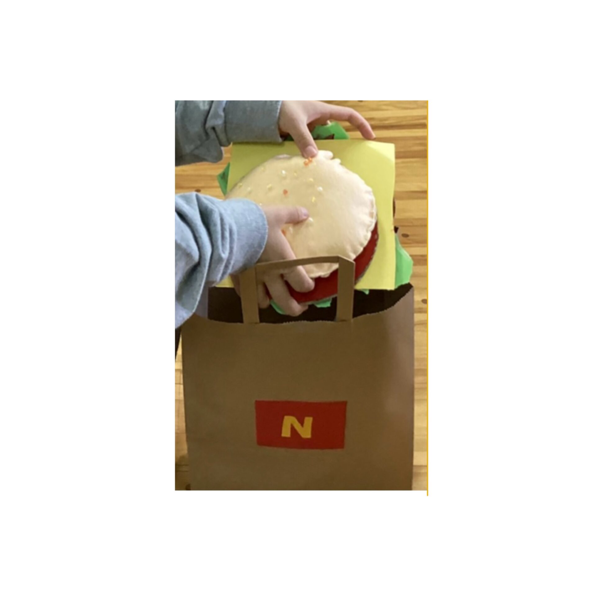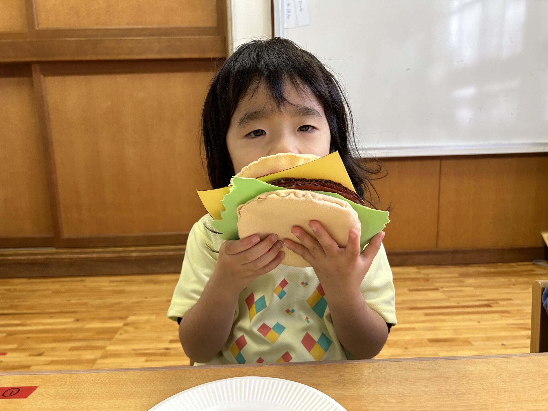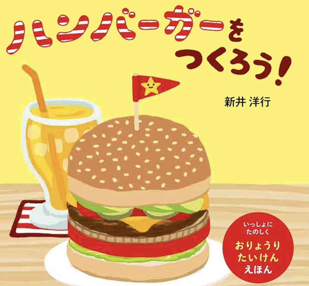 できあがったハンバーガー🍔「おいしそう!」「あーん、ぱく」と