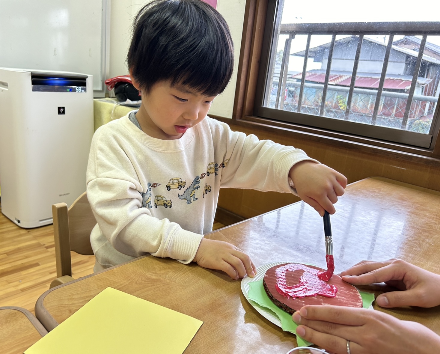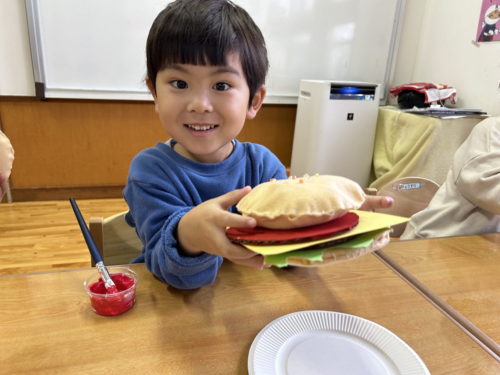 制作する中で、はさみで切ること、ボンドを塗ること、絵の具など
