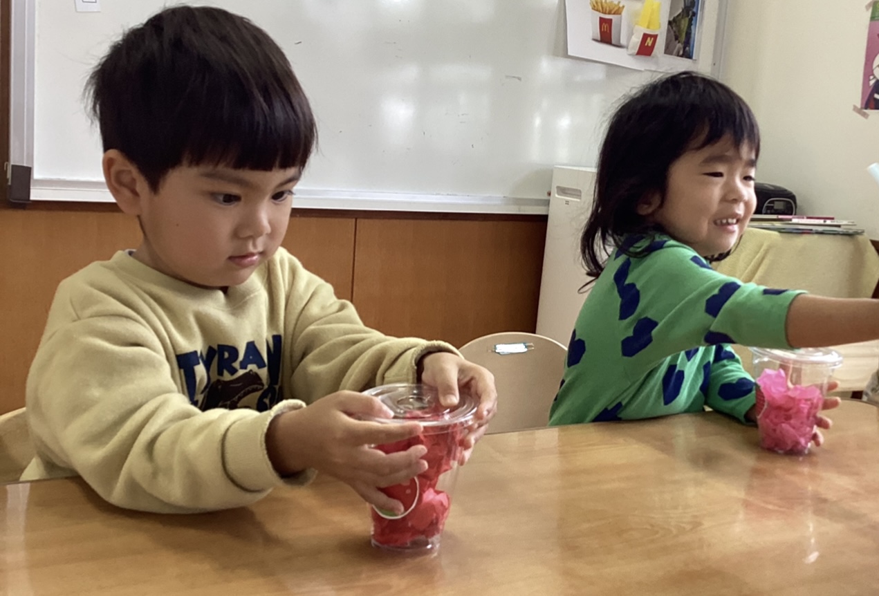 (↑花紙を丸めて、カップに入れてジュース作り。)