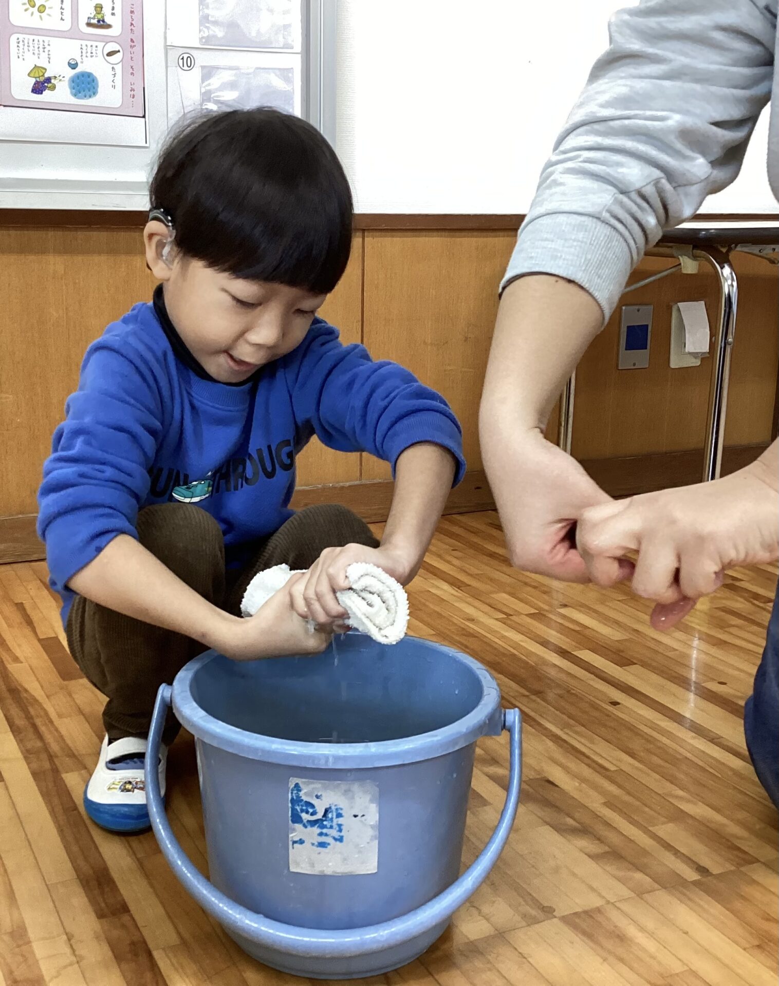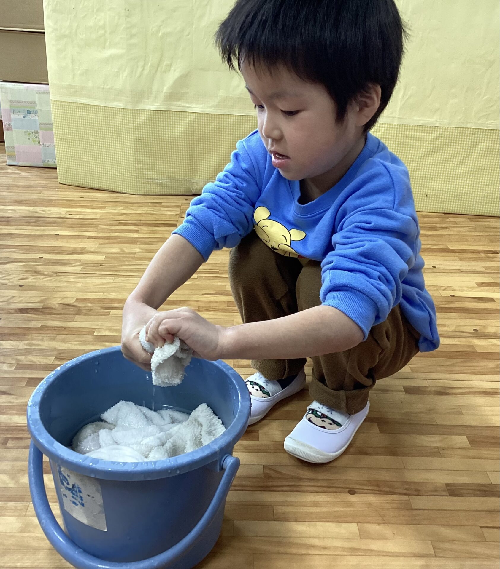 「お掃除頑張ったら、お外でいっぱい遊べるよ」と伝えると変更の提案にも関わらず、やる気十分!