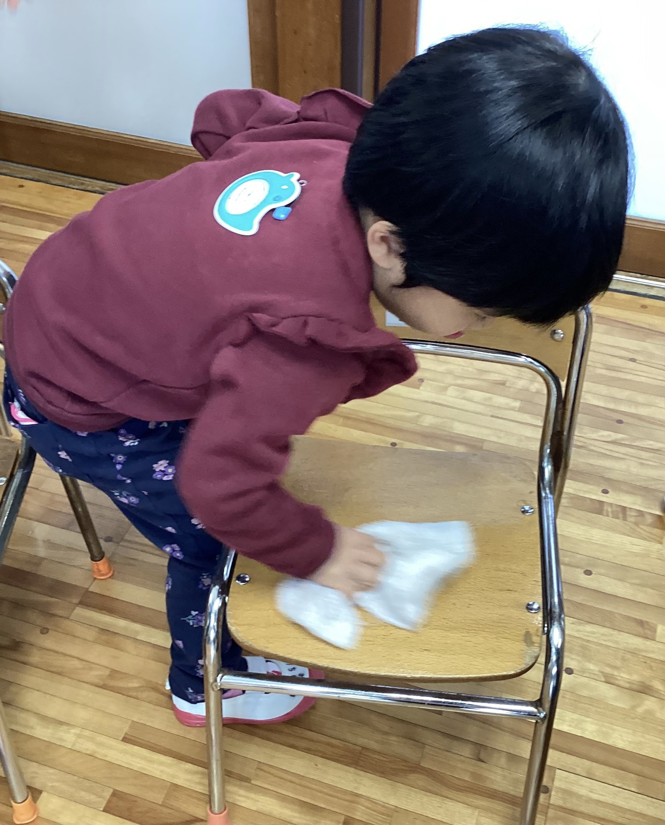 その他にも、みんなが歩く廊下やロッカー、椅子なども拭きました。