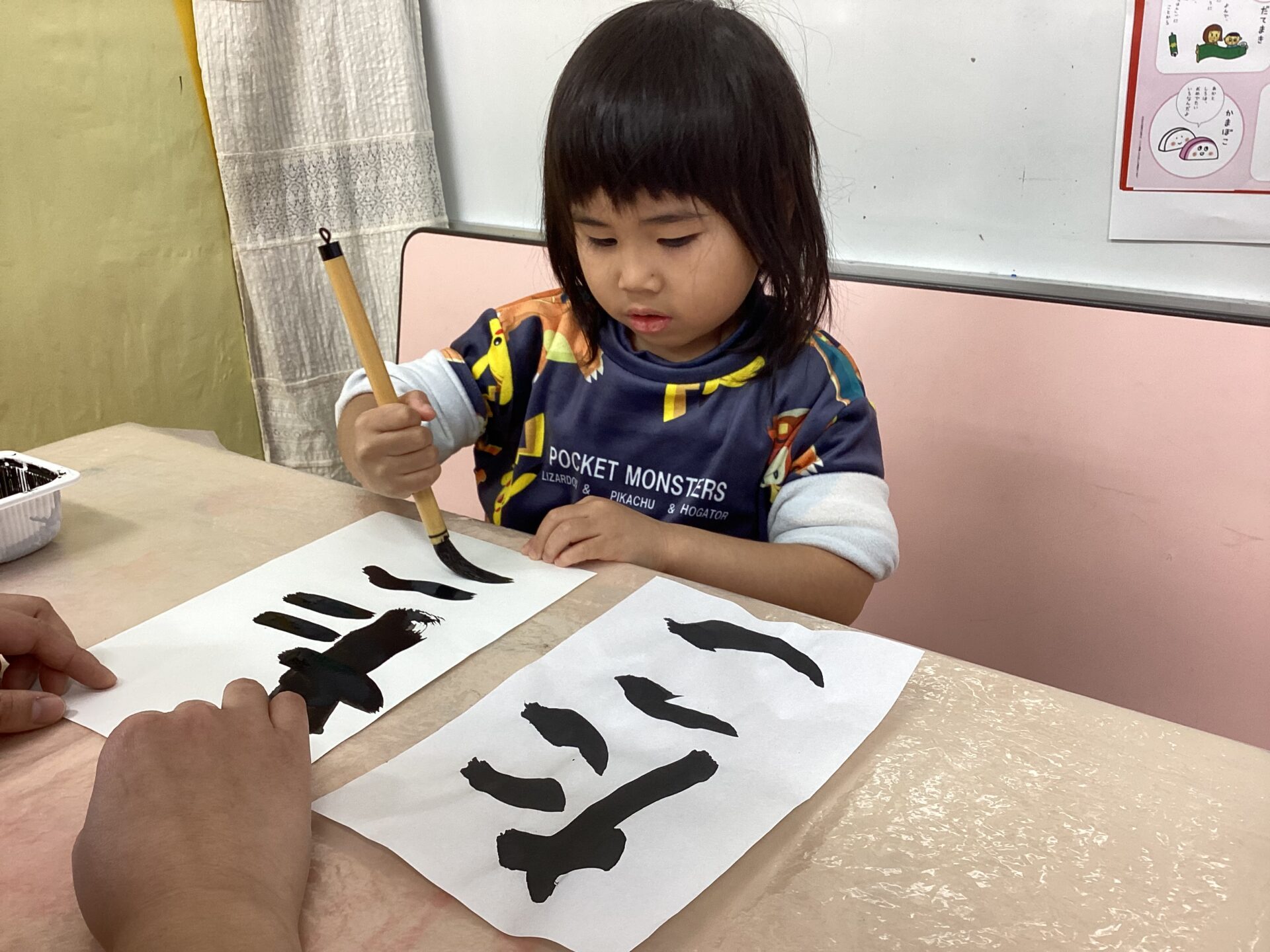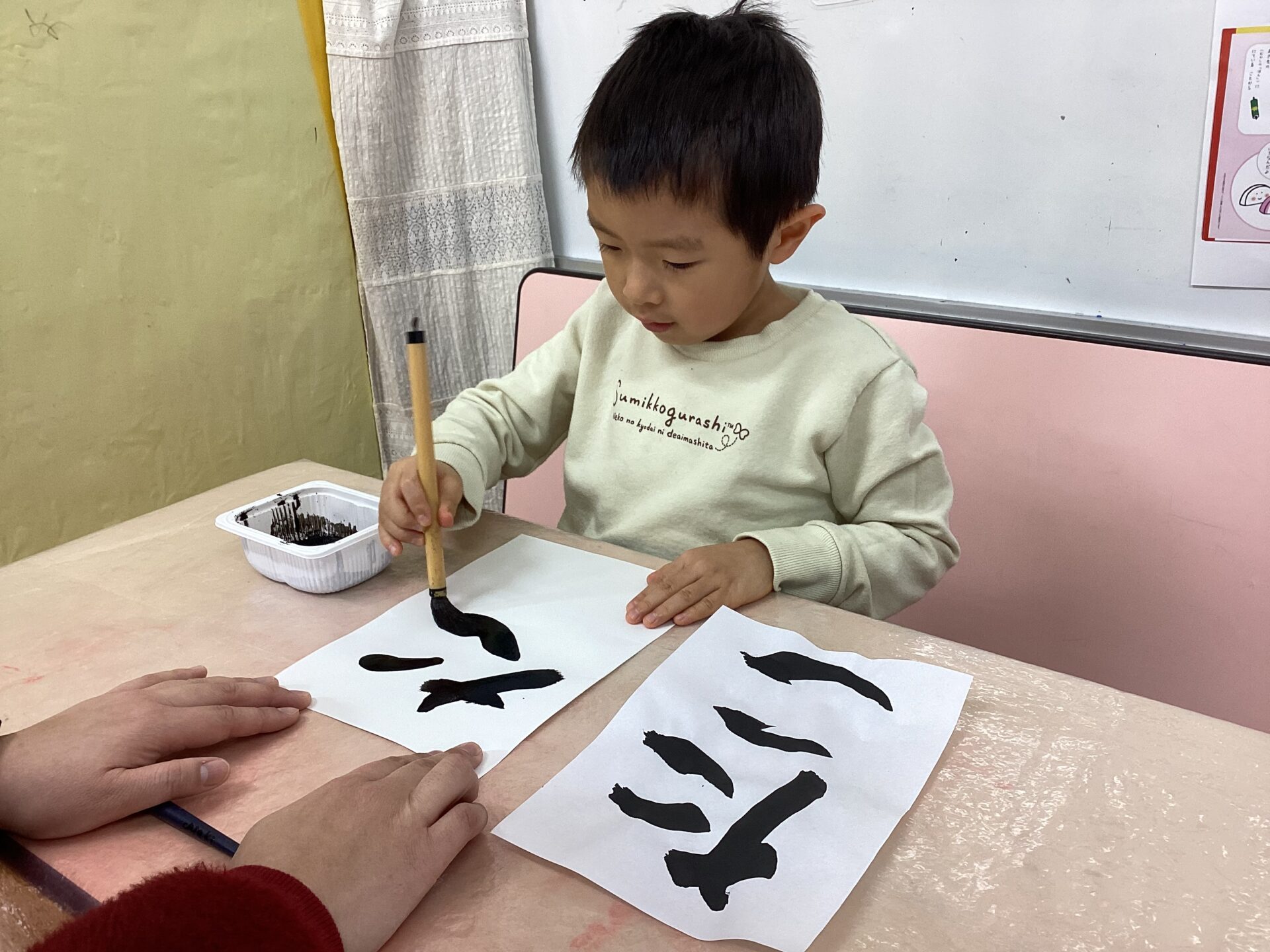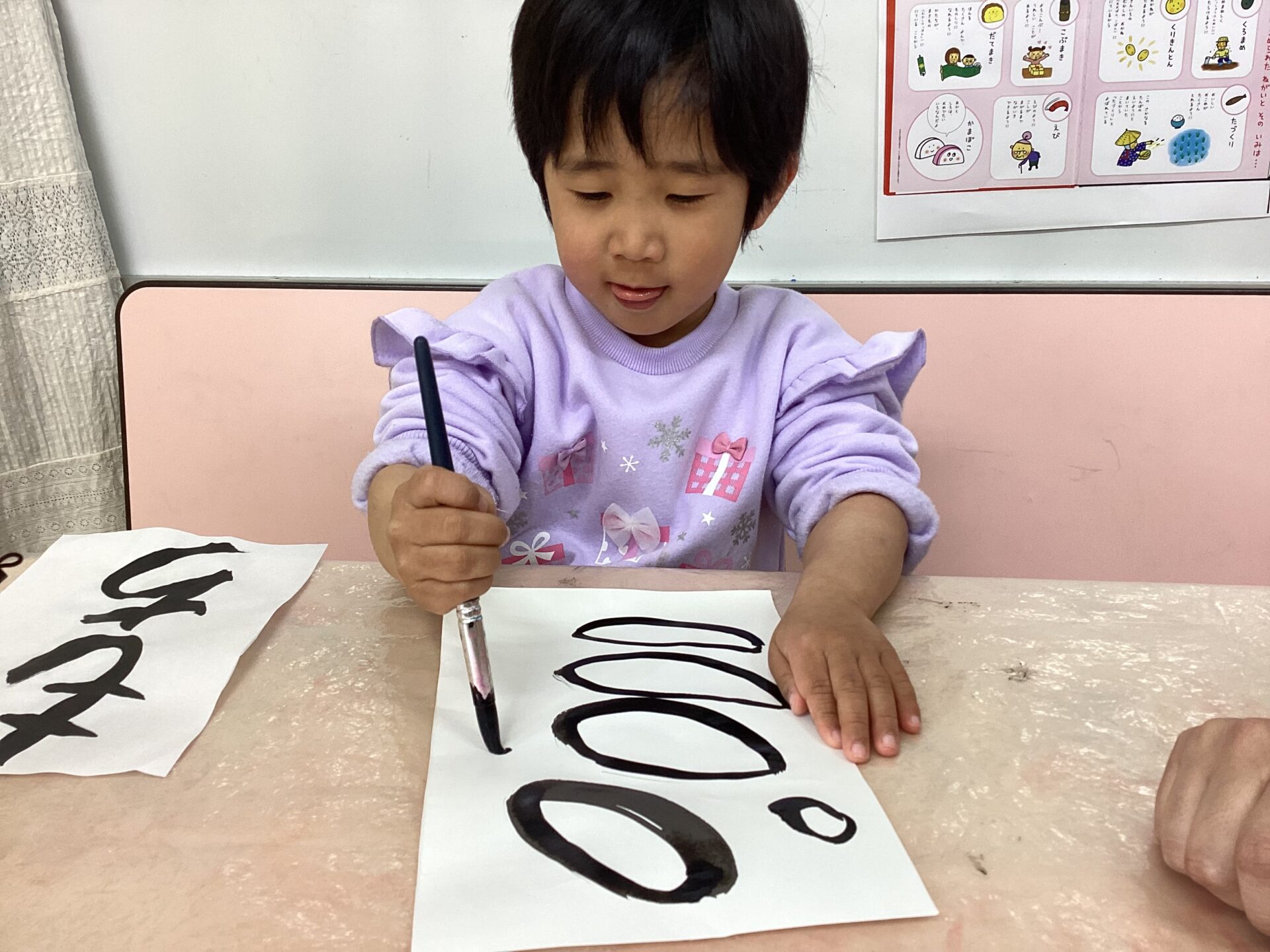 筆と墨汁を使って、勢いよく書き初めをしています。