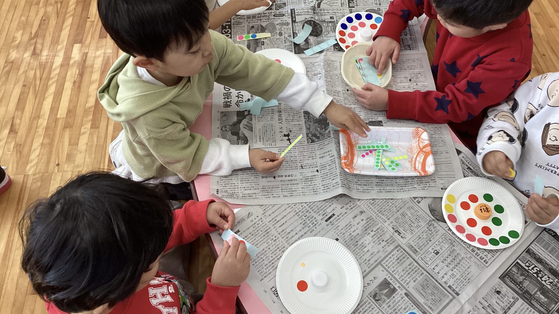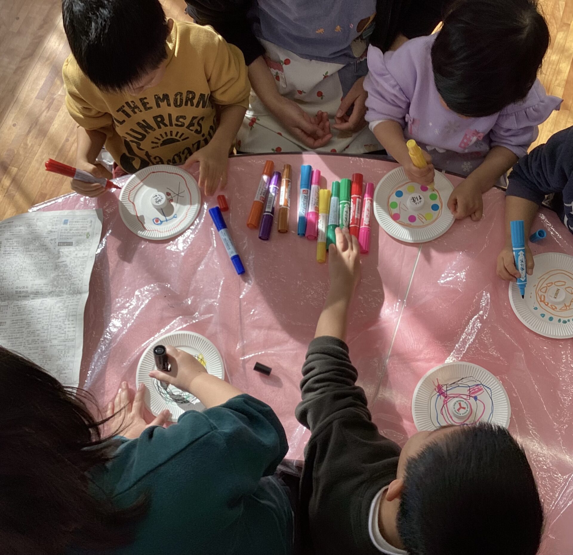 紙皿にシールを貼ったり、お絵描きをしたりして