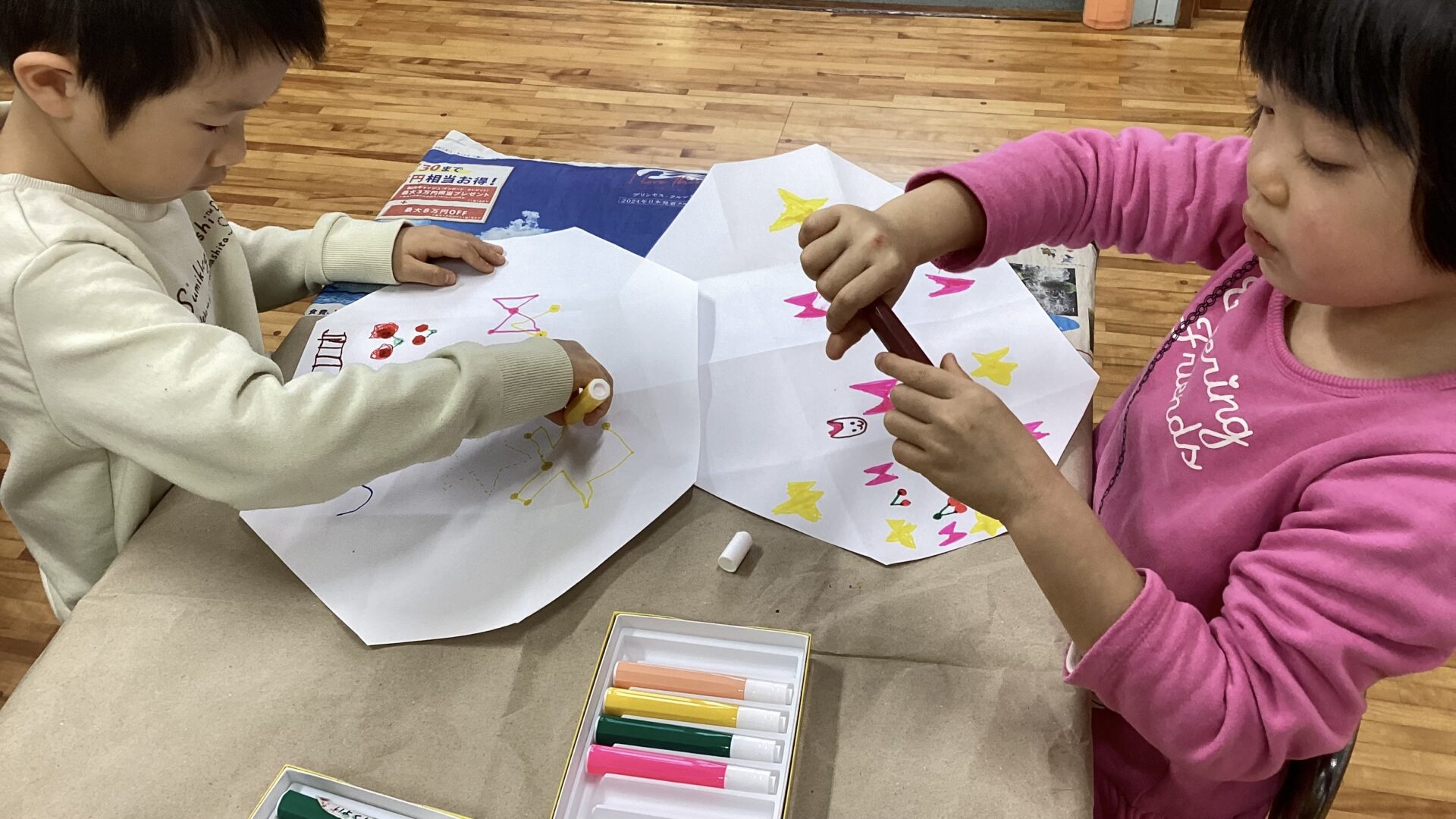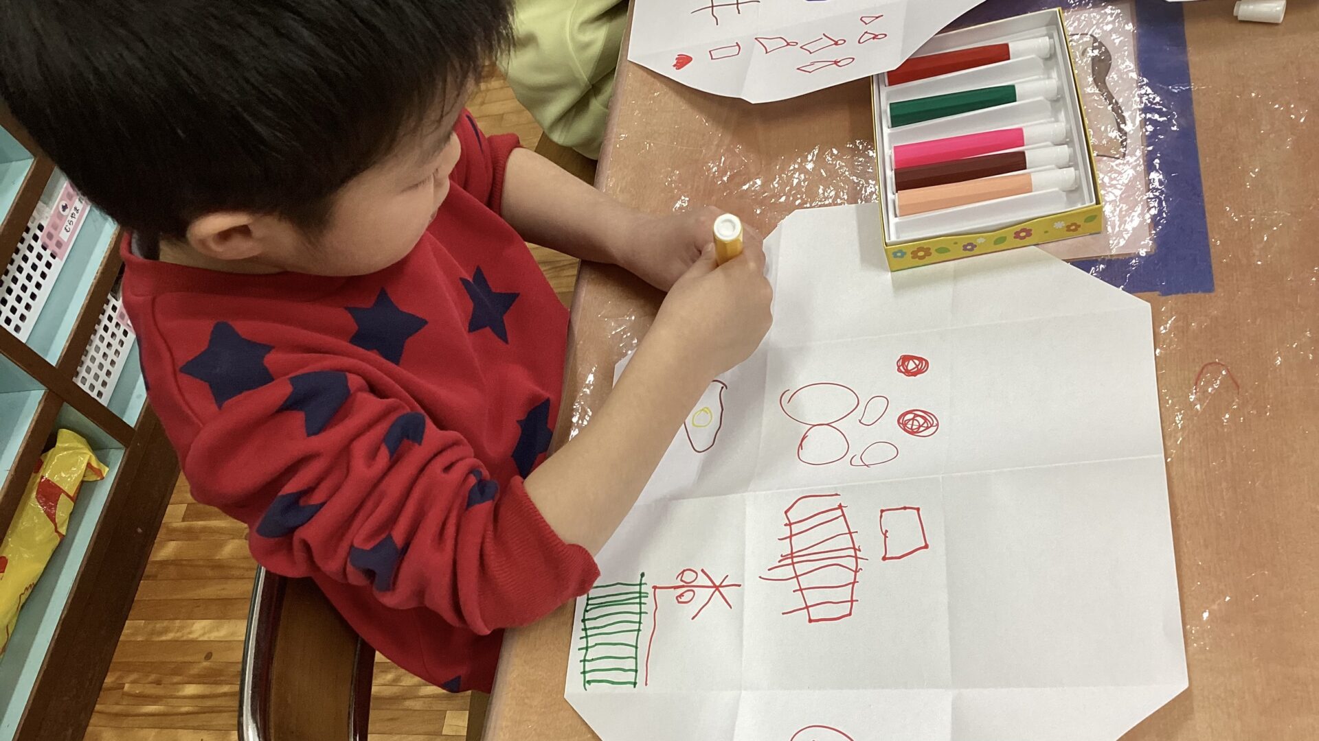 用紙にお絵描きをして、オンリーワンの凧を作りました。