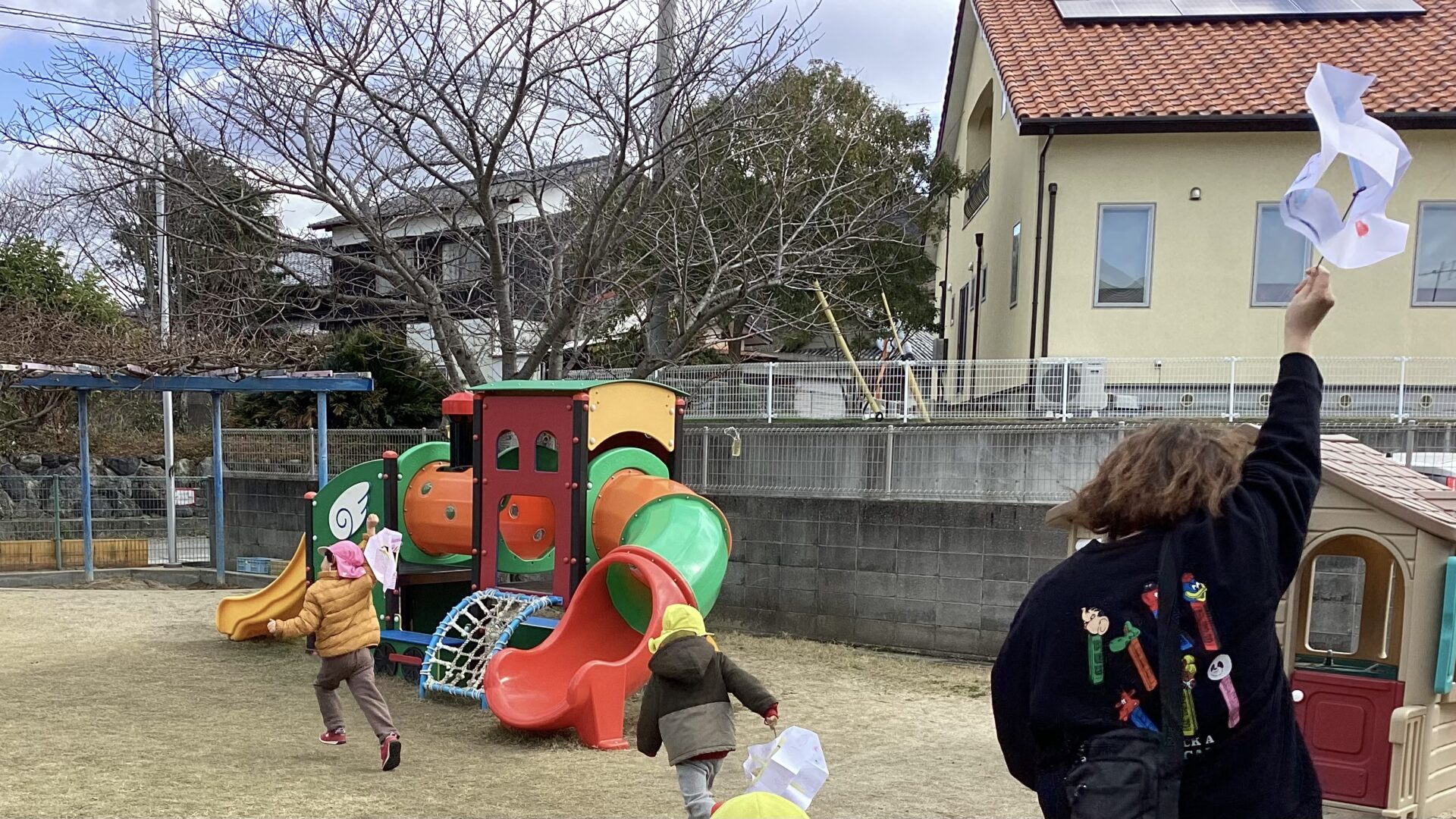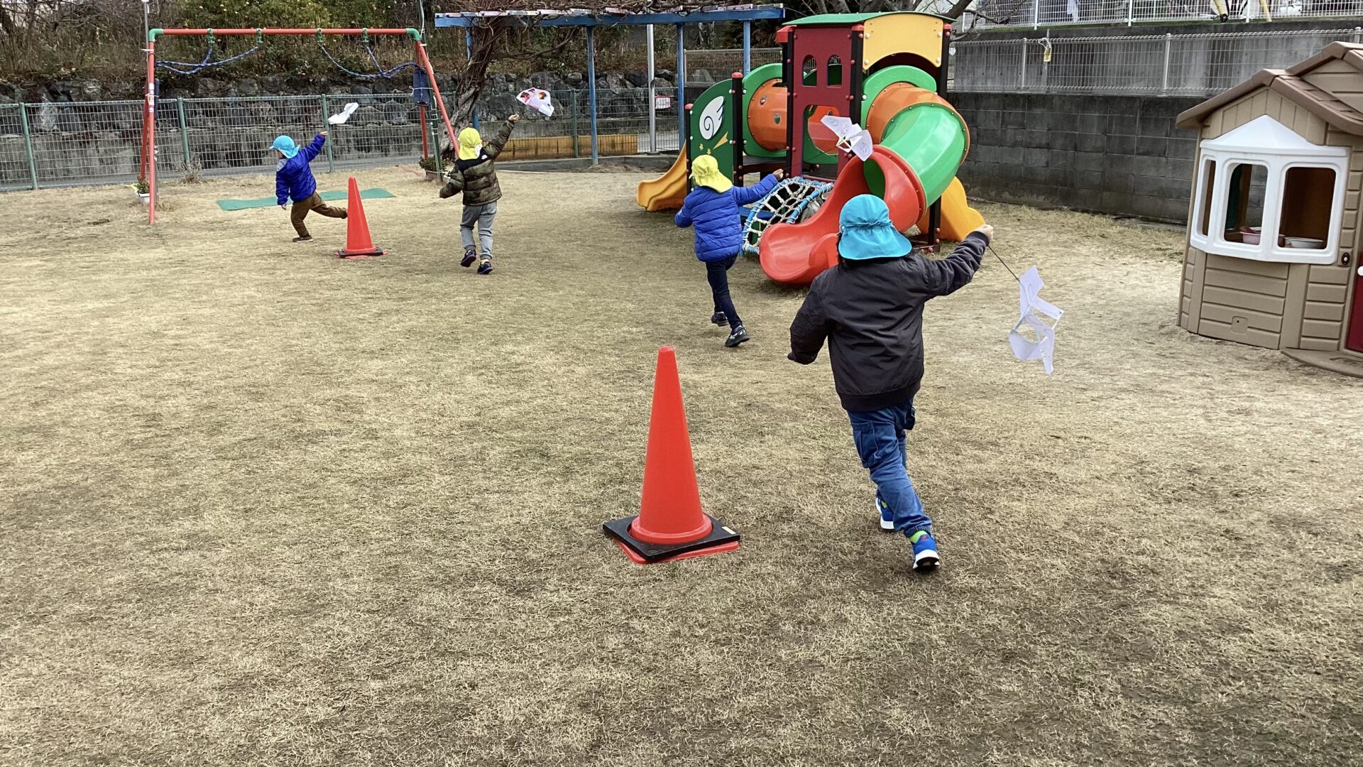 腕を伸ばして凧が浮くと嬉しそうに「みてみて」「とんだ!」と大喜びでした。