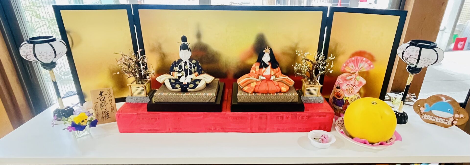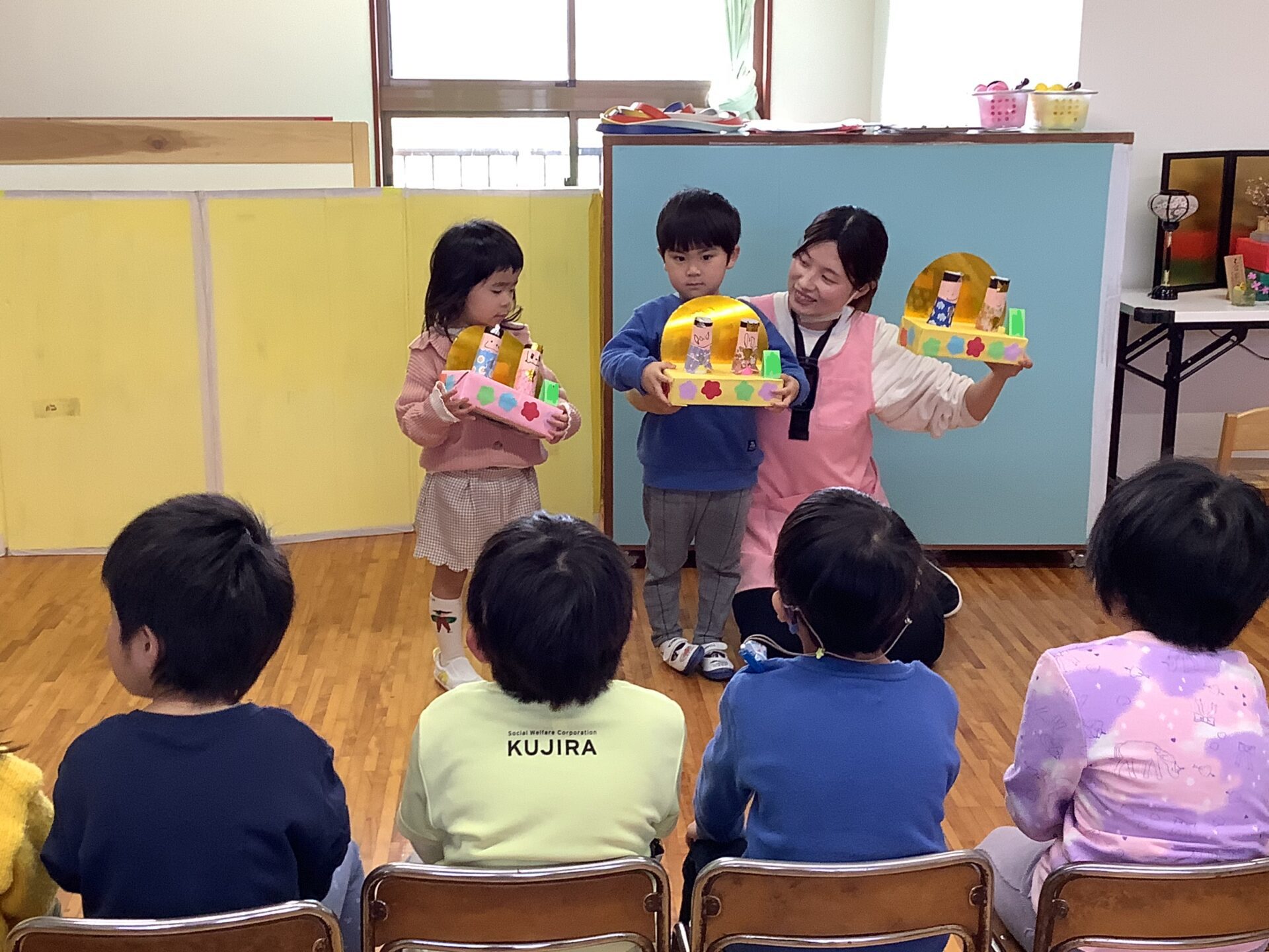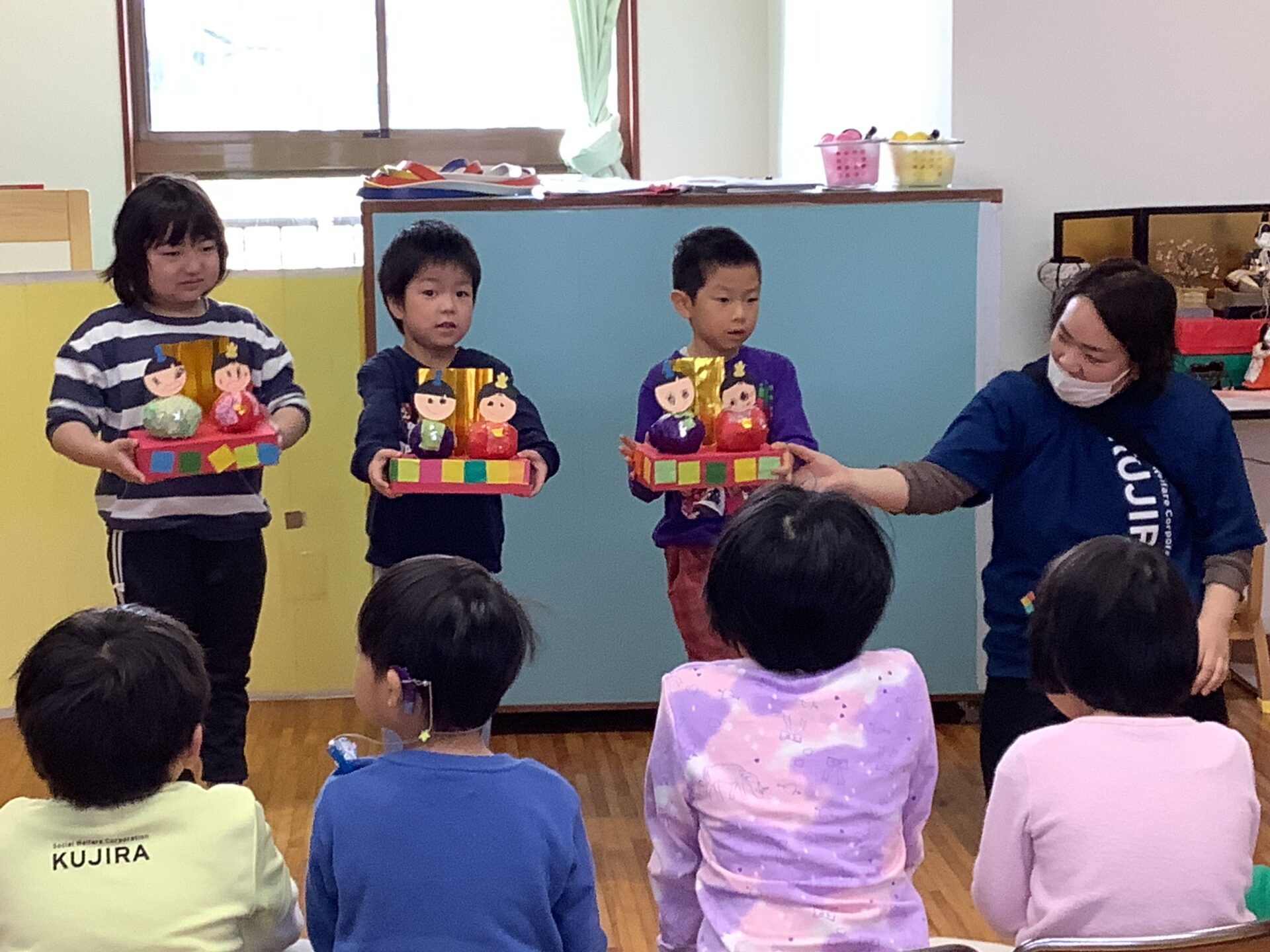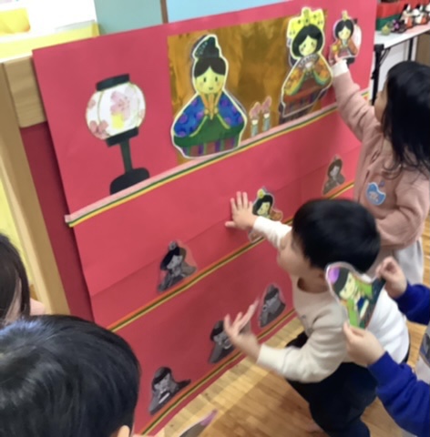 みんなが勢揃いしてひな壇飾りのできあがりー🎎