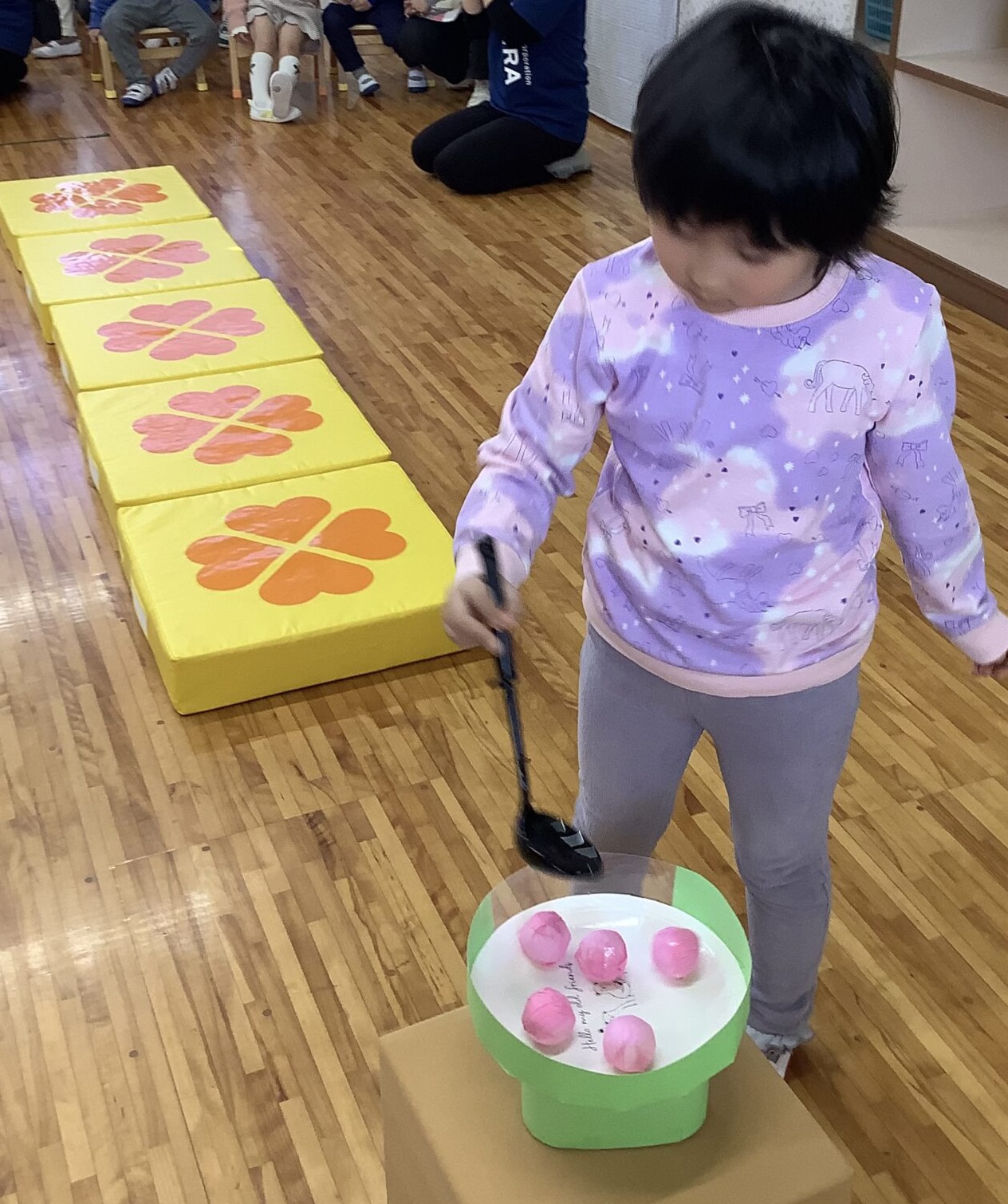 ③くじらチームはお玉にひなあられを乗せて運びます。