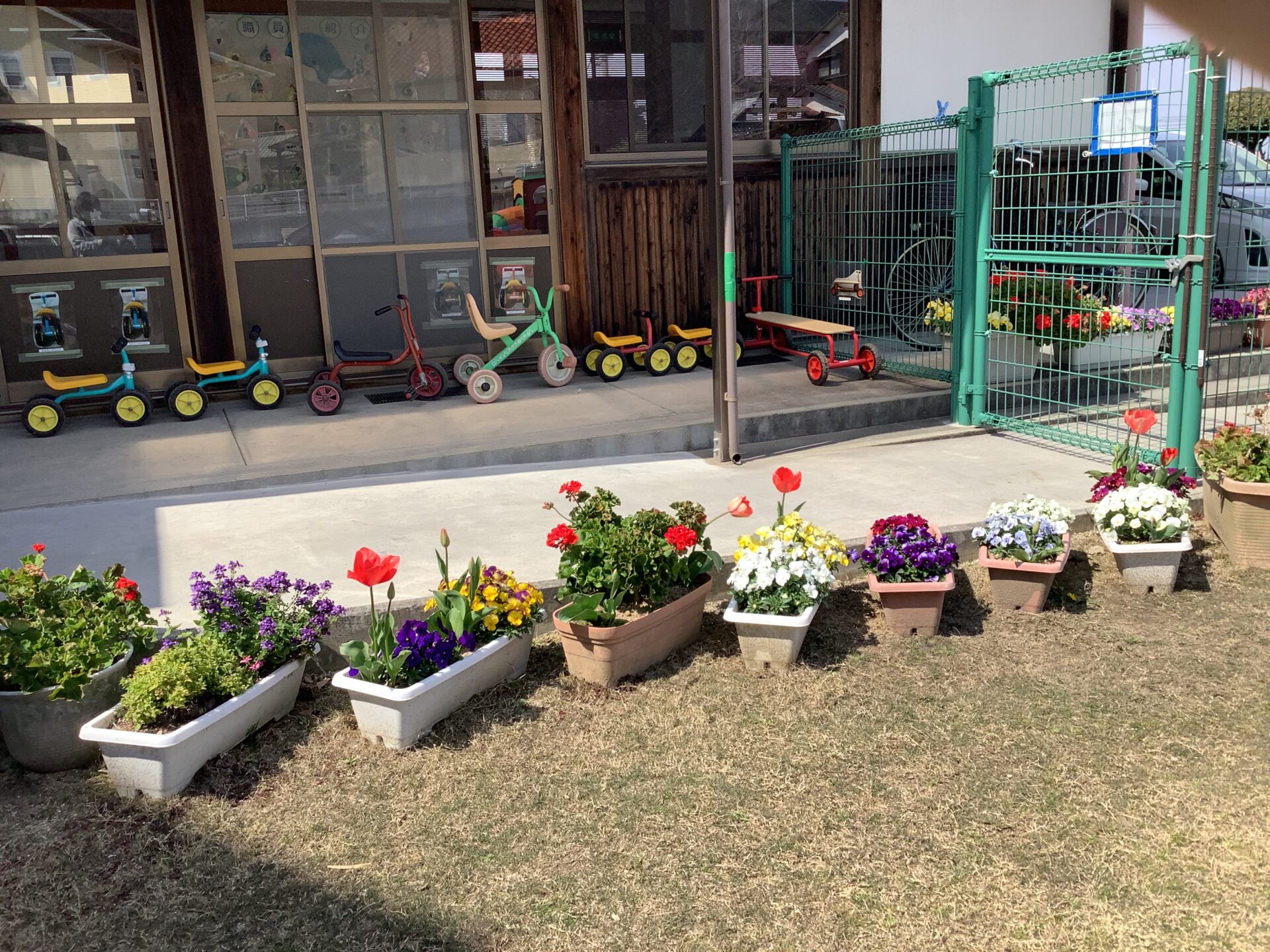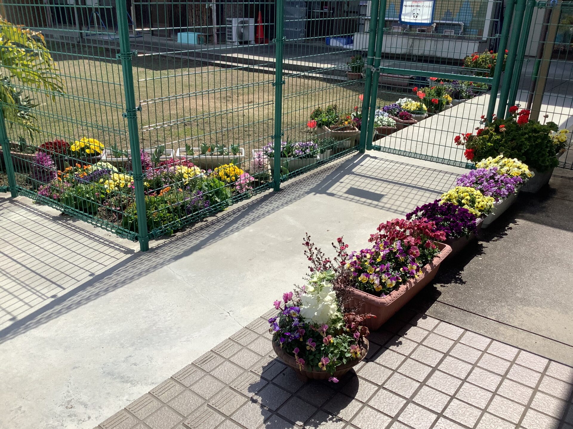 子ども達が毎日通る靴箱までの道も、花盛りです。