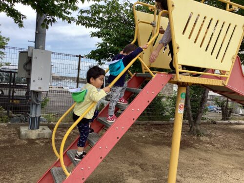 さざなみ公園に到着しました。一緒に手をつないで公園の中へ入りました。1度ベンチに座って水分補給をします。さあ、遊ぼう!