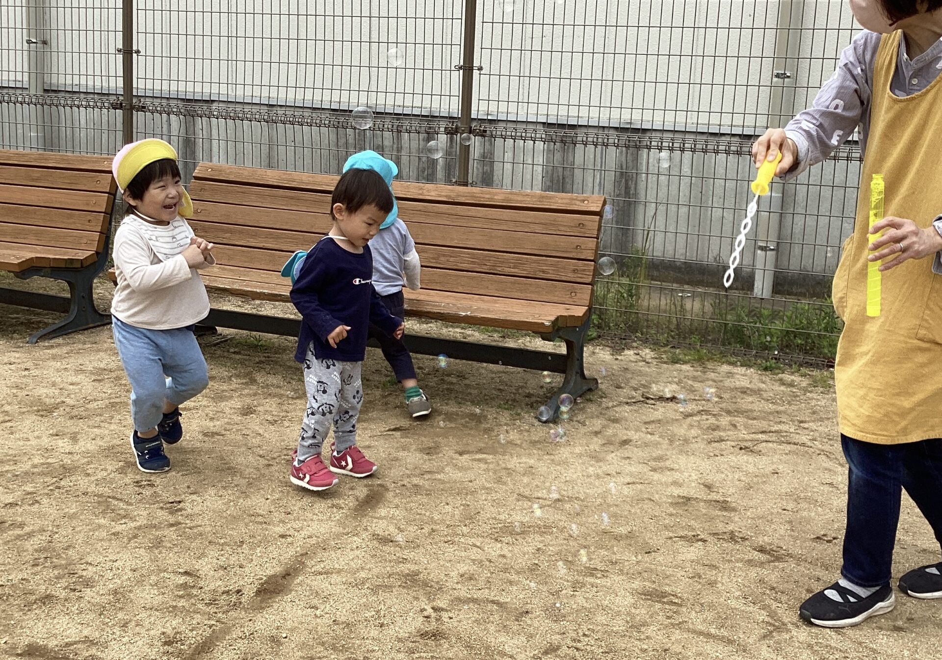 「みんな みてみて!」「なになに??」シャボン玉に誘われて、みんなニコニコで集まることができました。そのまま、手をつないでバスに乗って帰りましたよ。楽しかったね。またお出掛けしましょうね。