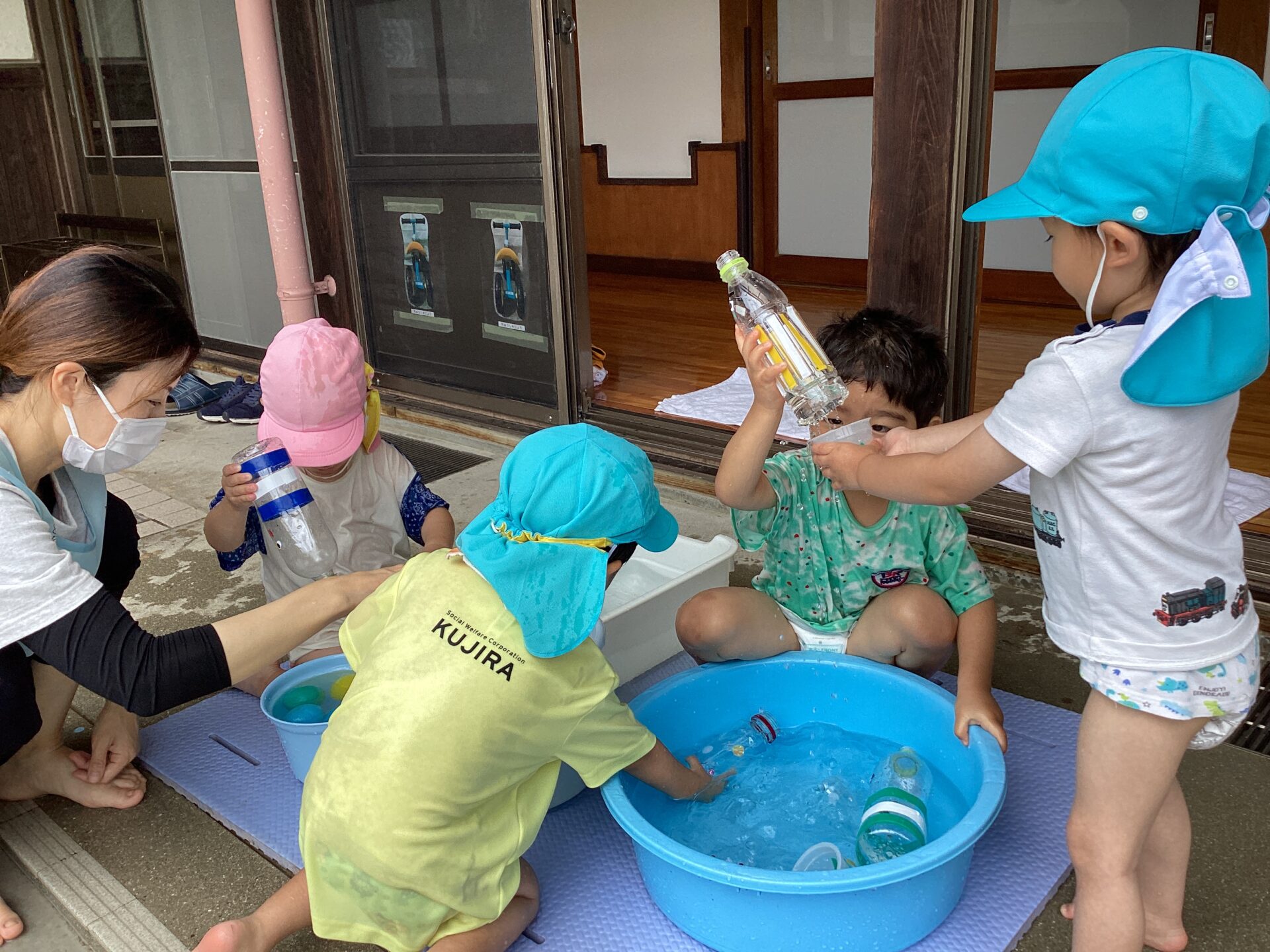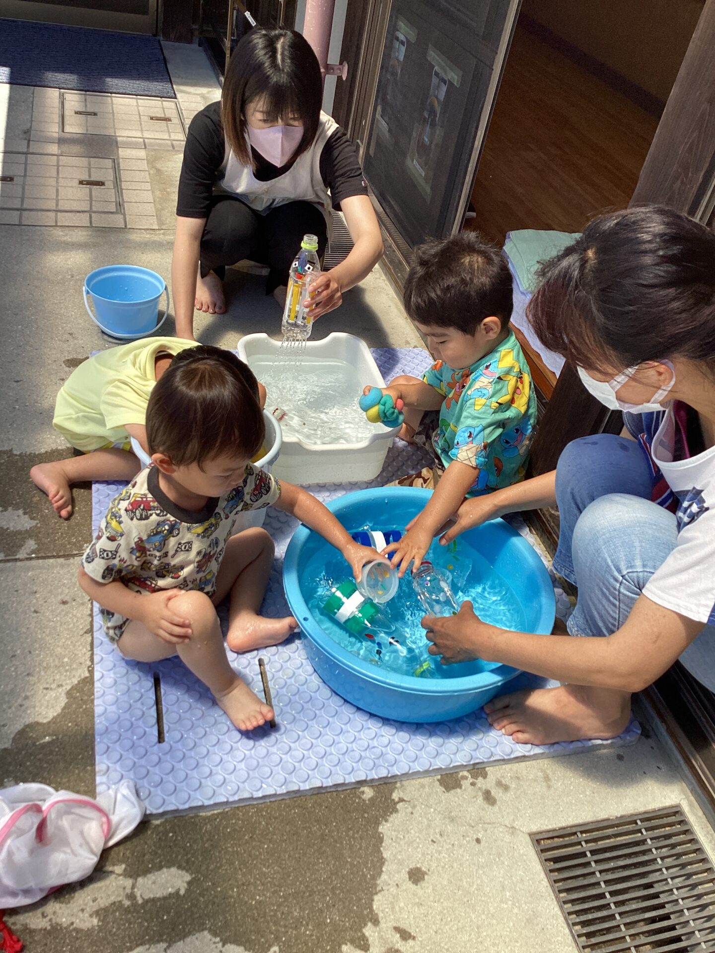 1人ずつにバケツやたらいがあることで自分のスペースとして安心したり、満足したりできるようにと考えました。