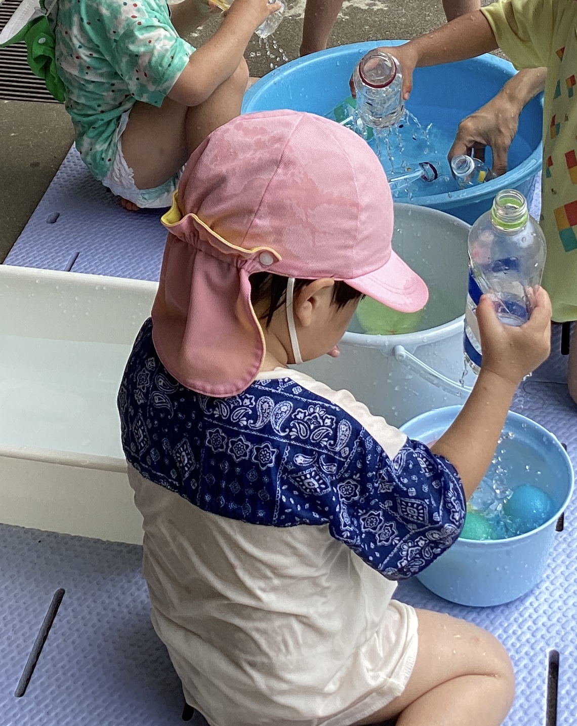 水が大好きな子どももいれば、ちょっと怖いな…これは何だろうとためらう子どもと様々な反応が見られます。子どもたちの様子に応じて無理なく水あそびを楽しめるようにと関わりました。