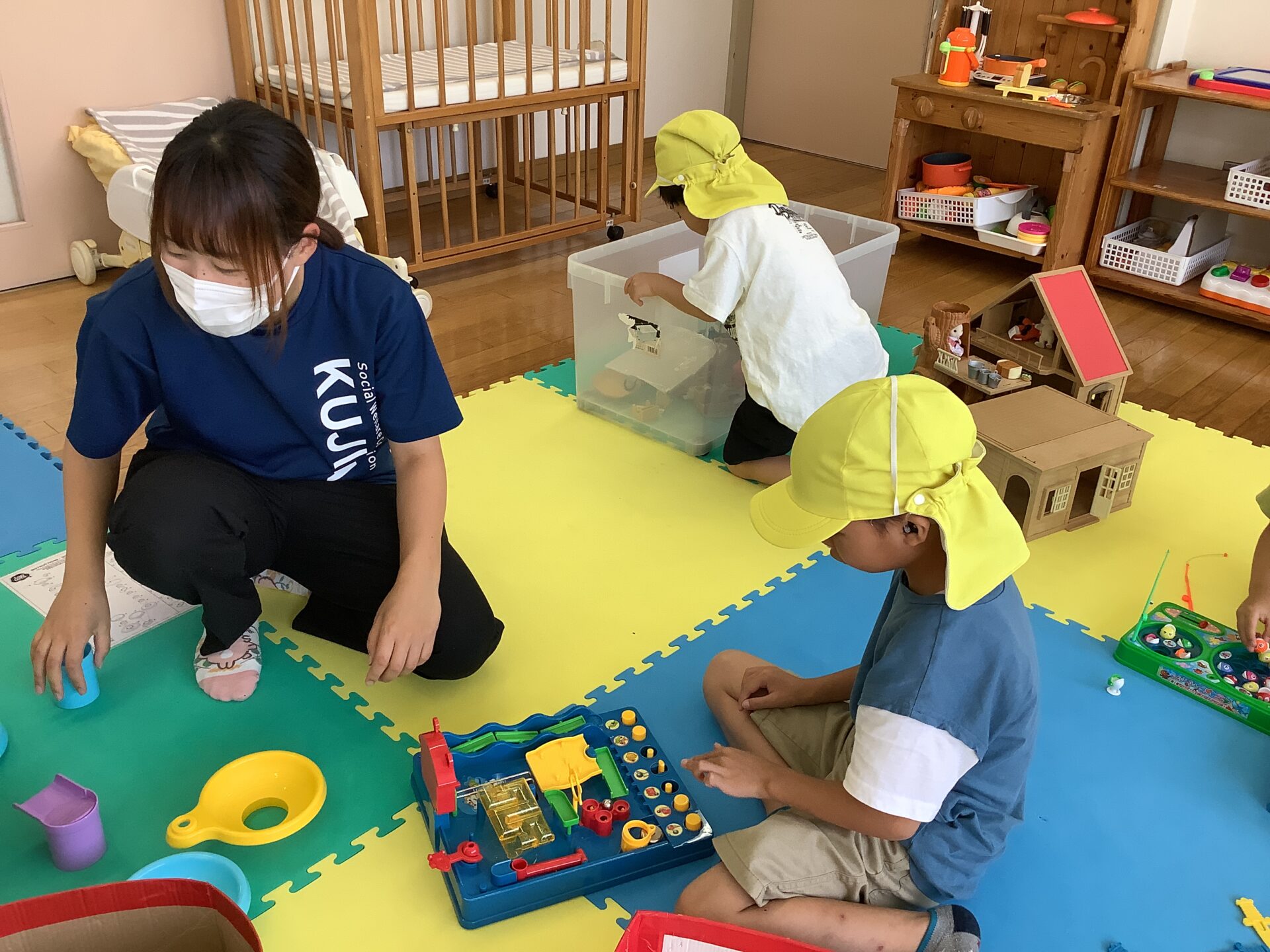 何度も取り換えてもらって、好きな物を選びます。「あー(むつかしい)、てつだって!」と職員におもちゃの組み立てを「どうやって?」聞いたりしながら遊んで、好きな遊び、やりたいことを見つけています。