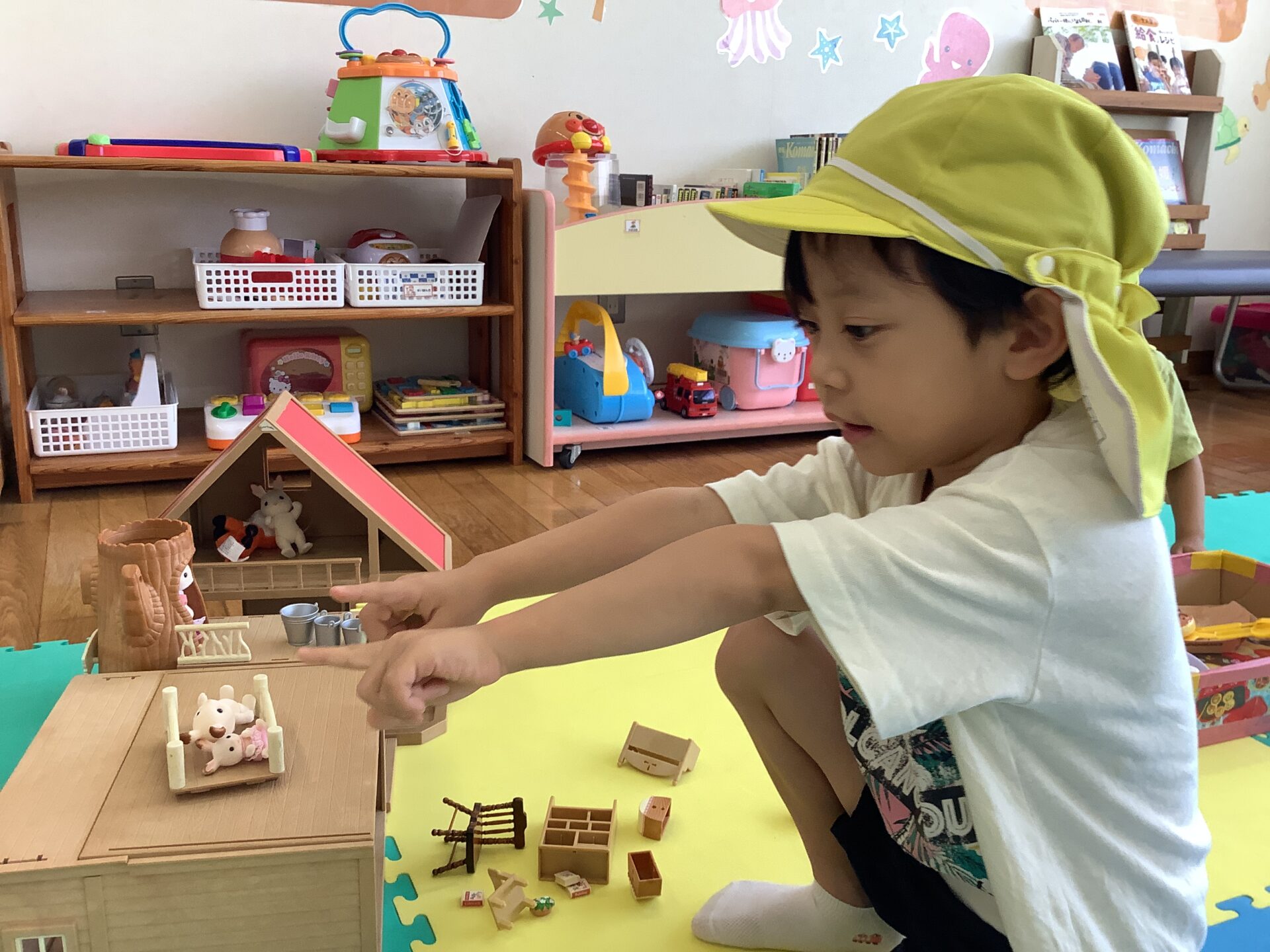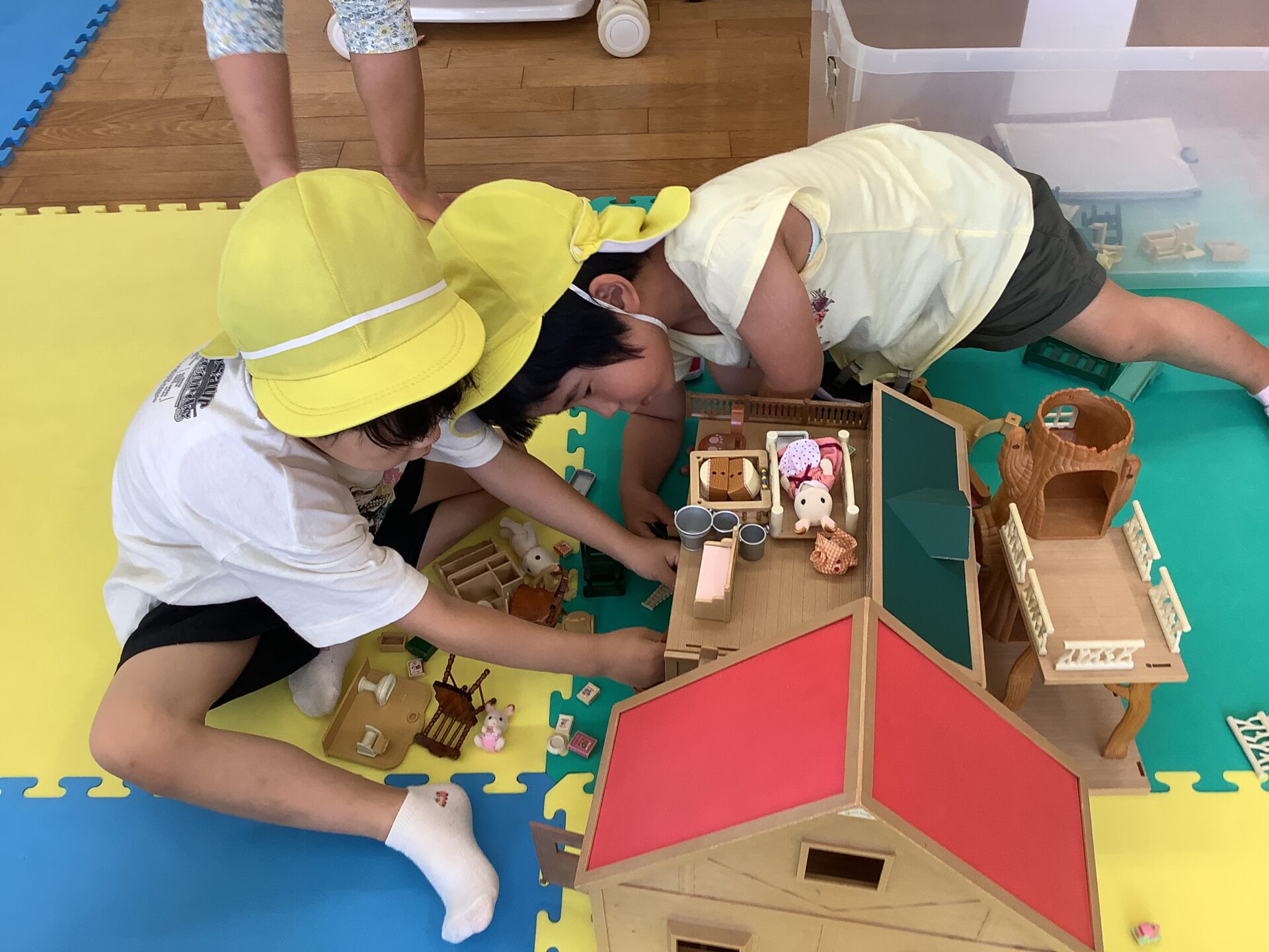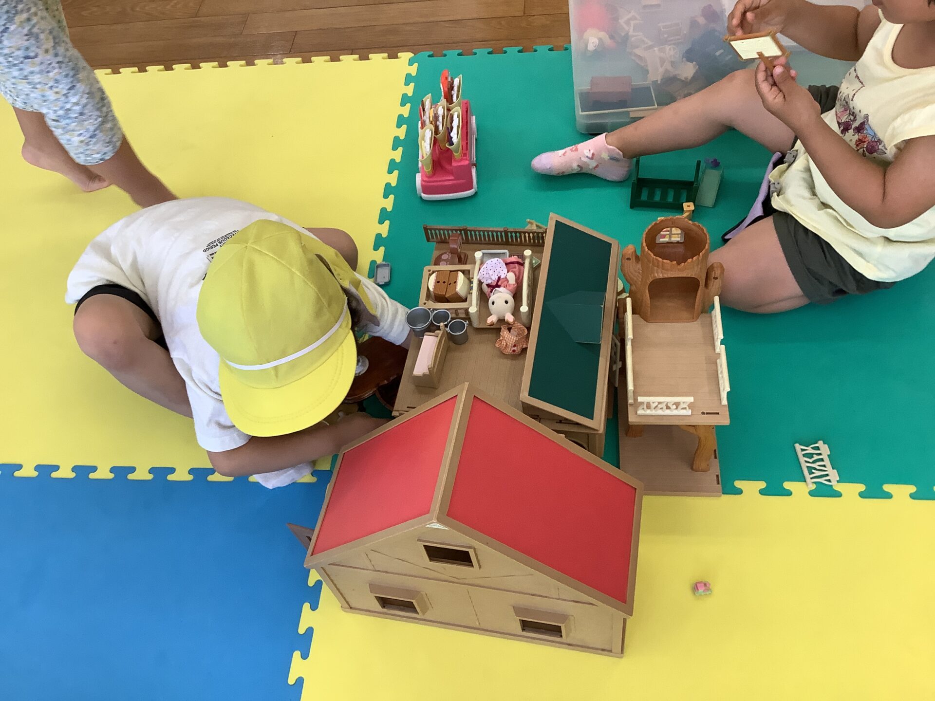 たくさんのおもちゃの中で、この日人気だったのは、「シルバニアファミリー」です。お友だちが次々参加して、お家や家具をどんどん増やしていきました。片付けるのが名残惜しいくらい良く遊びましたよ。