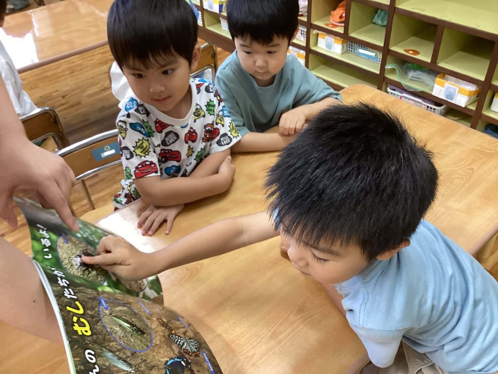 そらチームで“どこかな?なつのむし”という本を見ています。