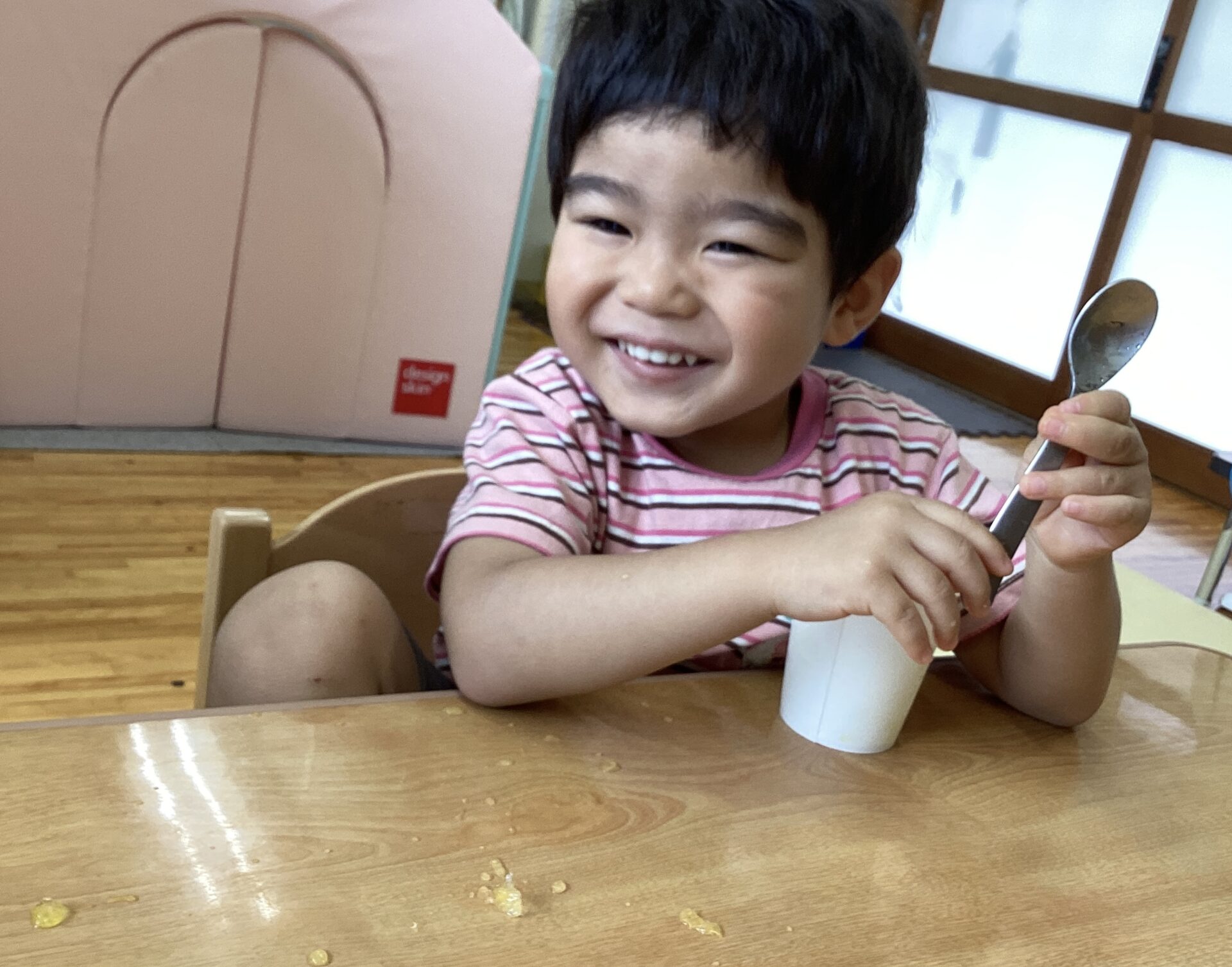 ♪がりがりかき氷、のシアターで歌って楽しんだ数日後、かき氷をみんなで食べてみることにしました。いちごがいいかな?レモンがいいかな?指差しで選ぶことができて、この笑顔!