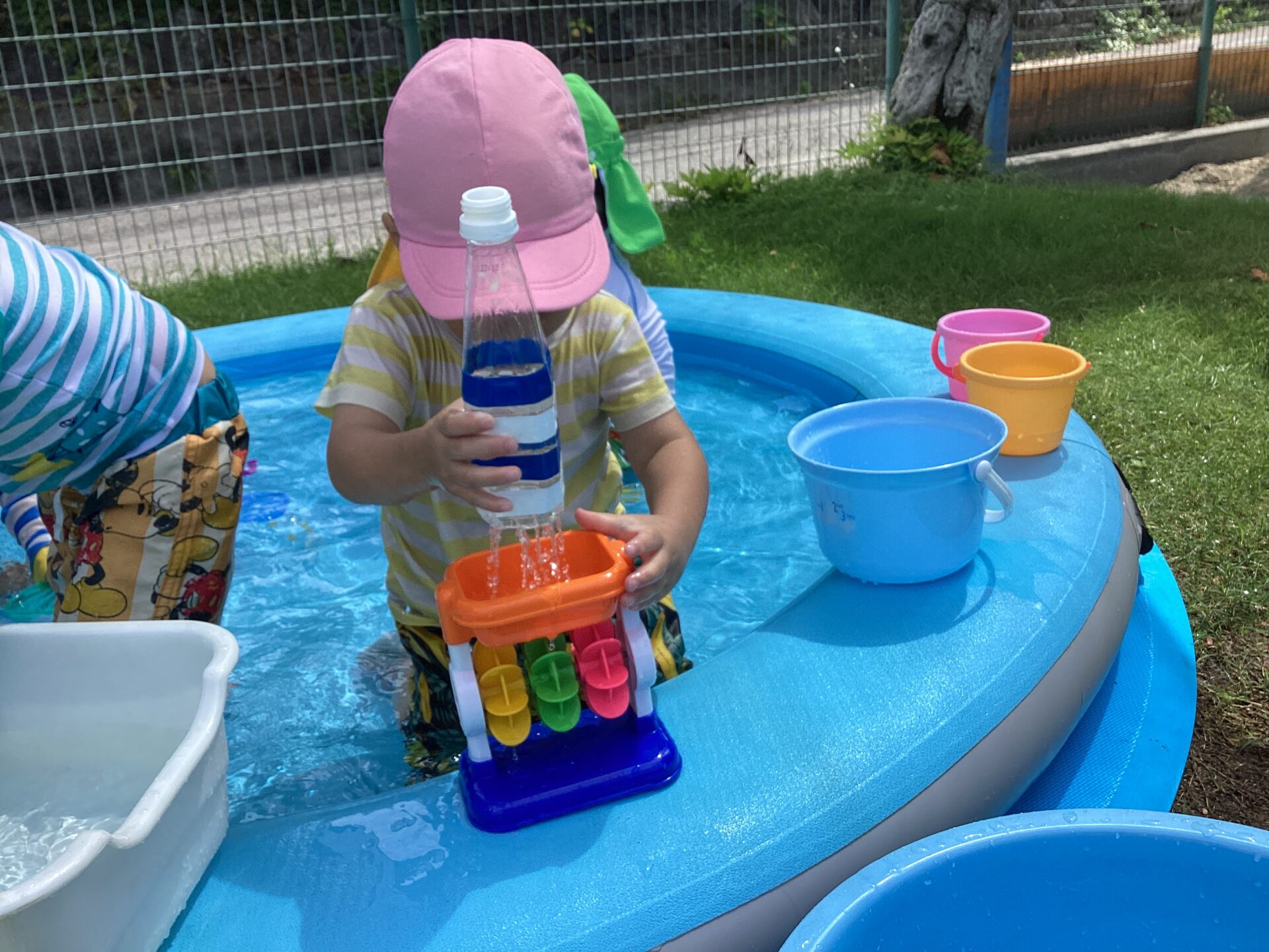 おもちゃを使っての水遊びも始まりました。水をかけると水車が回るしくみが分かってうれしそう!何度も挑戦して楽しんでいます。