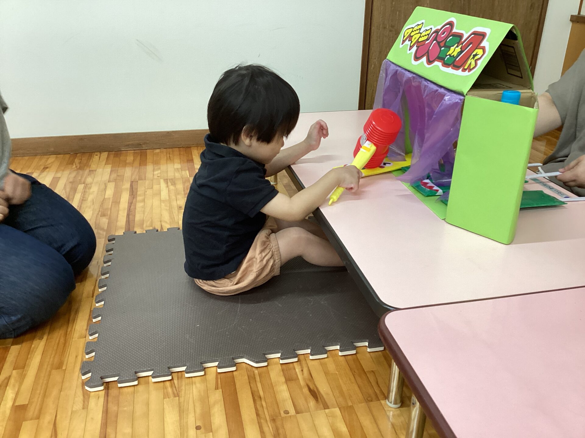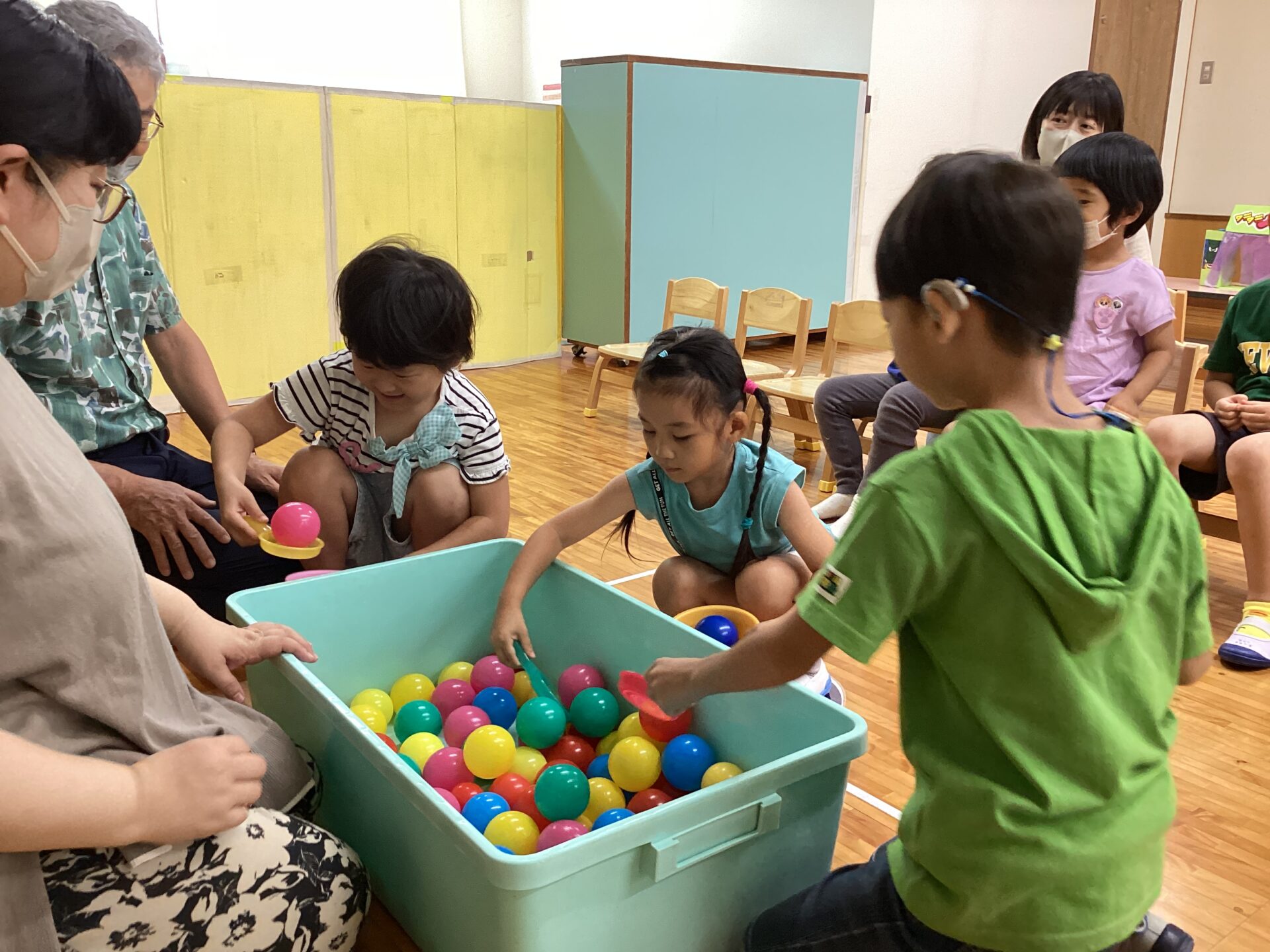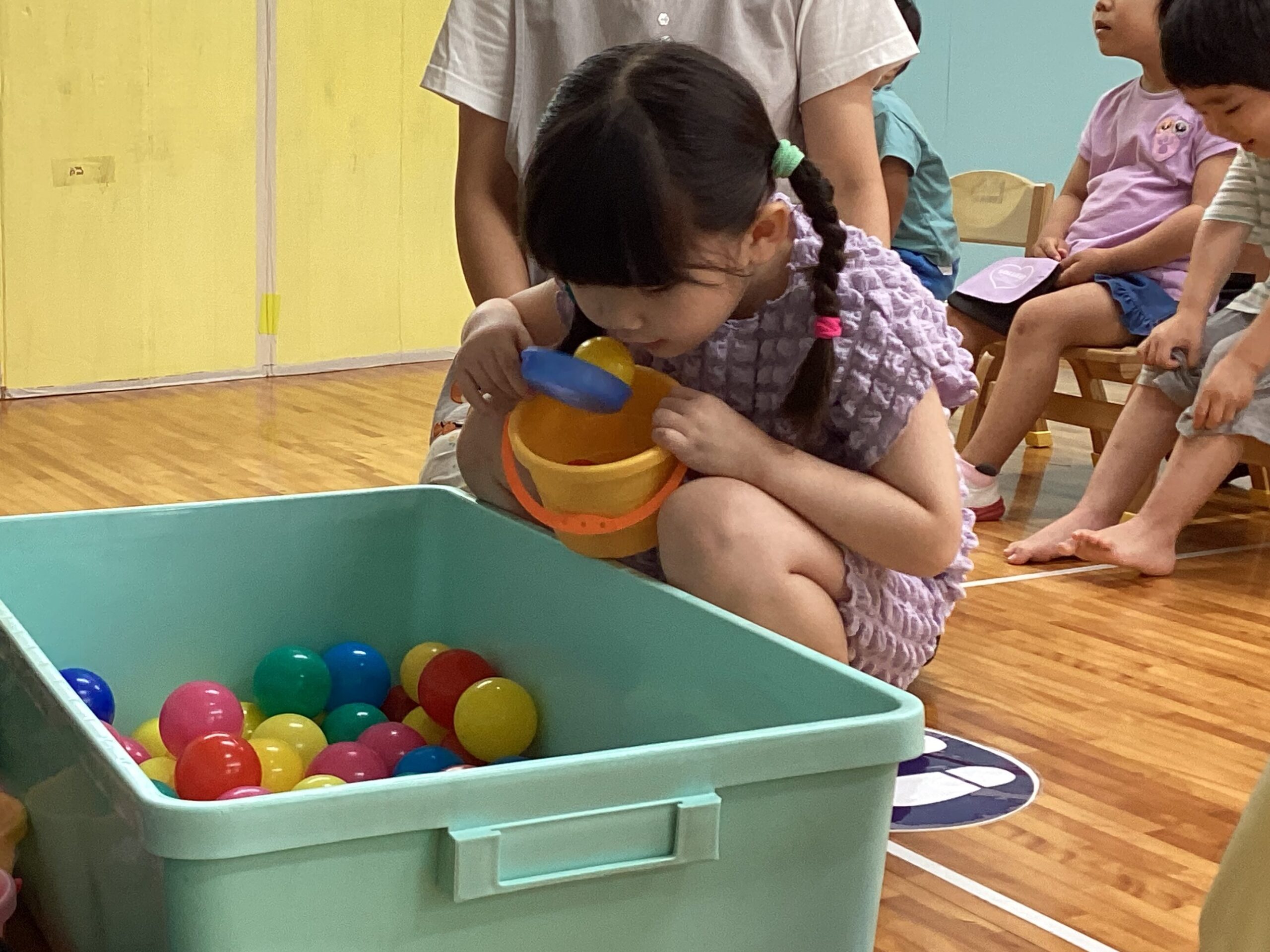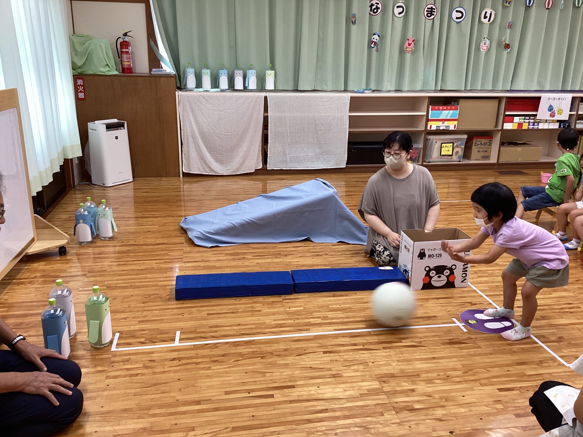 初めてのコーナー遊びも、小グループで集まって行うとやり方が分かって楽しむことができ、友だちが遊んでいる間、「がんばれー」と応援している姿もありました。