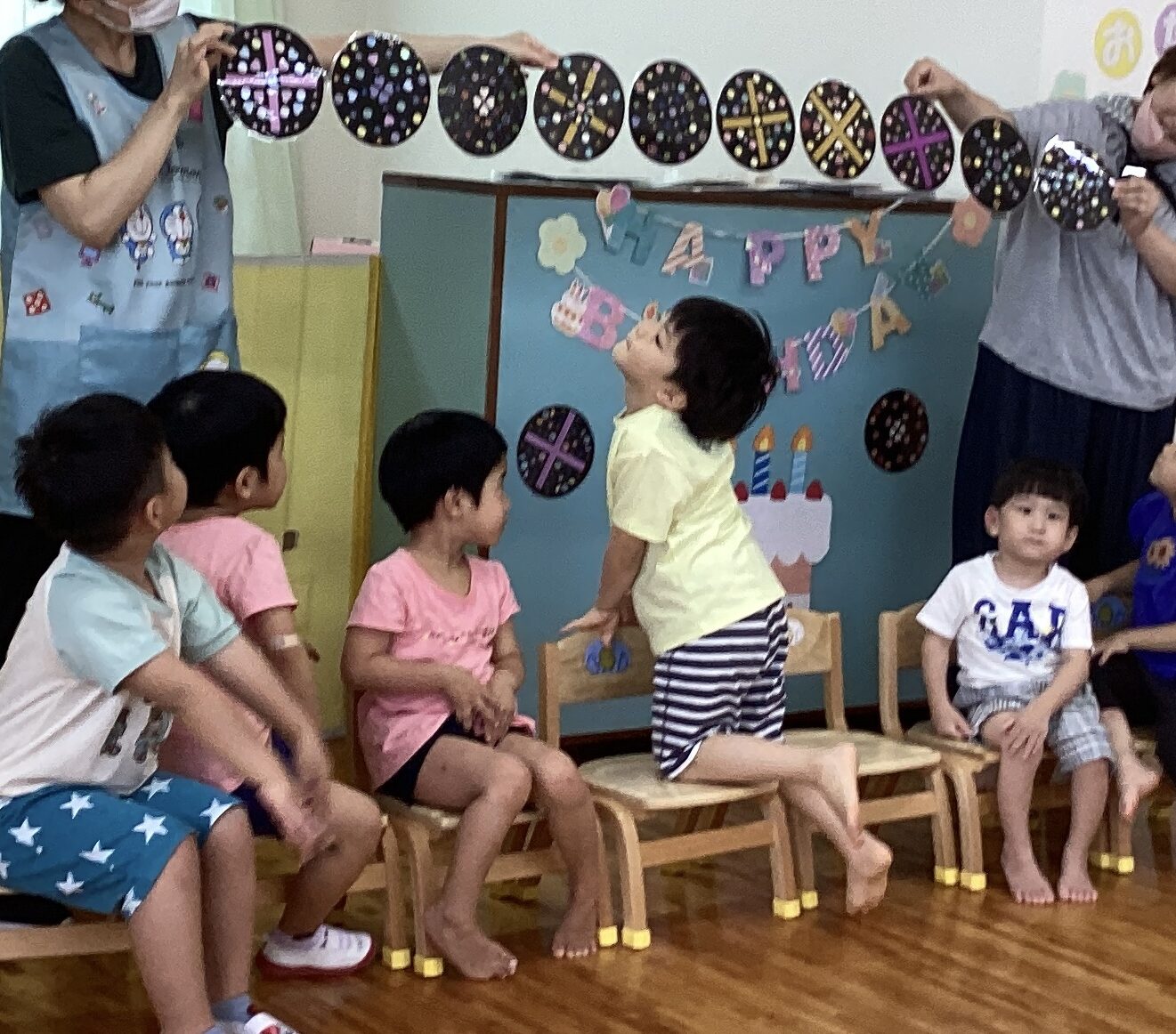「たんたんたんたん♪誕生日」の歌に合わせて8月生まれの友達が呼ばれます。