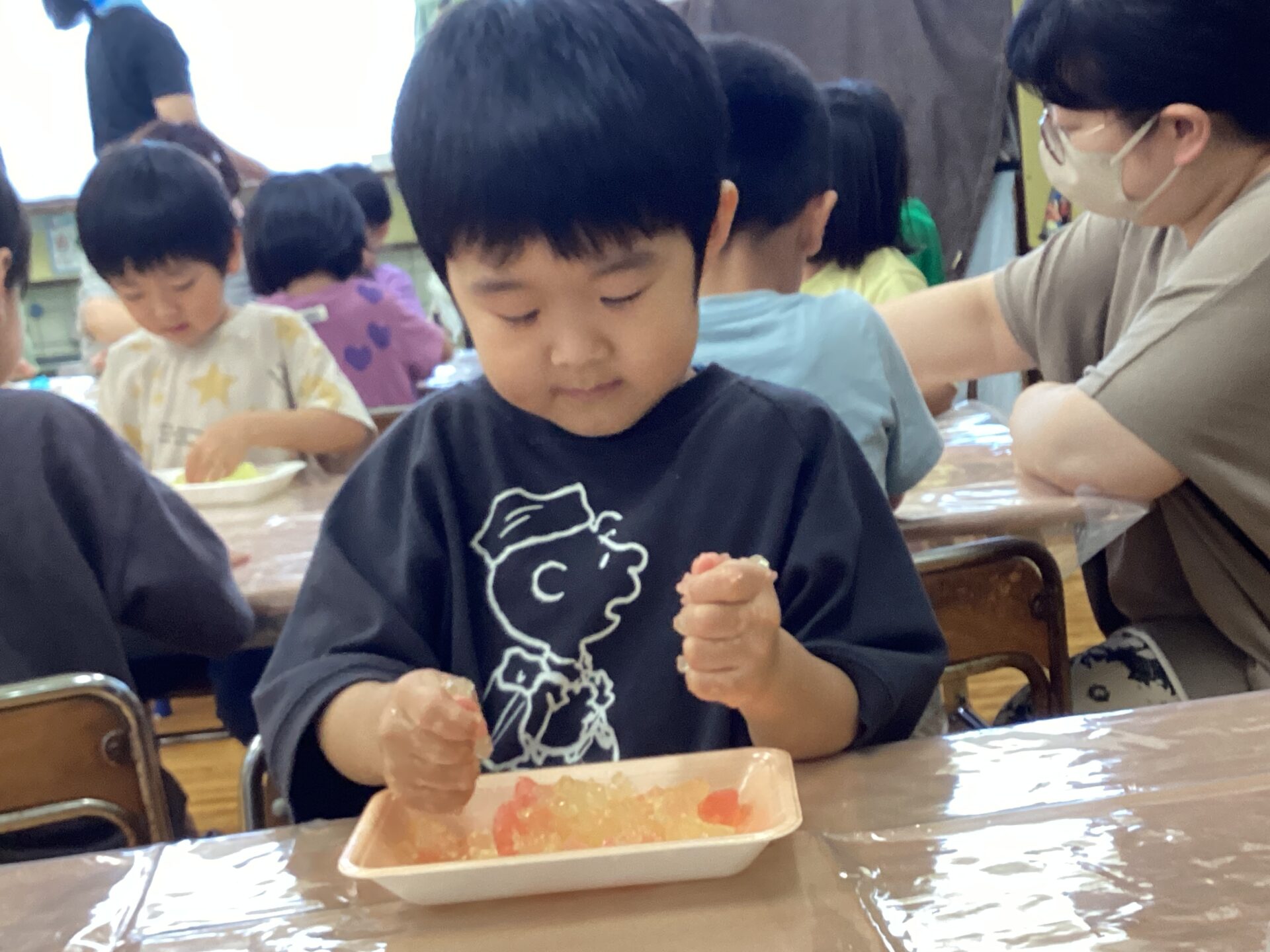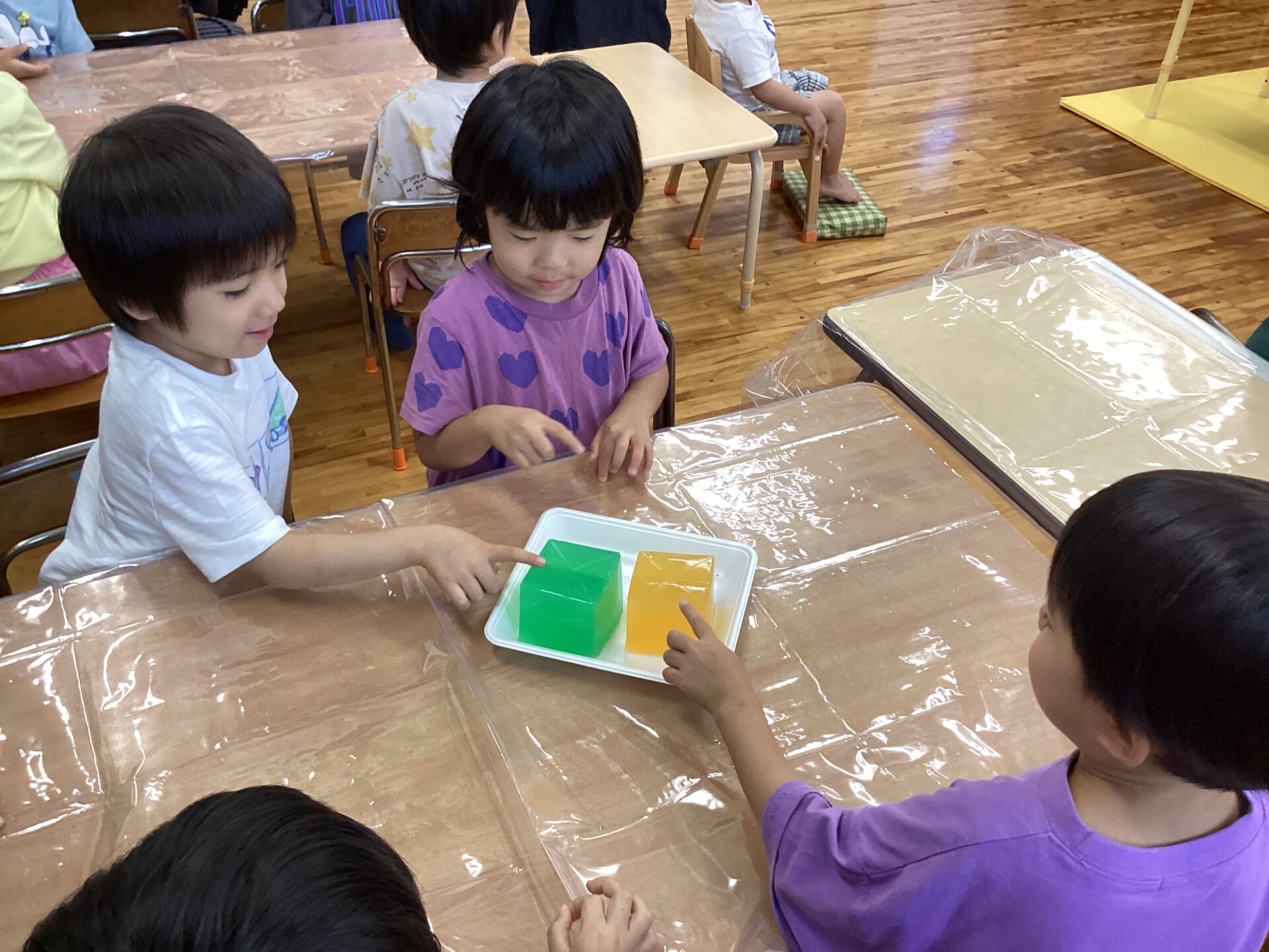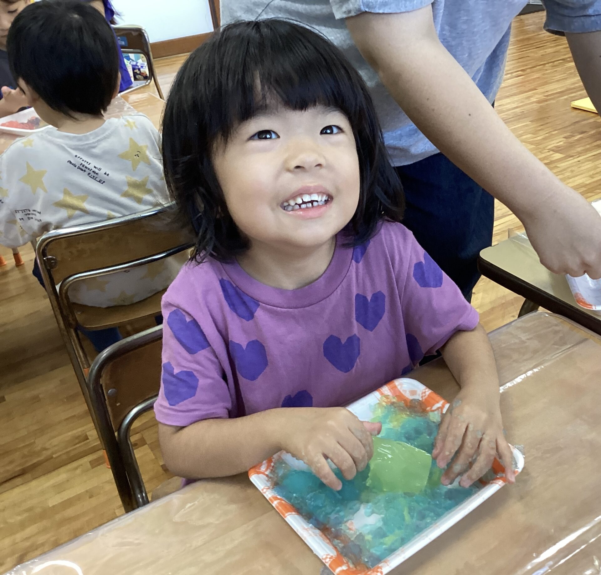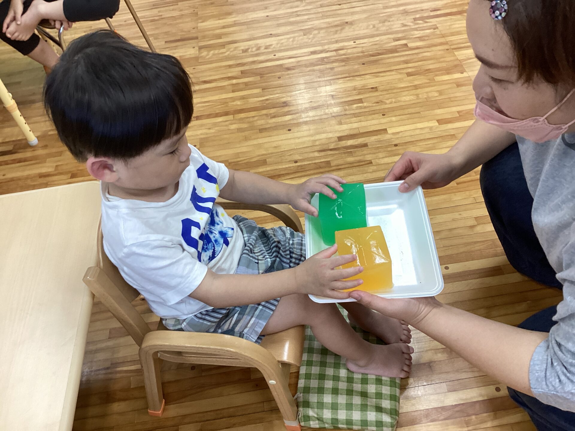 成長を感じました。色とりどりの寒天に「あお!」「みどり」など