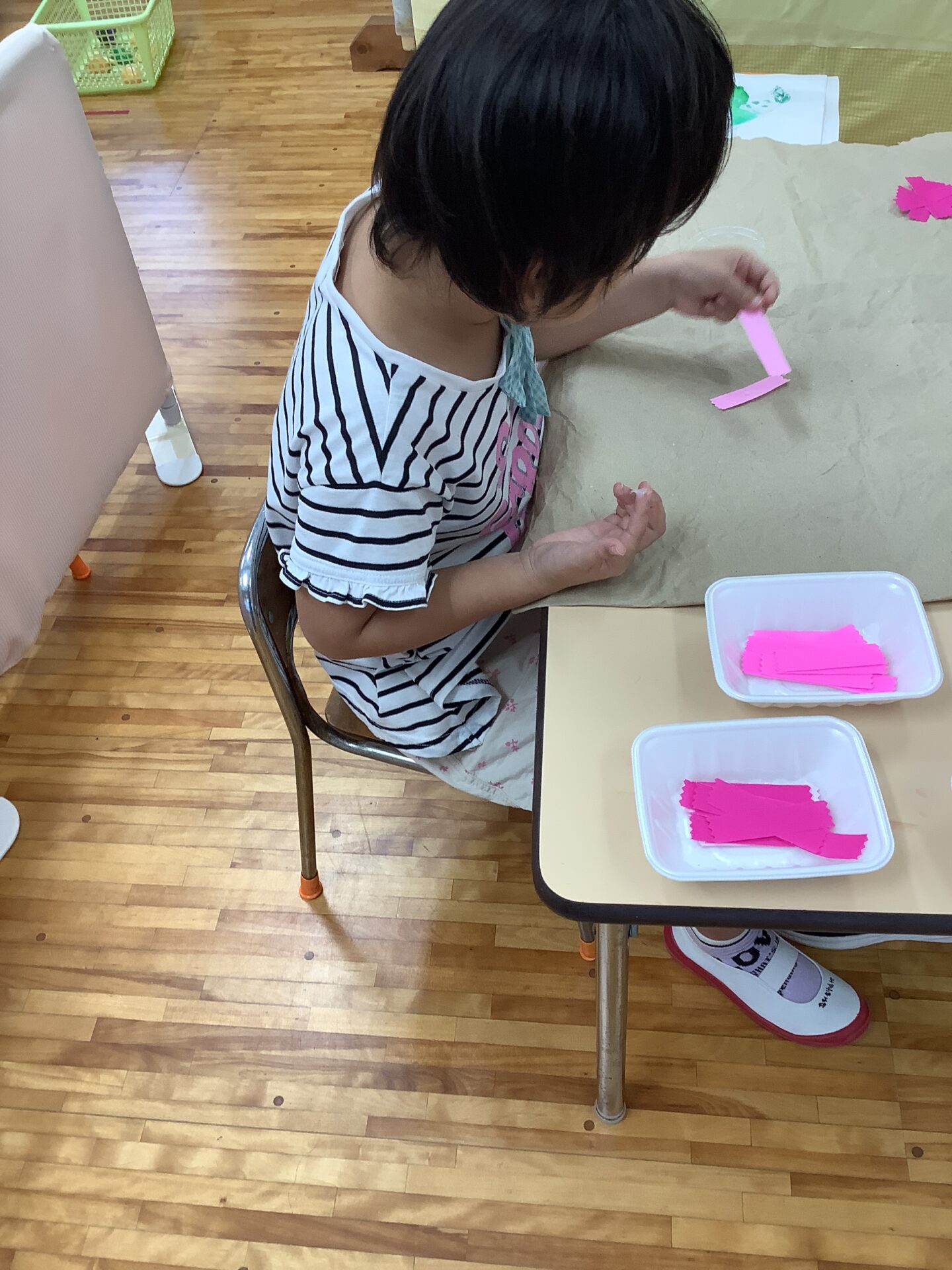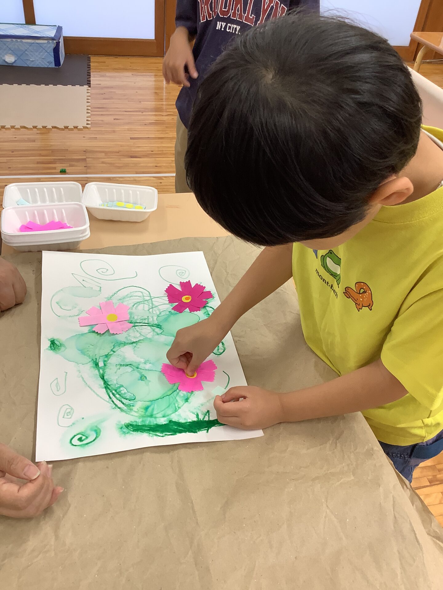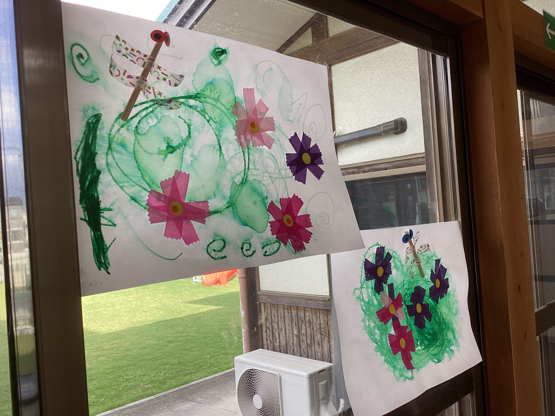 「コスモスのお花の咲いている所にトンボをとばしてあげよう」と制作が始まりました。