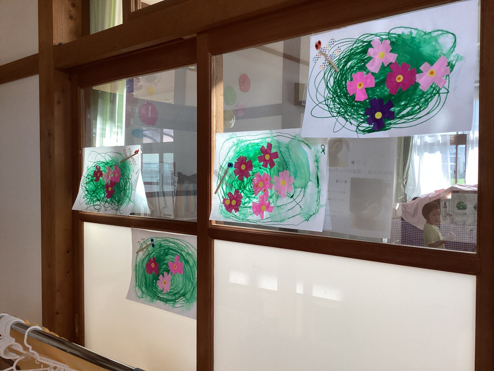 マーカーの線描きを水でにじませた画用紙の上からコスモスを貼って‥