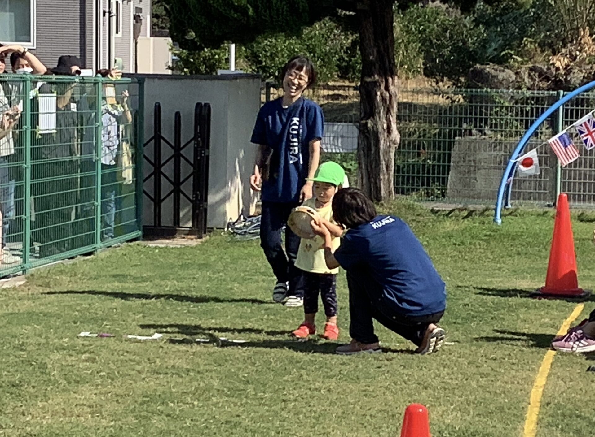 かけっこでは、たくさんの大人が見守る中、ドキドキしたと思いますが、いつも通りにお返事(挙手)をして、職員やお友だちと一緒に走って、ひとりひとりゴールでタッチができました。