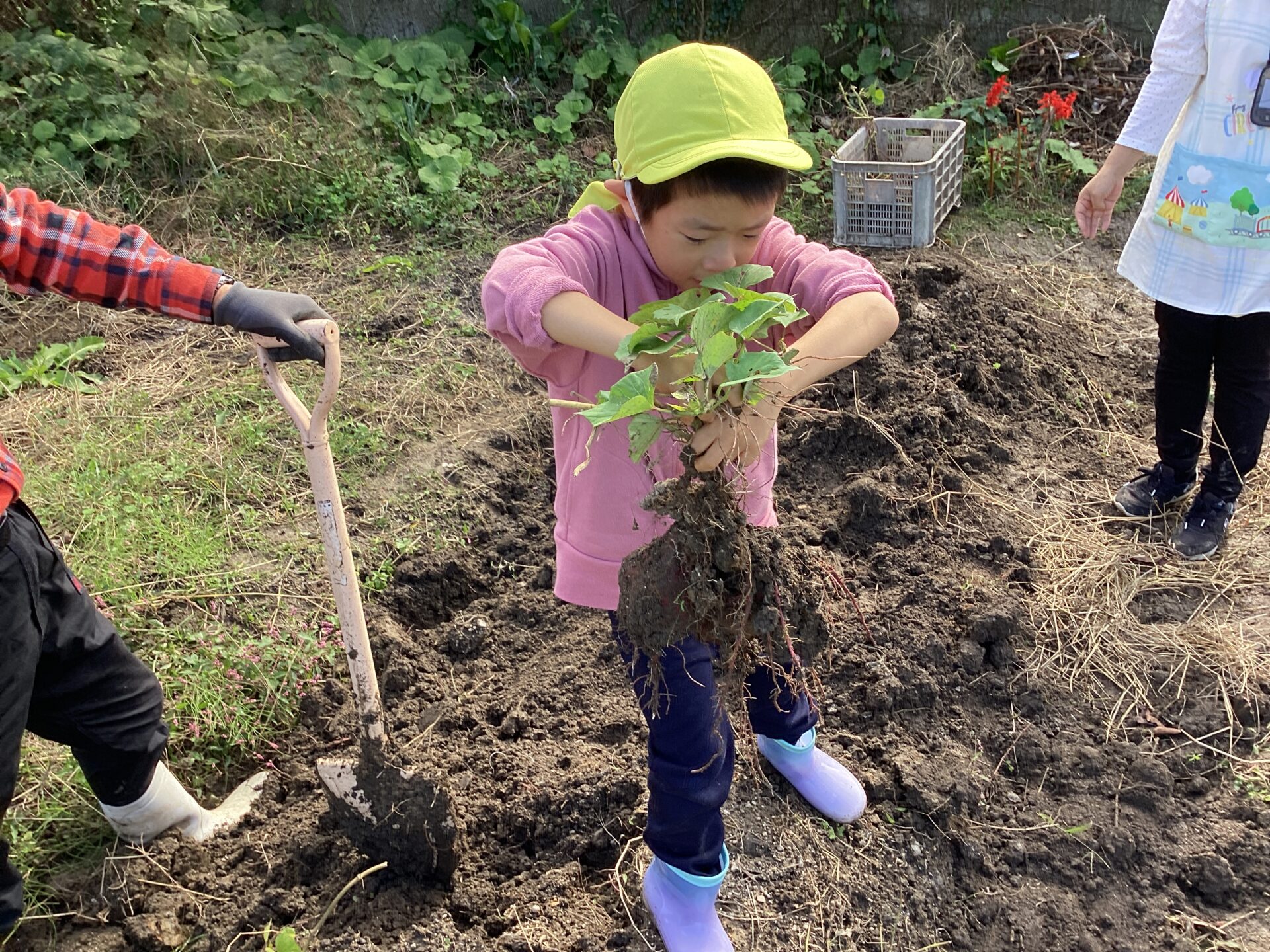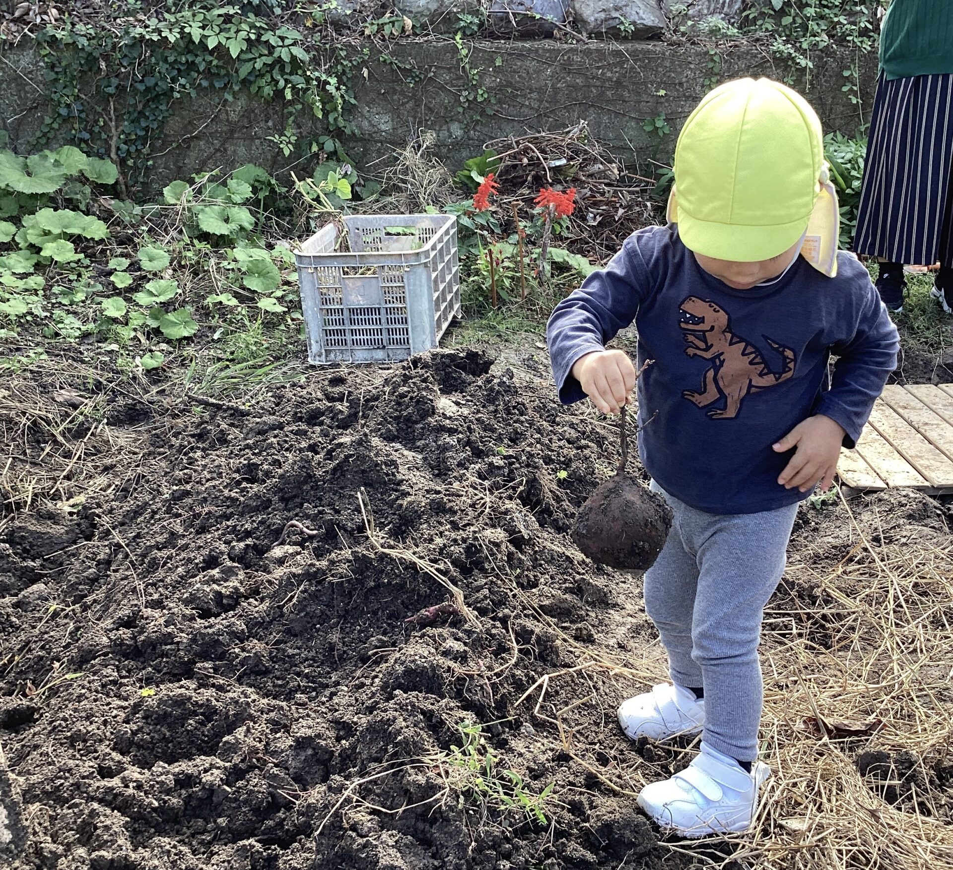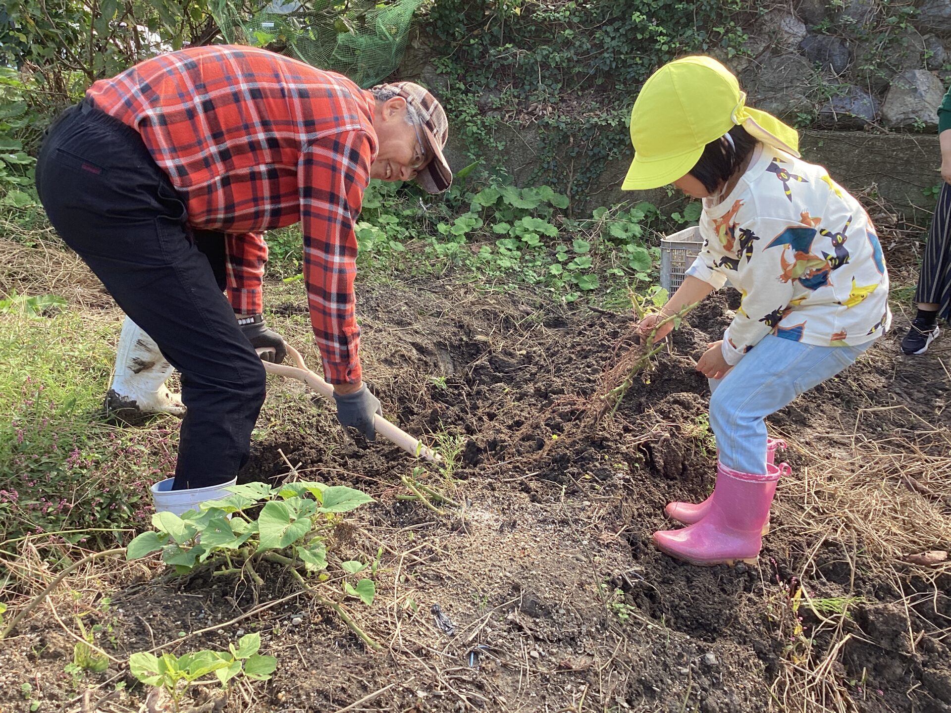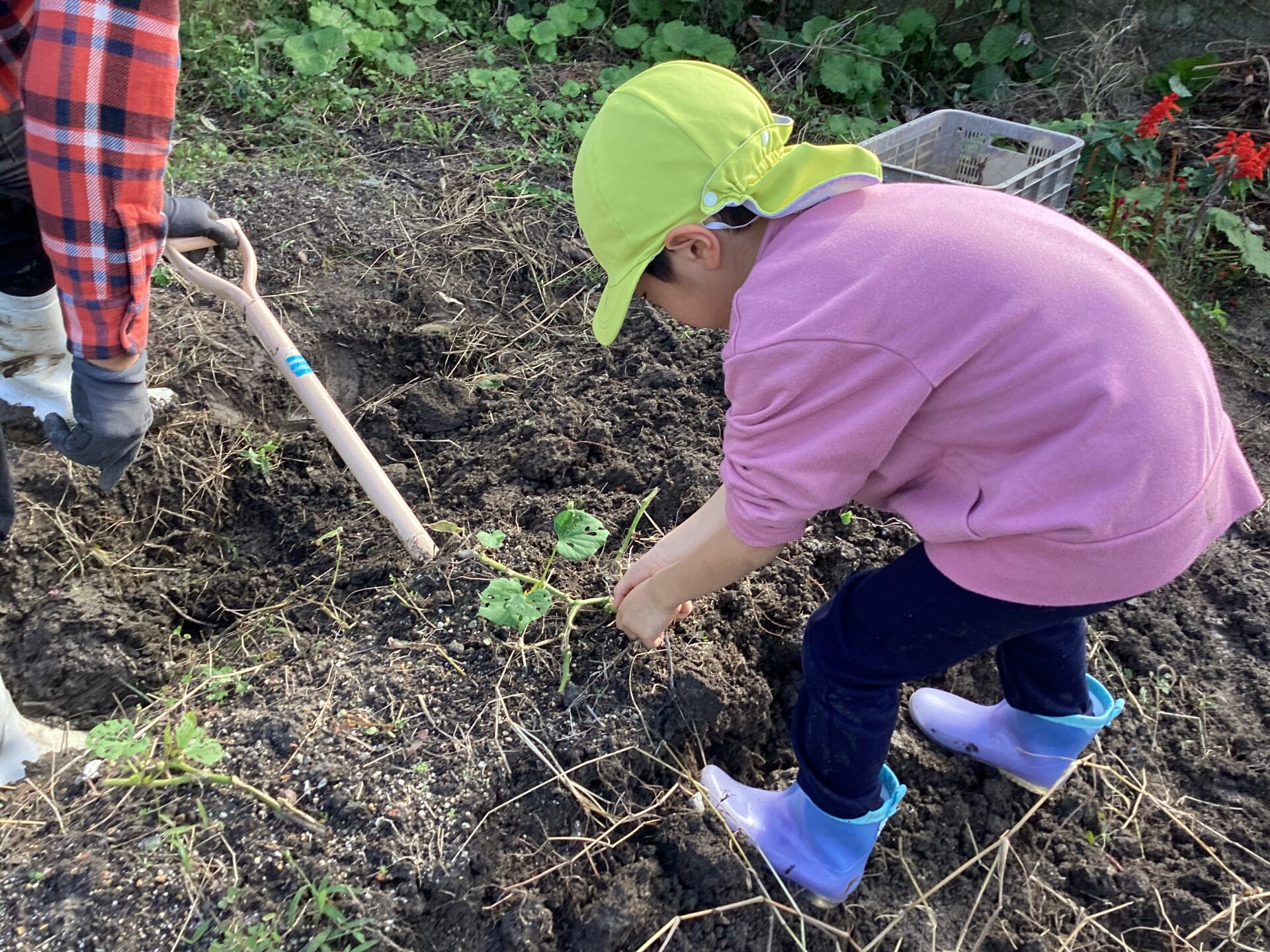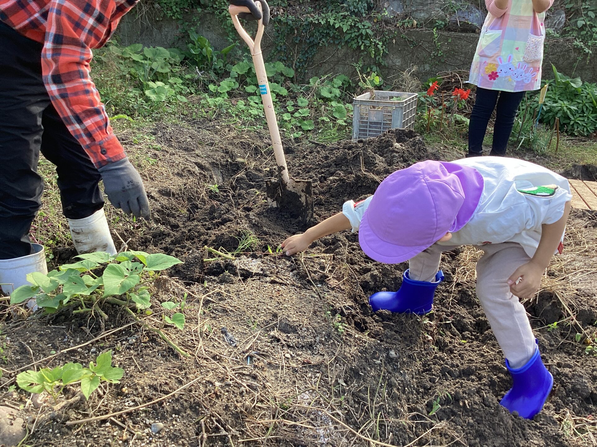暑い中お世話をしてくださったスタッフの皆さんに感謝です。土が苦手な子どもさんもお芋を楽しみに、自然に触れる機会が一つ増えましたよ。(大きなミミズやカナブンの幼虫にも興味津々でした)
