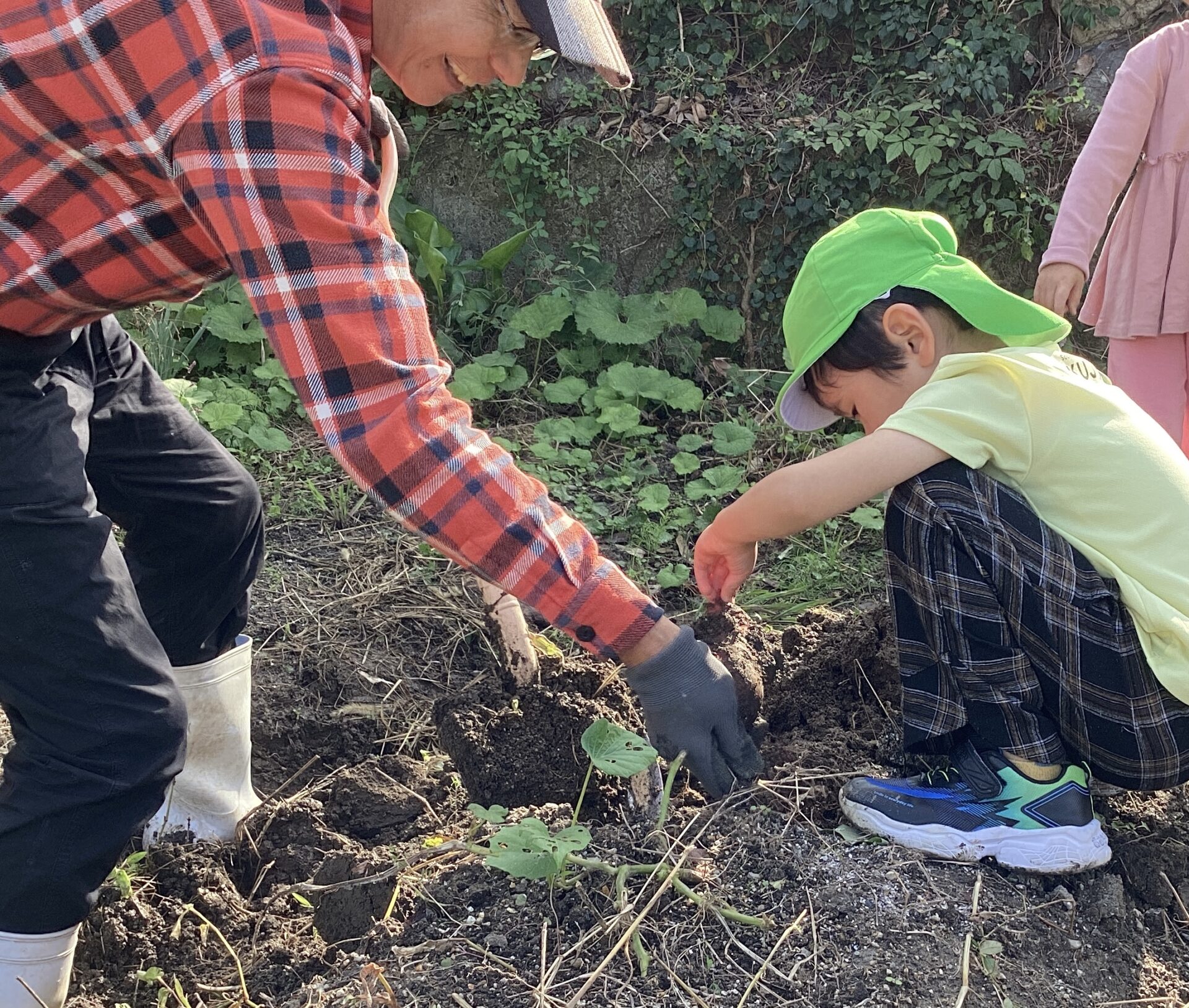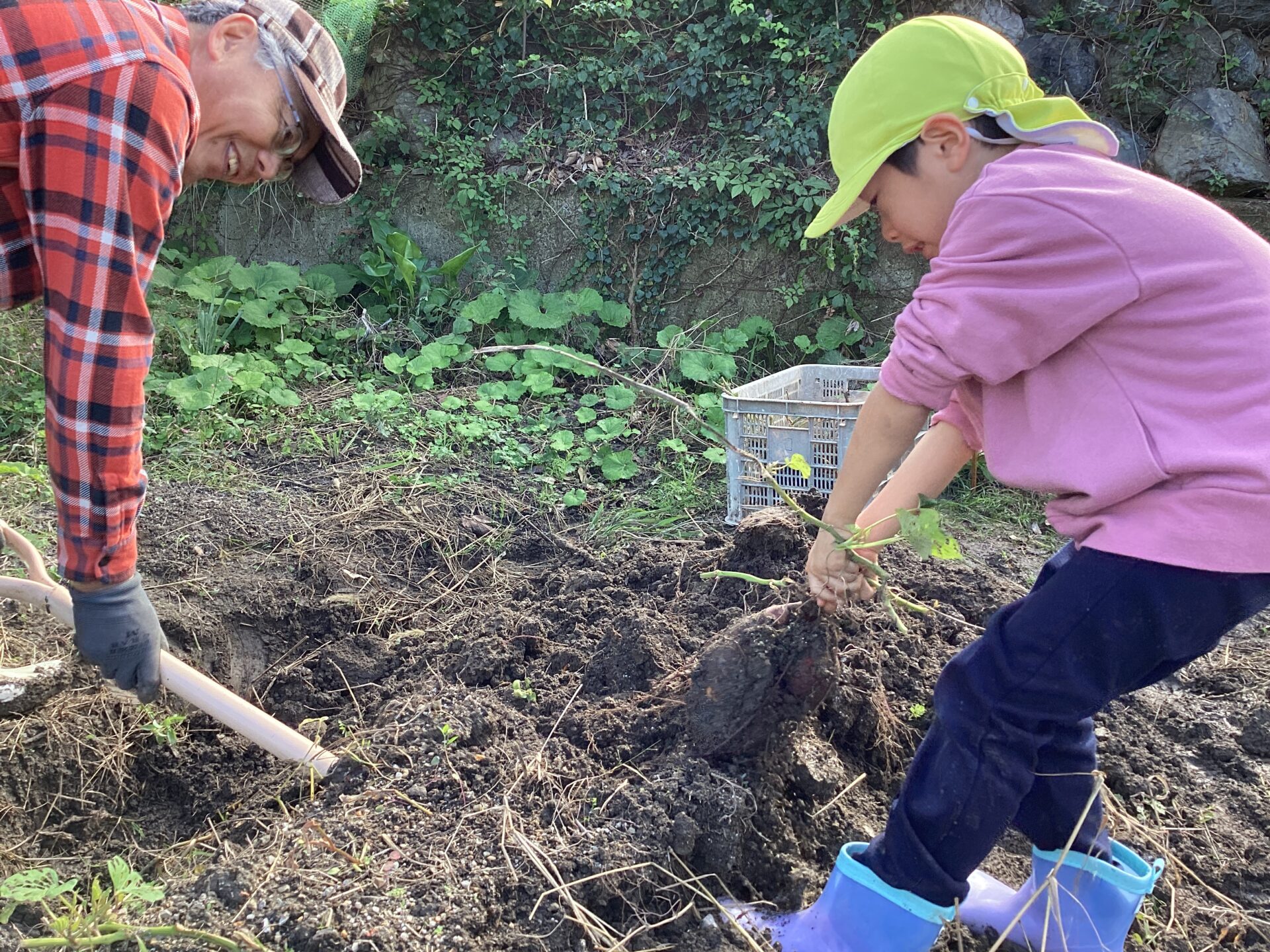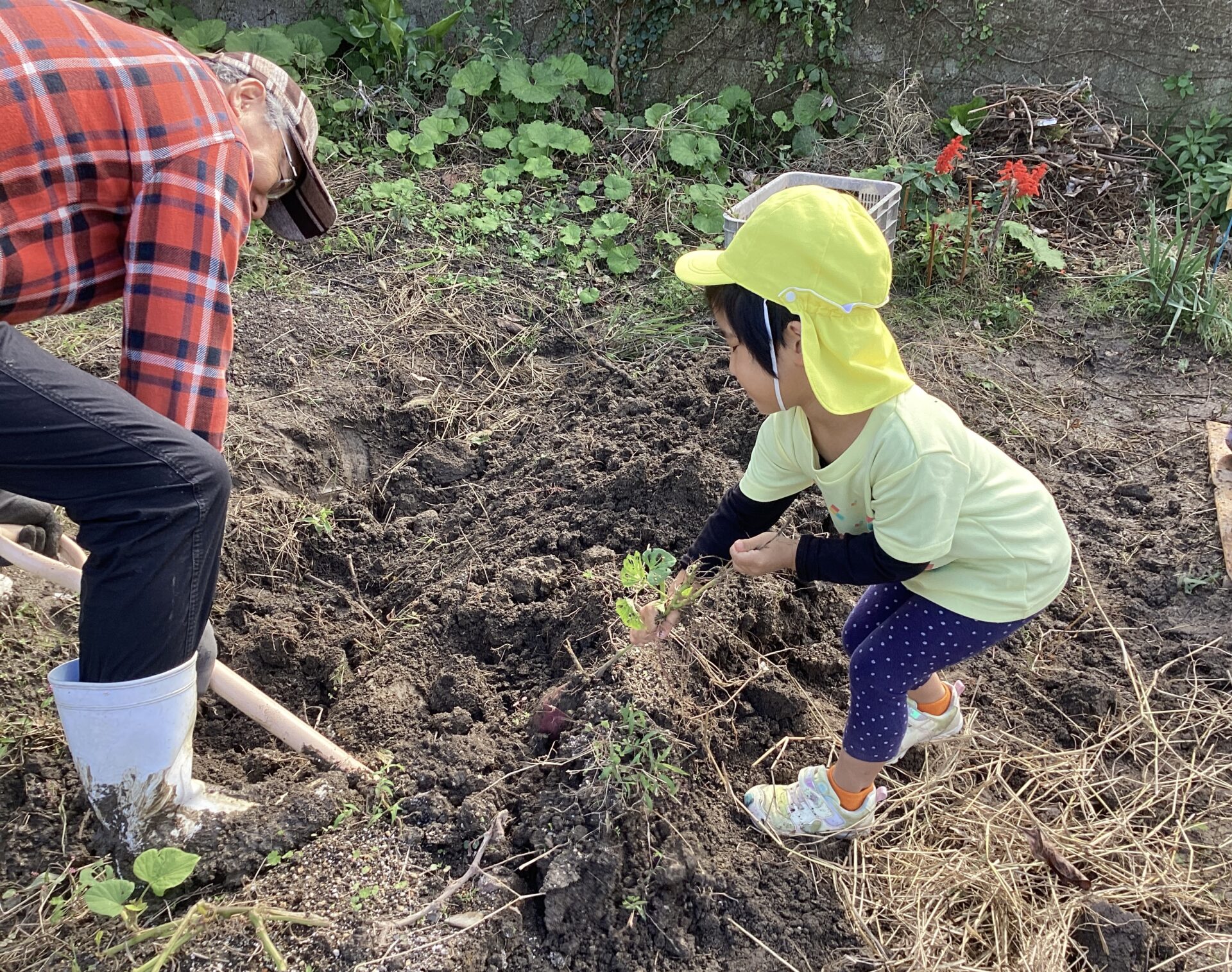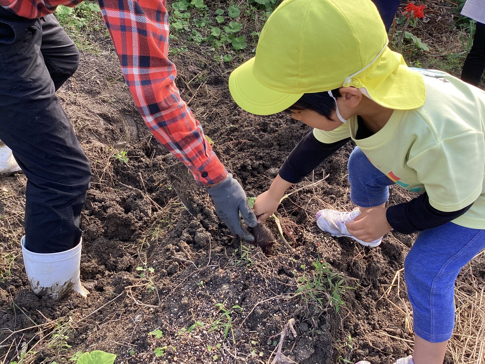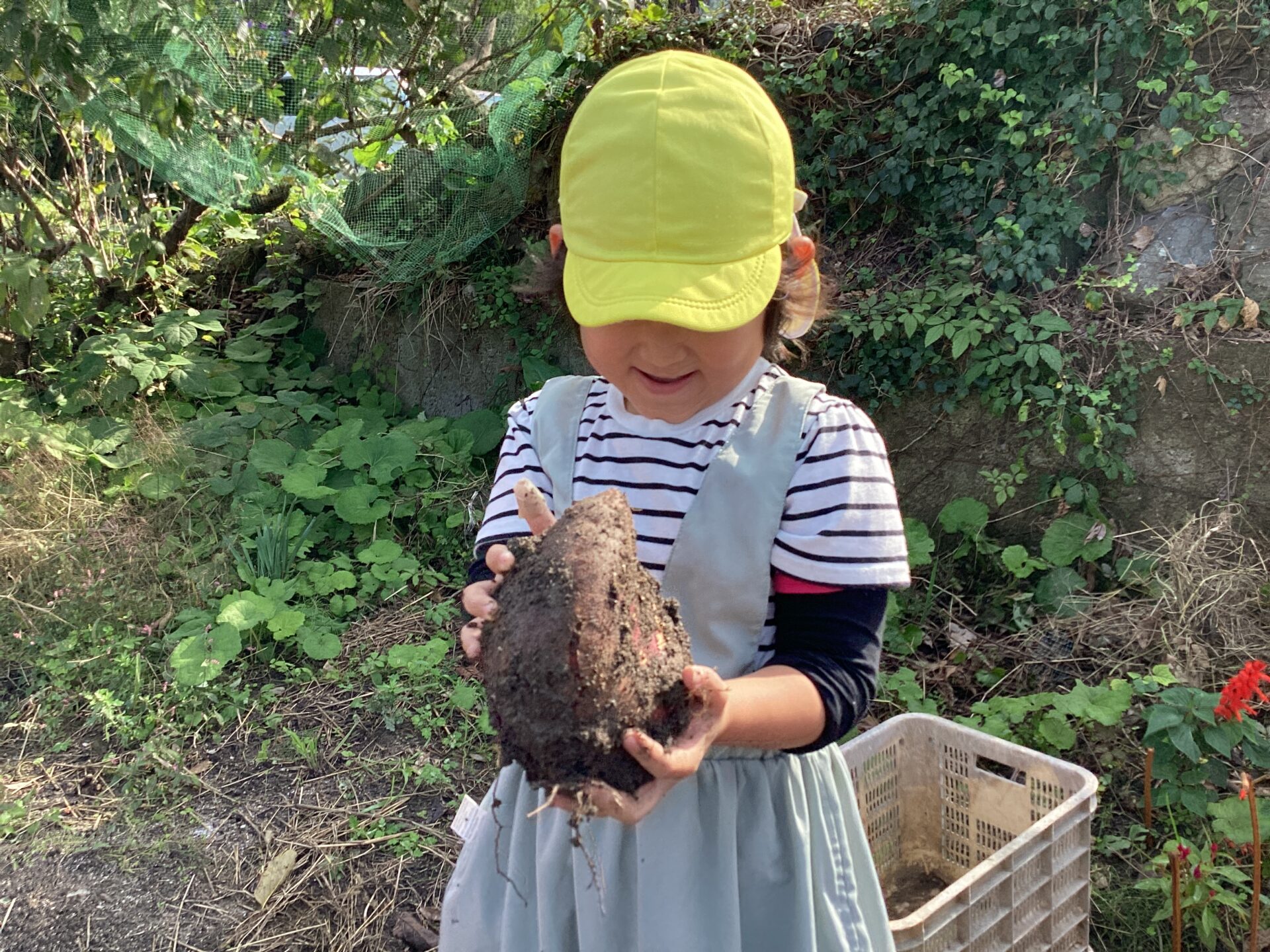 暑い中お世話をしてくださったスタッフの皆さんに感謝です。土が苦手な子どもさんもお芋を楽しみに、自然に触れる機会が一つ増えましたよ。(大きなミミズやカナブンの幼虫にも興味津々でした)