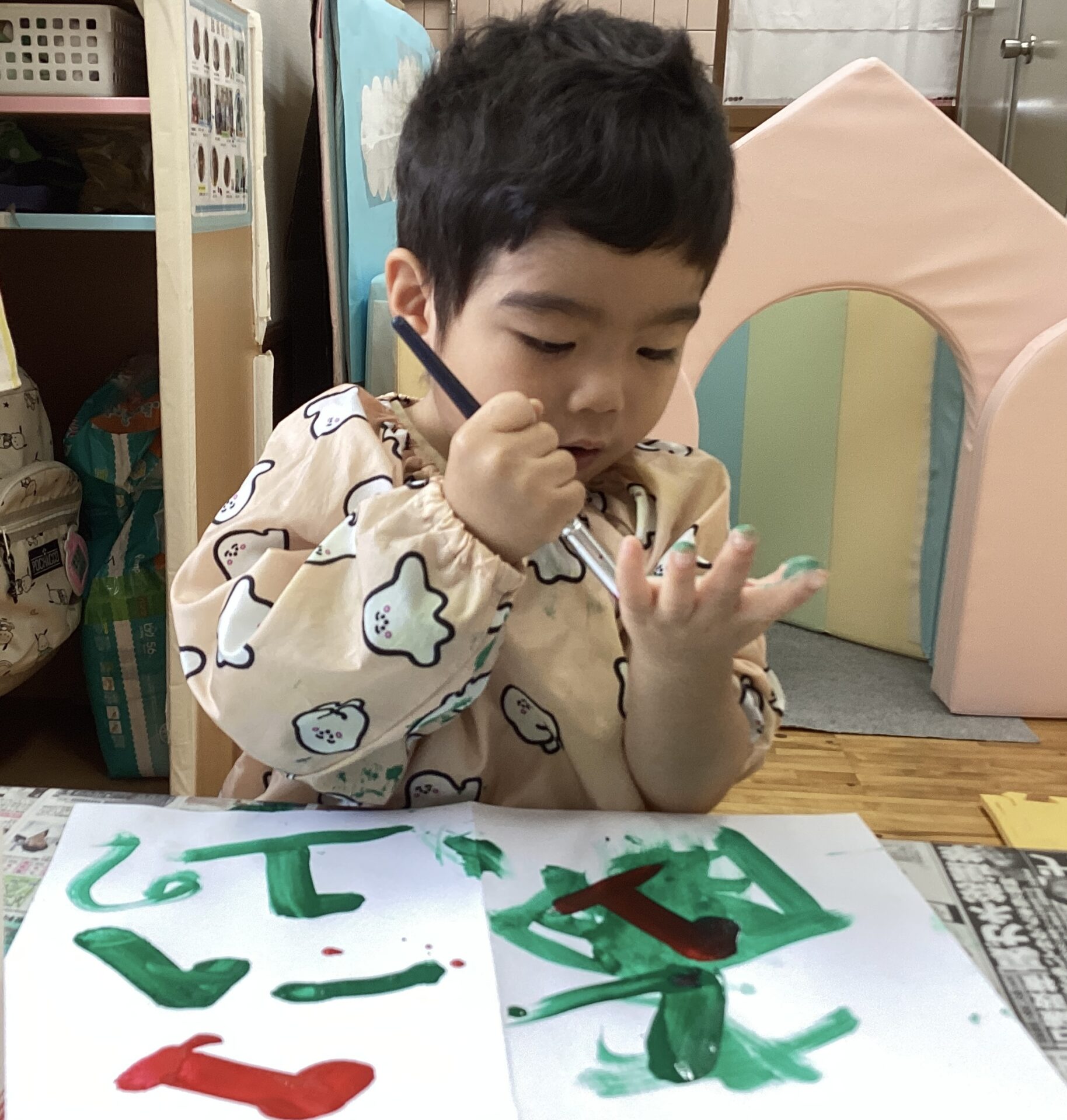 絵の具を見ると、早速手のひらに筆で色ぬりをして、画用紙に手形を押してニコニコ笑顔!以前の活動を思い出したのですね。経験が活かされています。