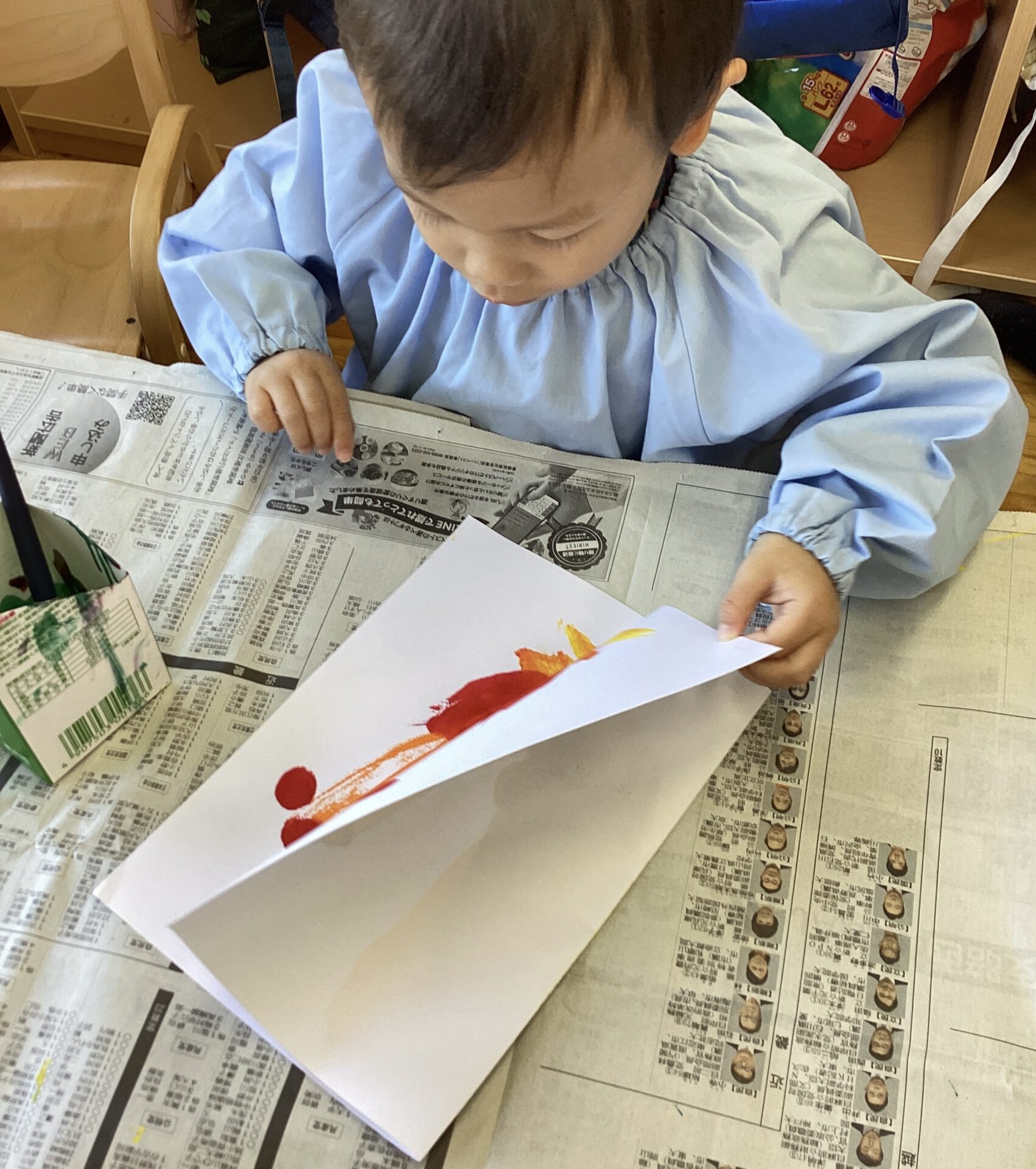 絵の具を楽しんだ後に、職員がモデルとして絵の具をつけて、筆に絵具を適量つけてお絵描きをする様子を見せて、筆の使い方をお知らせしました。デカルコマニーになるように、画用紙を半分に折るところまで見てもらいます。