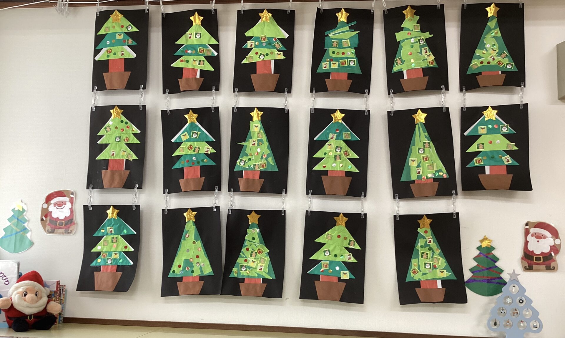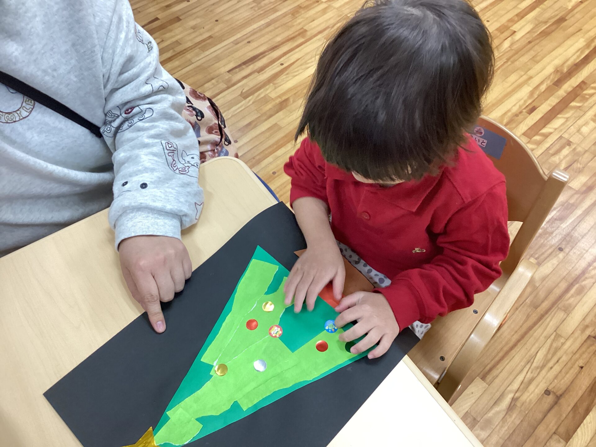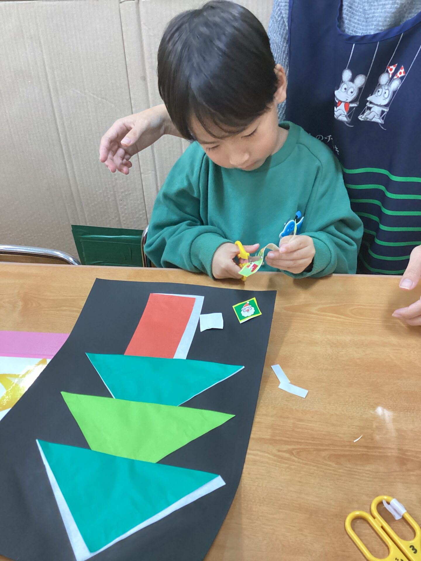 クリスマスの飾りをハサミで切ったりシールを貼り付けたりすると、かわいいツリーになりました🎄