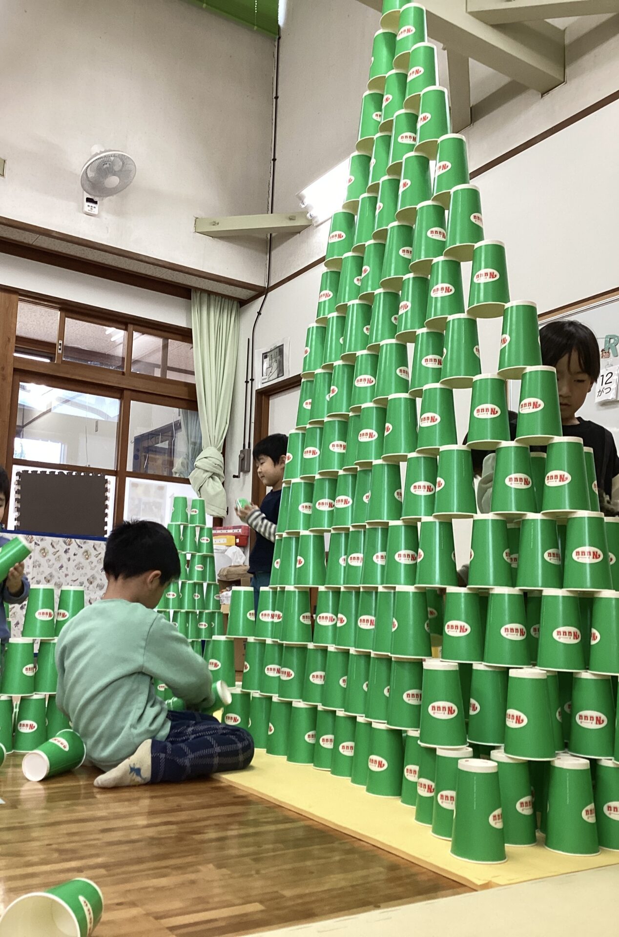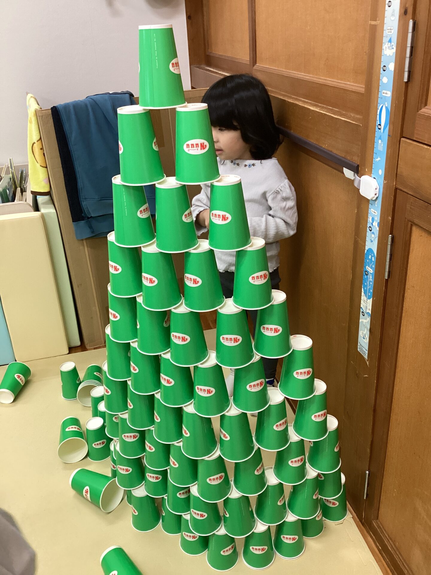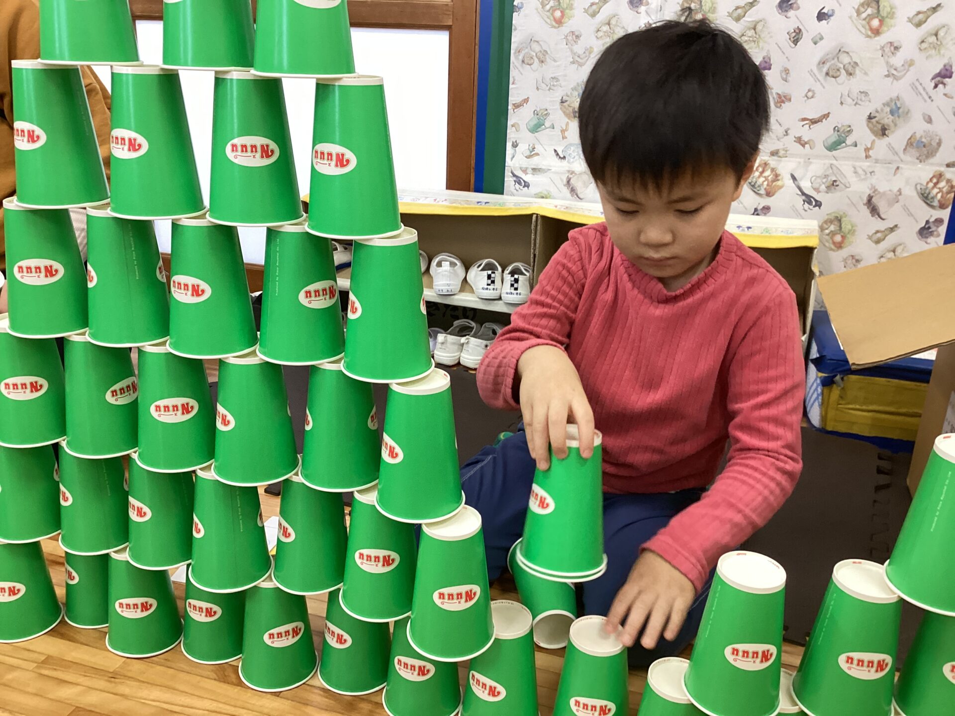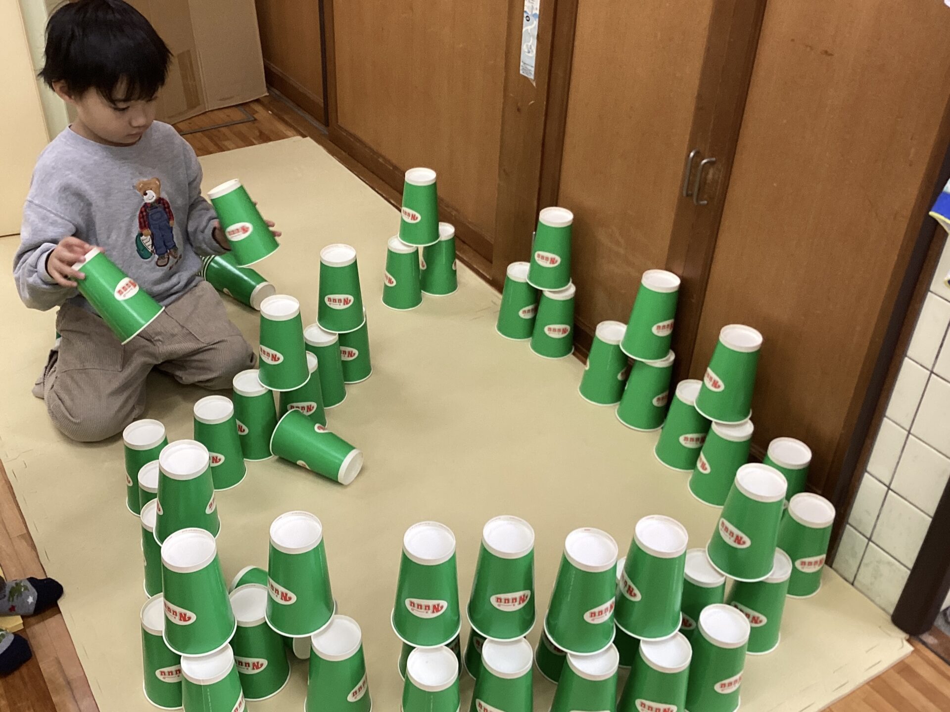 緑の紙コップをたくさん用意して、みんなでつみつみ遊びをしました。