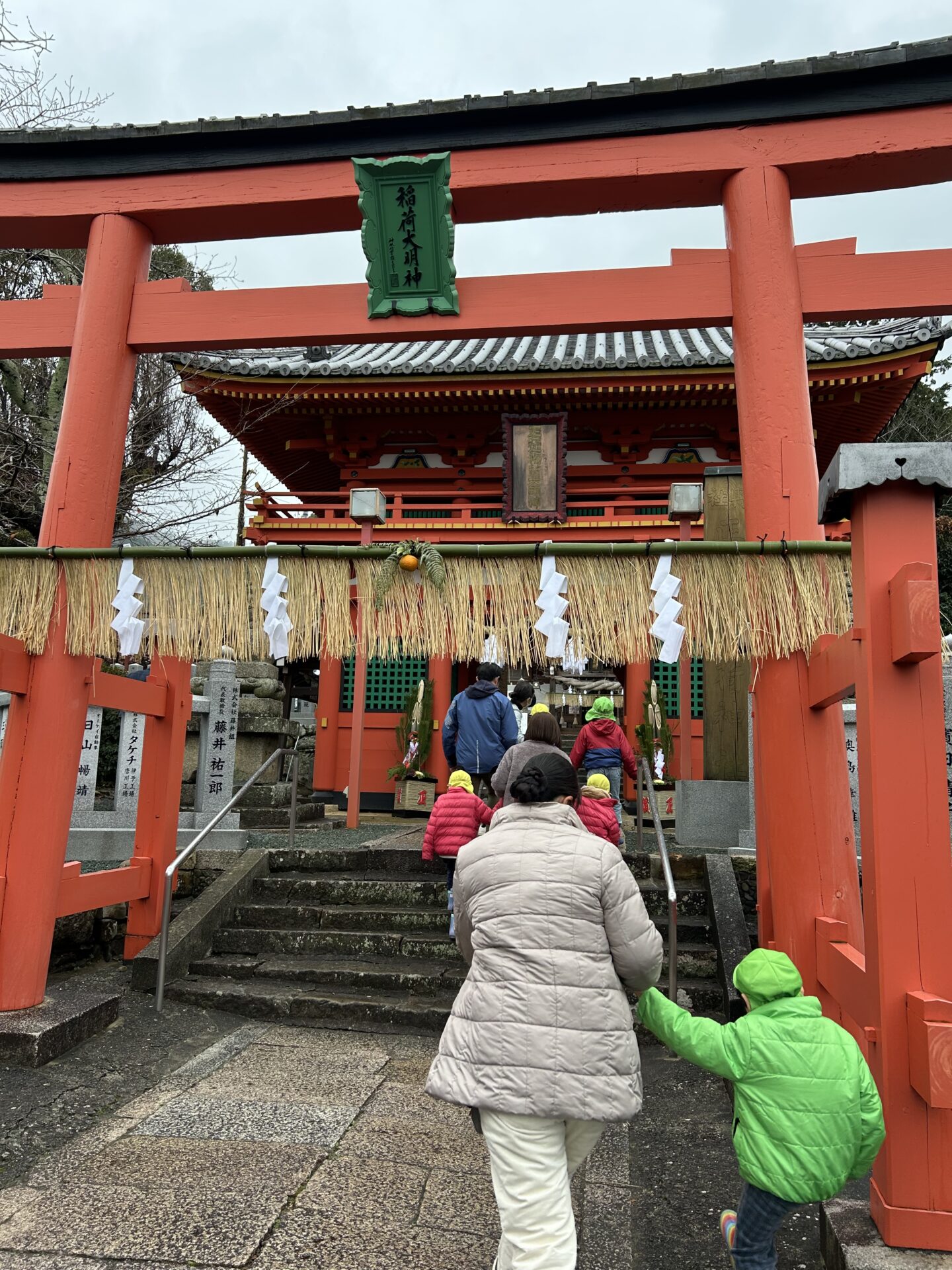 目指すは伊予稲荷神社です。道路沿いの大きな鳥居が目印になっています。「門松あるね」と早速発見したお子さんも。