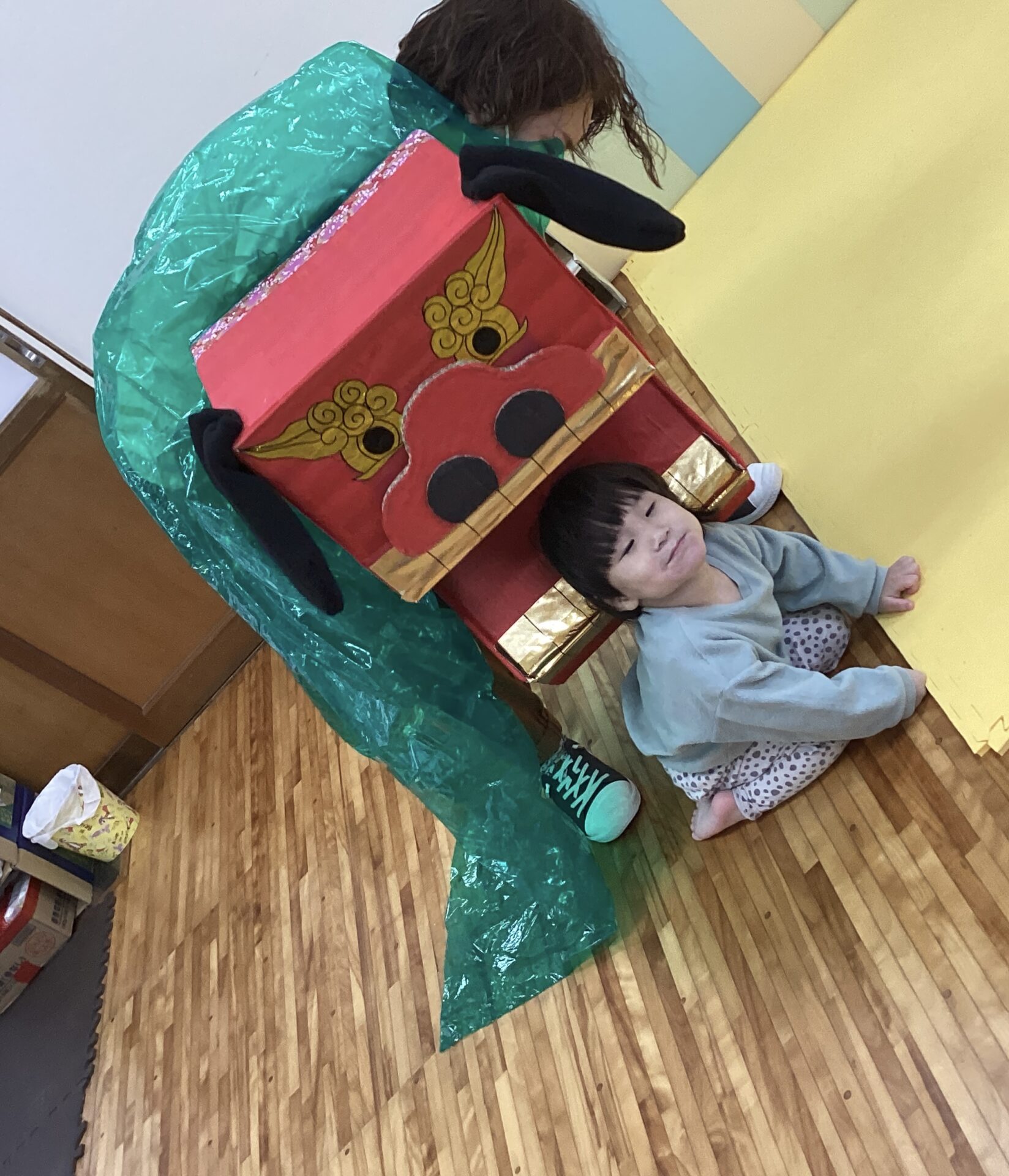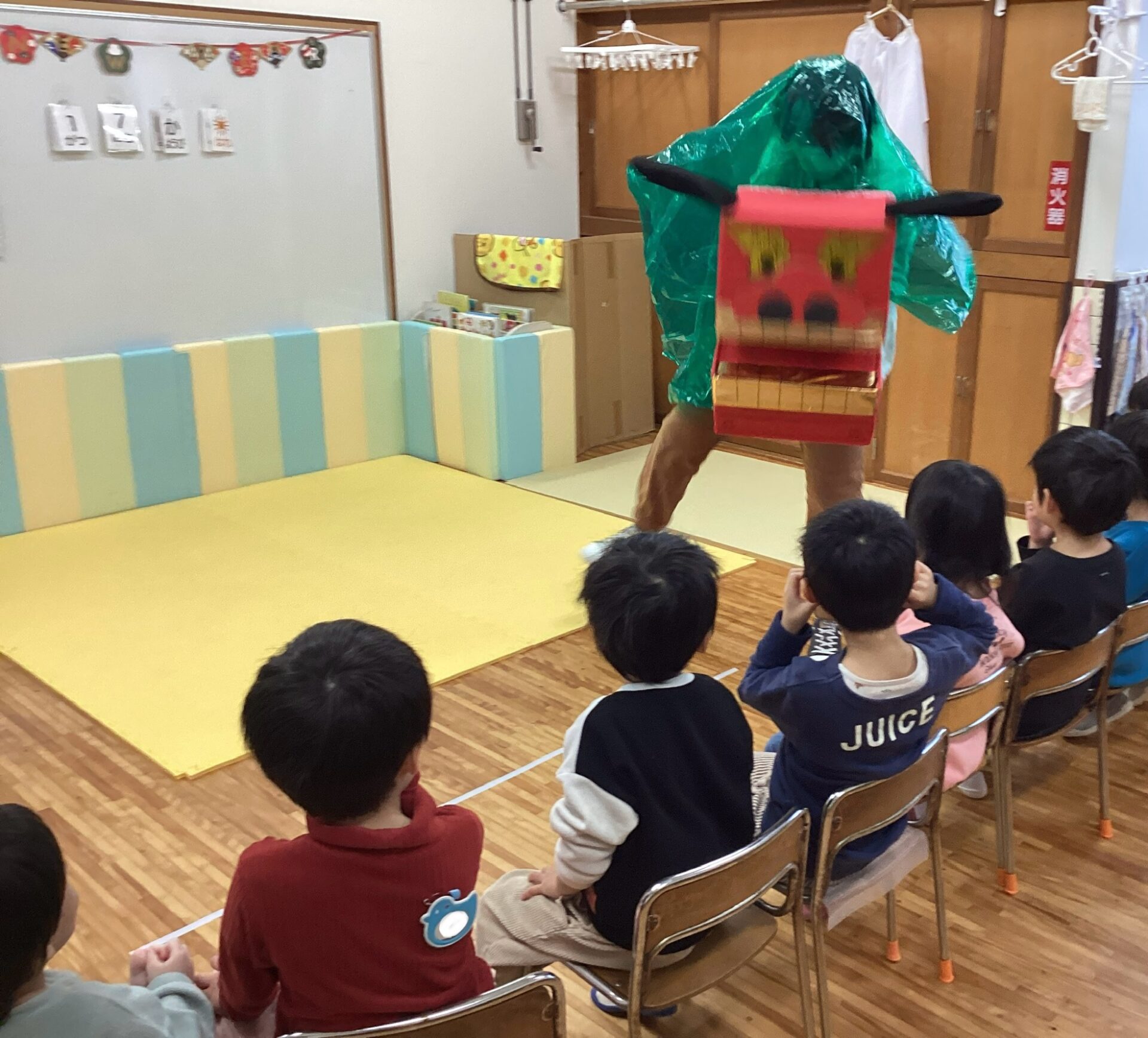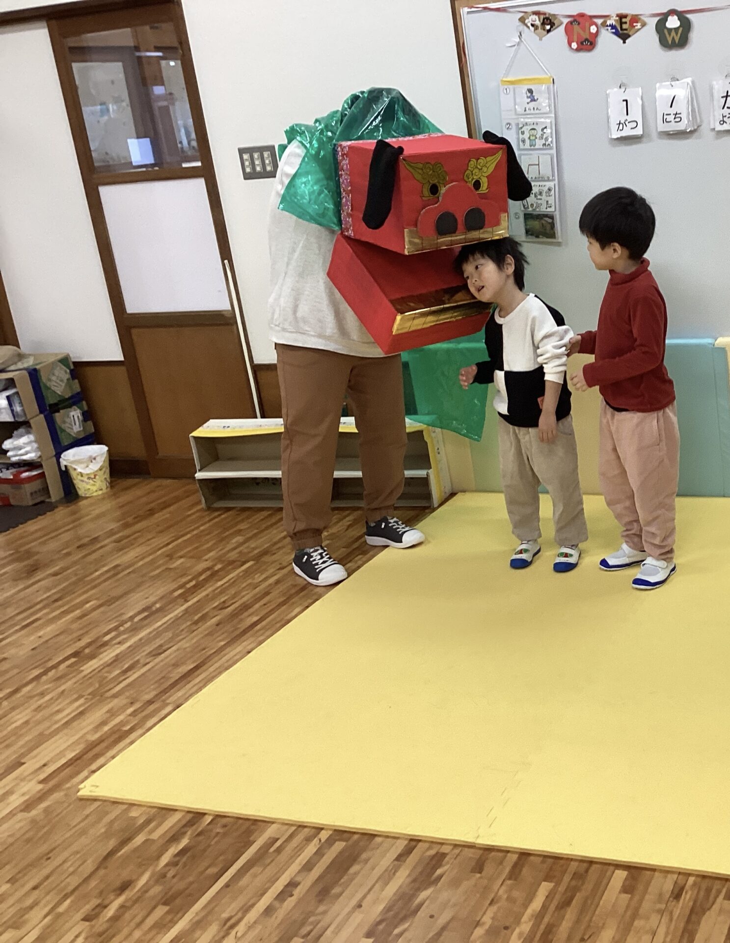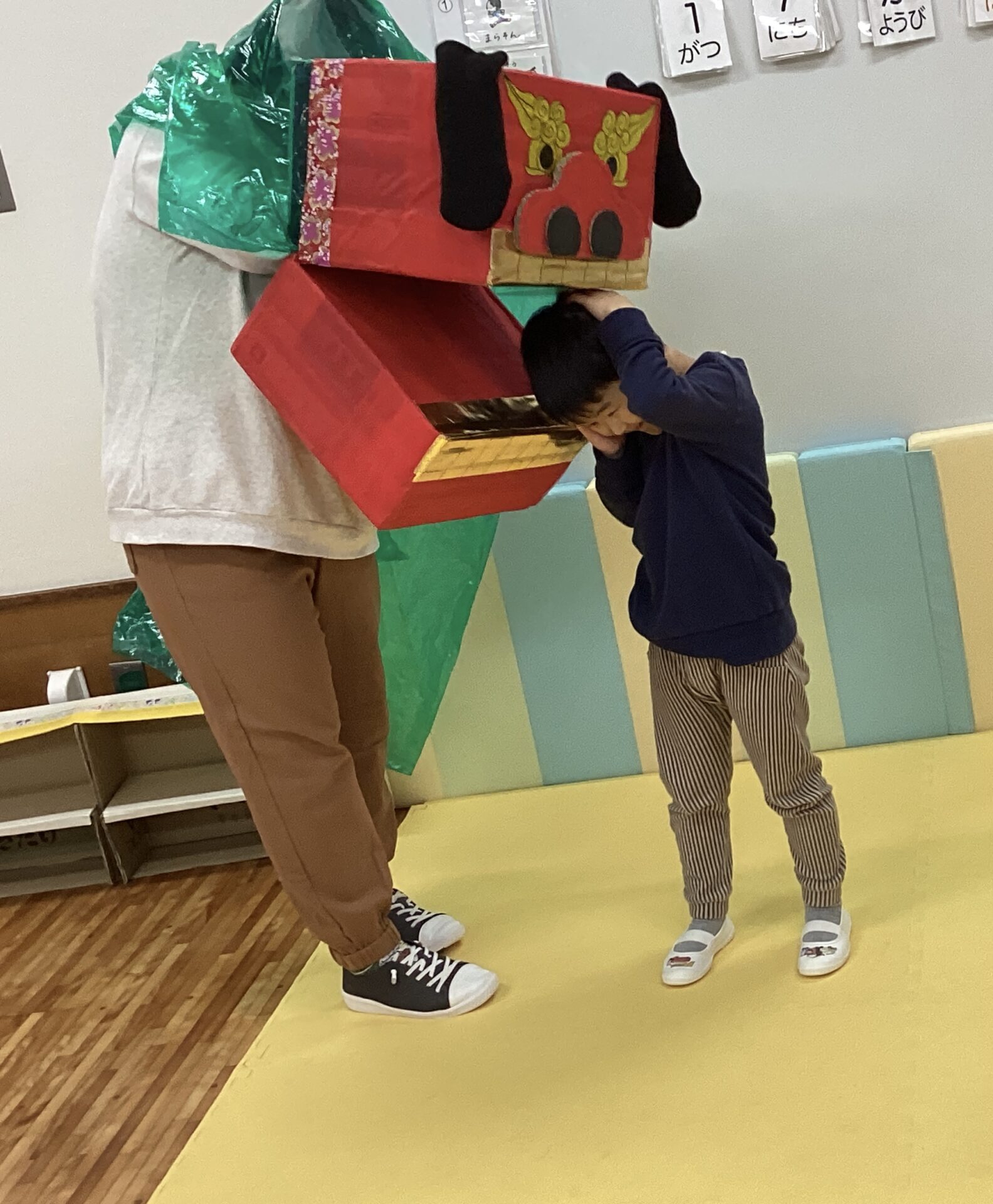 チャンチャチャンチャチャンチャチャンチャの音楽に合わせて獅子舞が遊びに来てくれました。