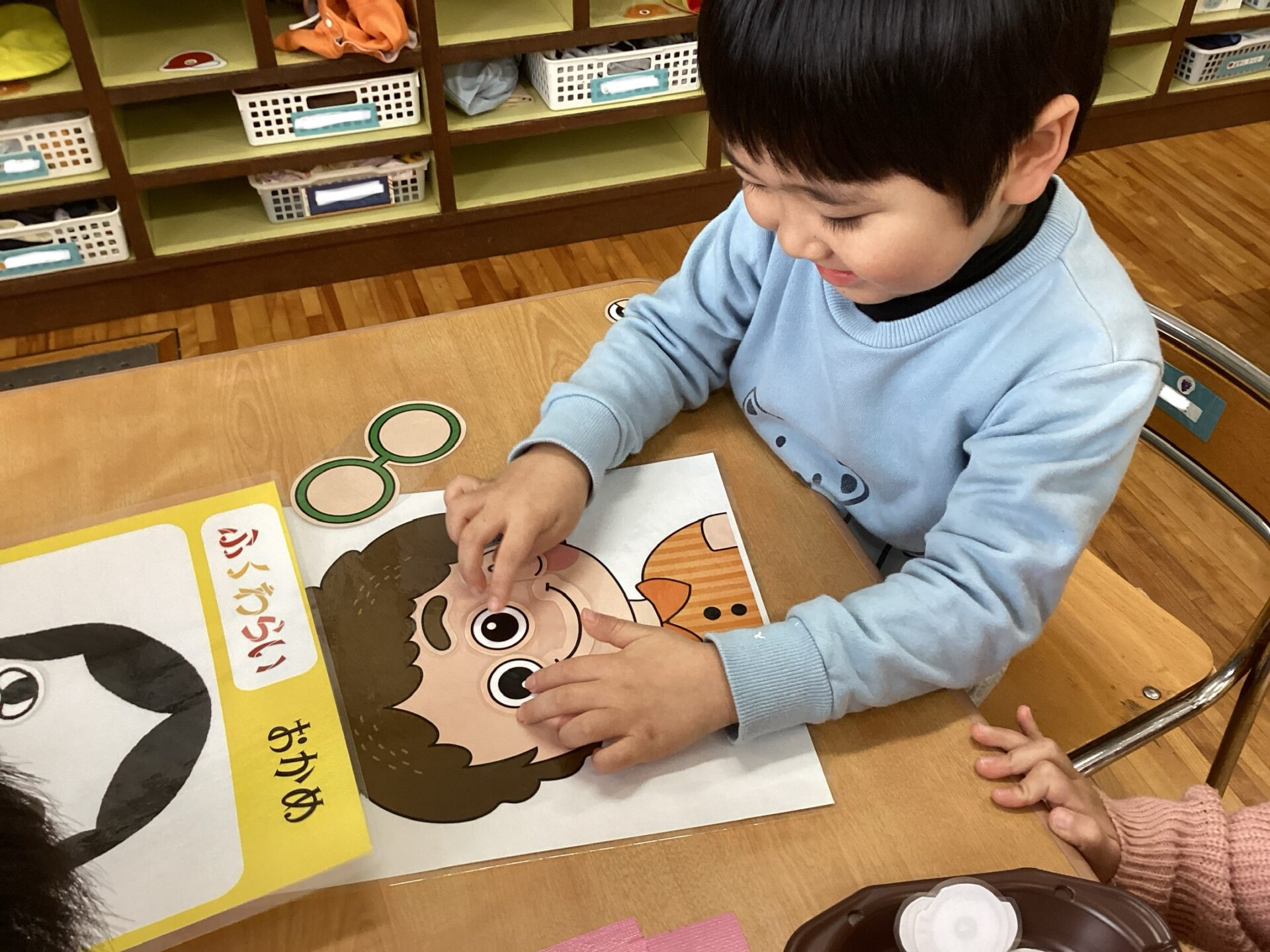 子どもたちと福笑いをして遊びました。