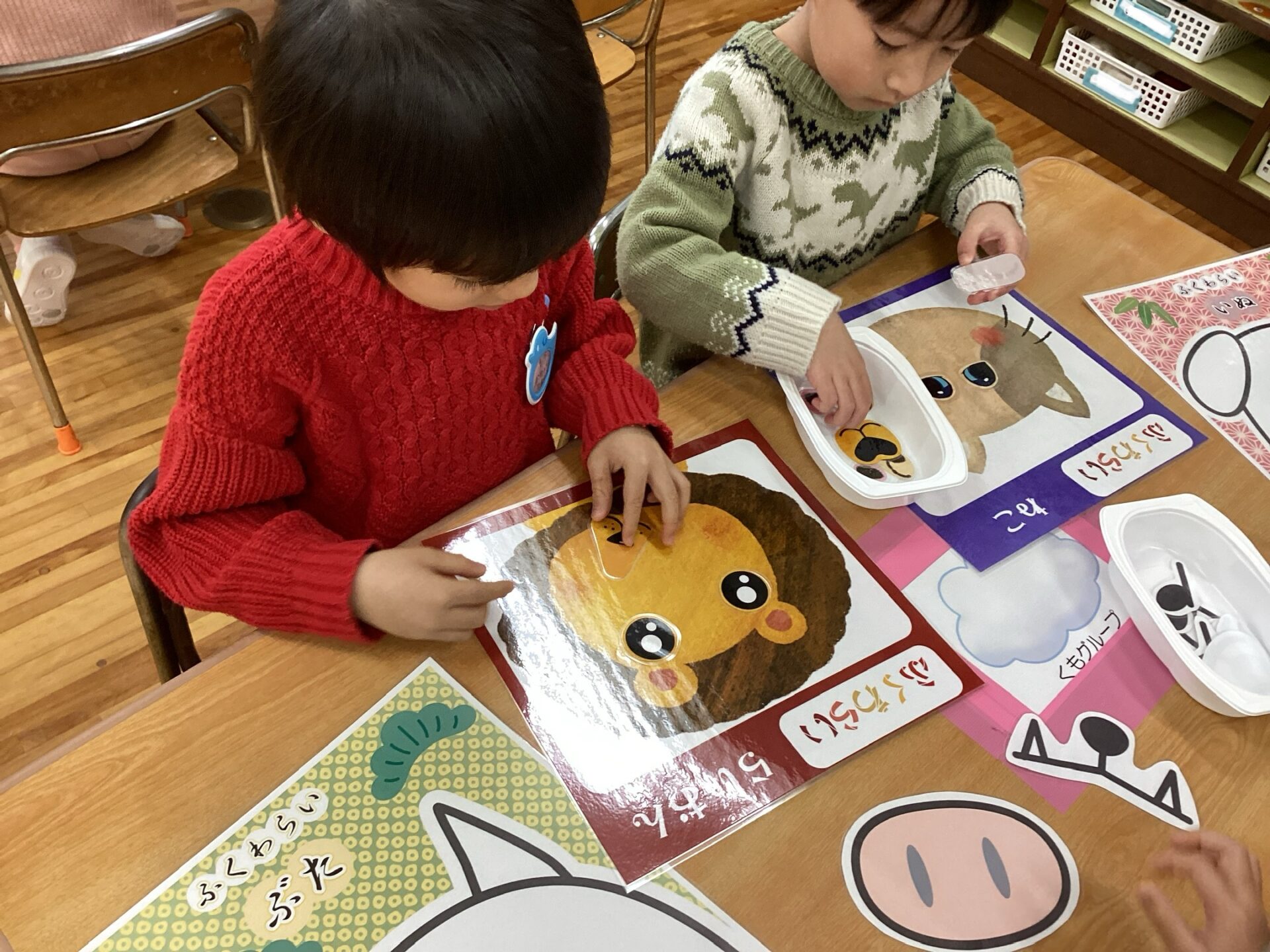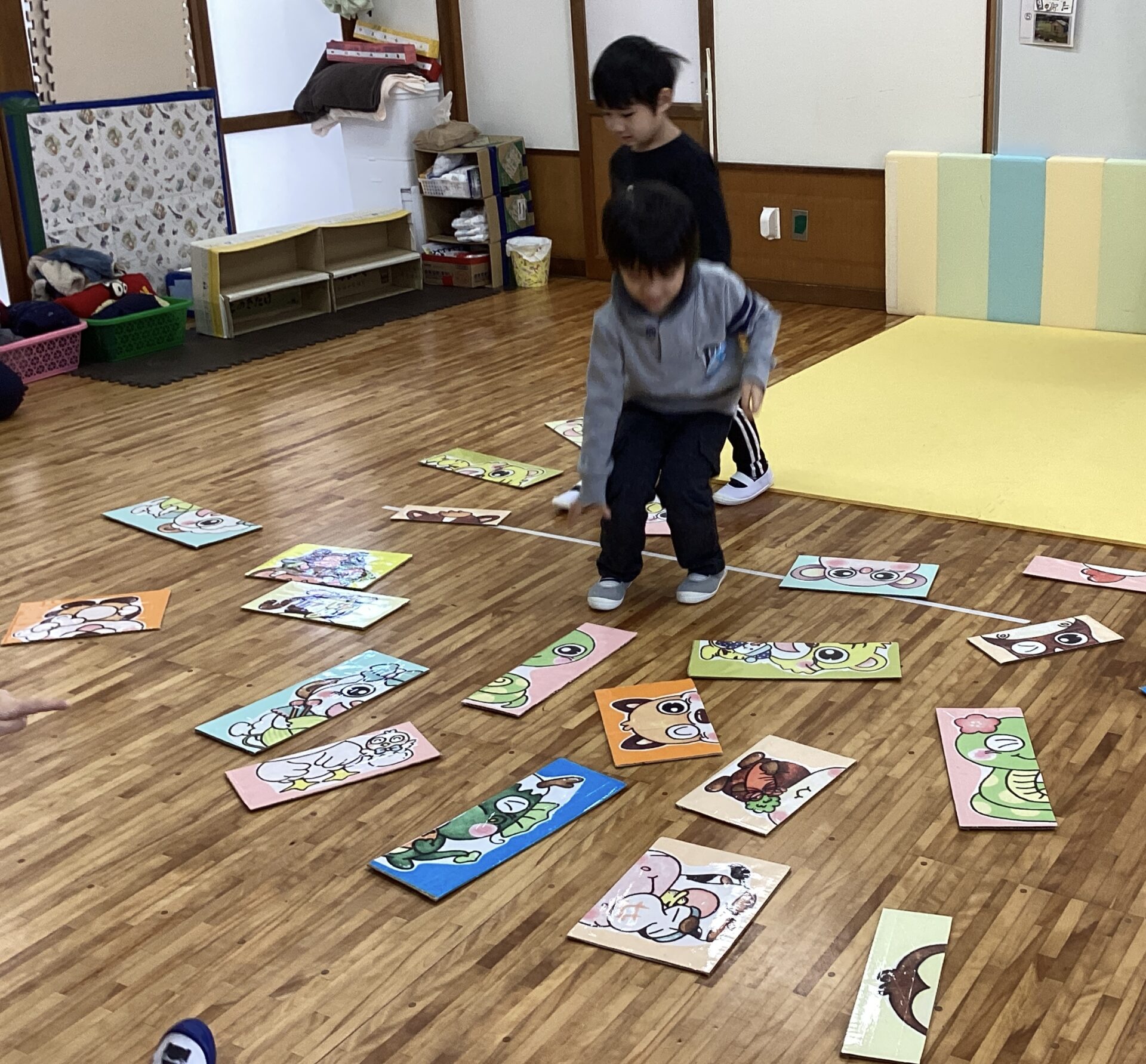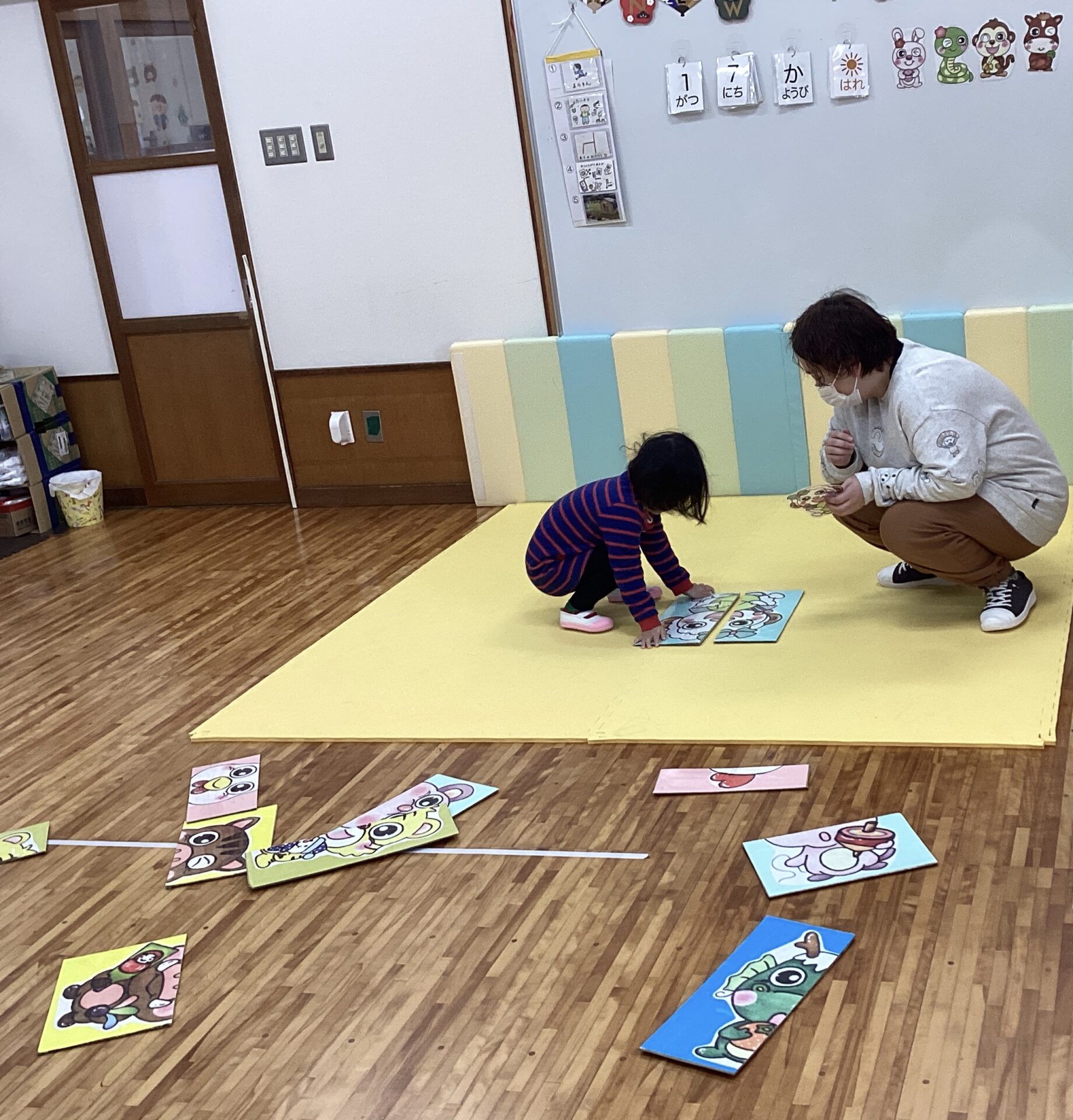 友だちと協力して、同じカードの絵を取り、みんなで合わて、干支のかるたを完成させることができていましたよ☺️