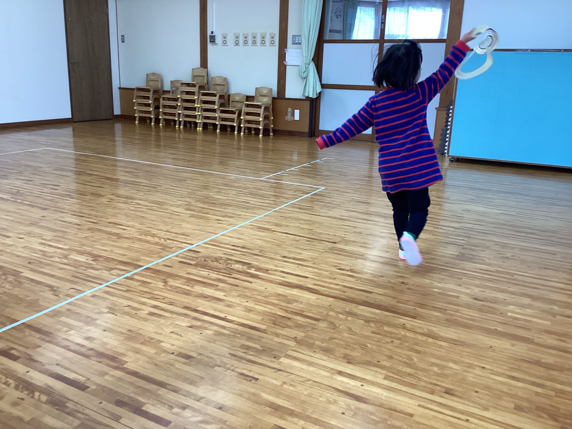 子どもたち走ってしまうと、夢中になって凧に注目が難しいので、事前に自分たちで左右に動かしてくるくる回ることがわかるように声をかけています。
